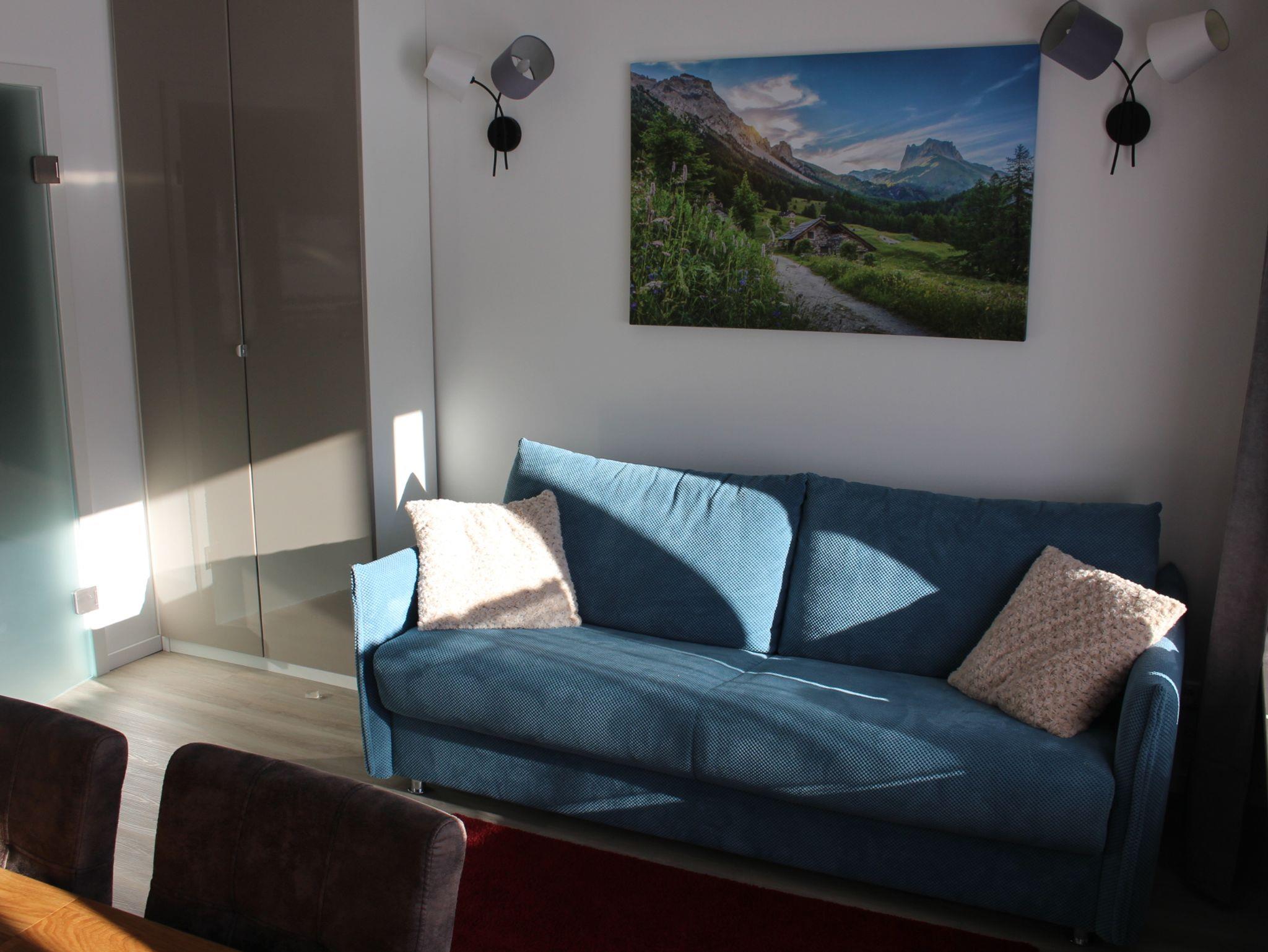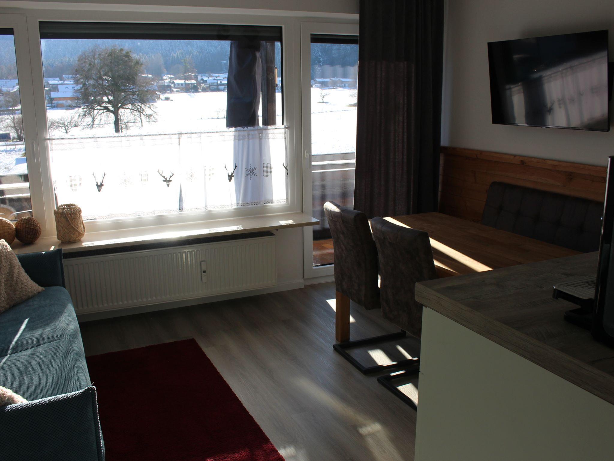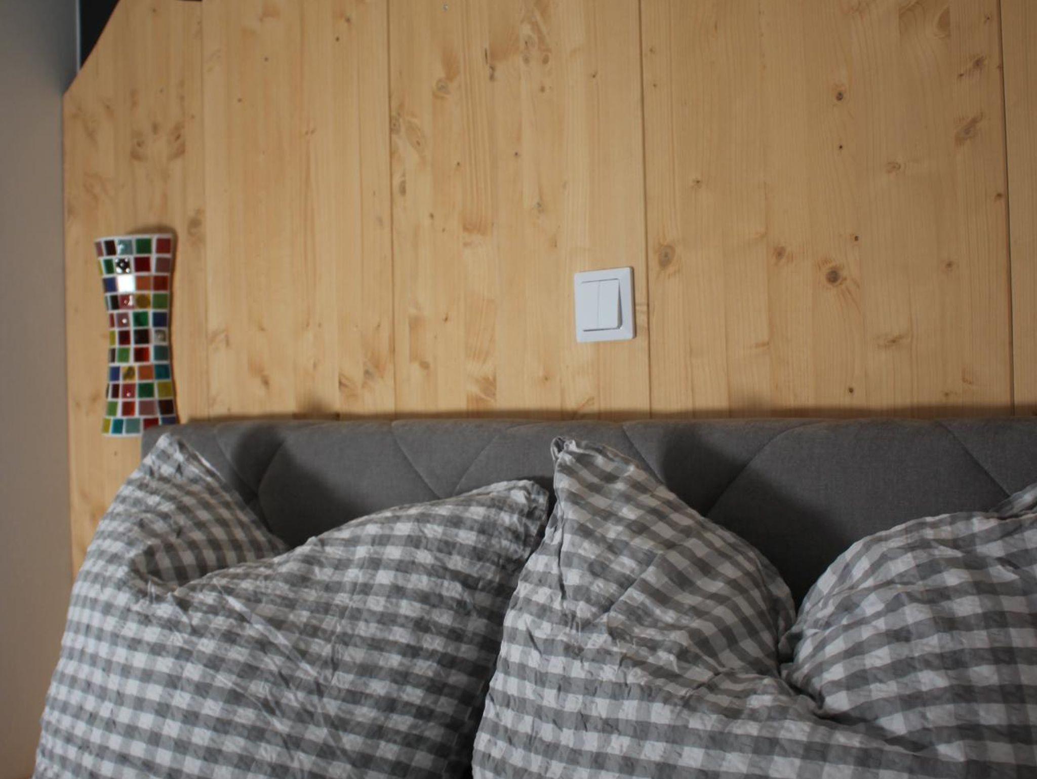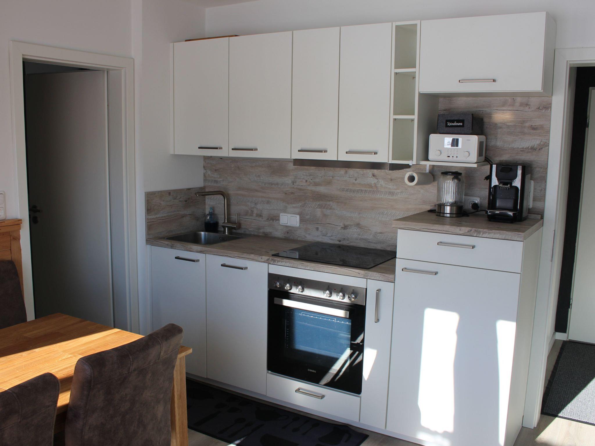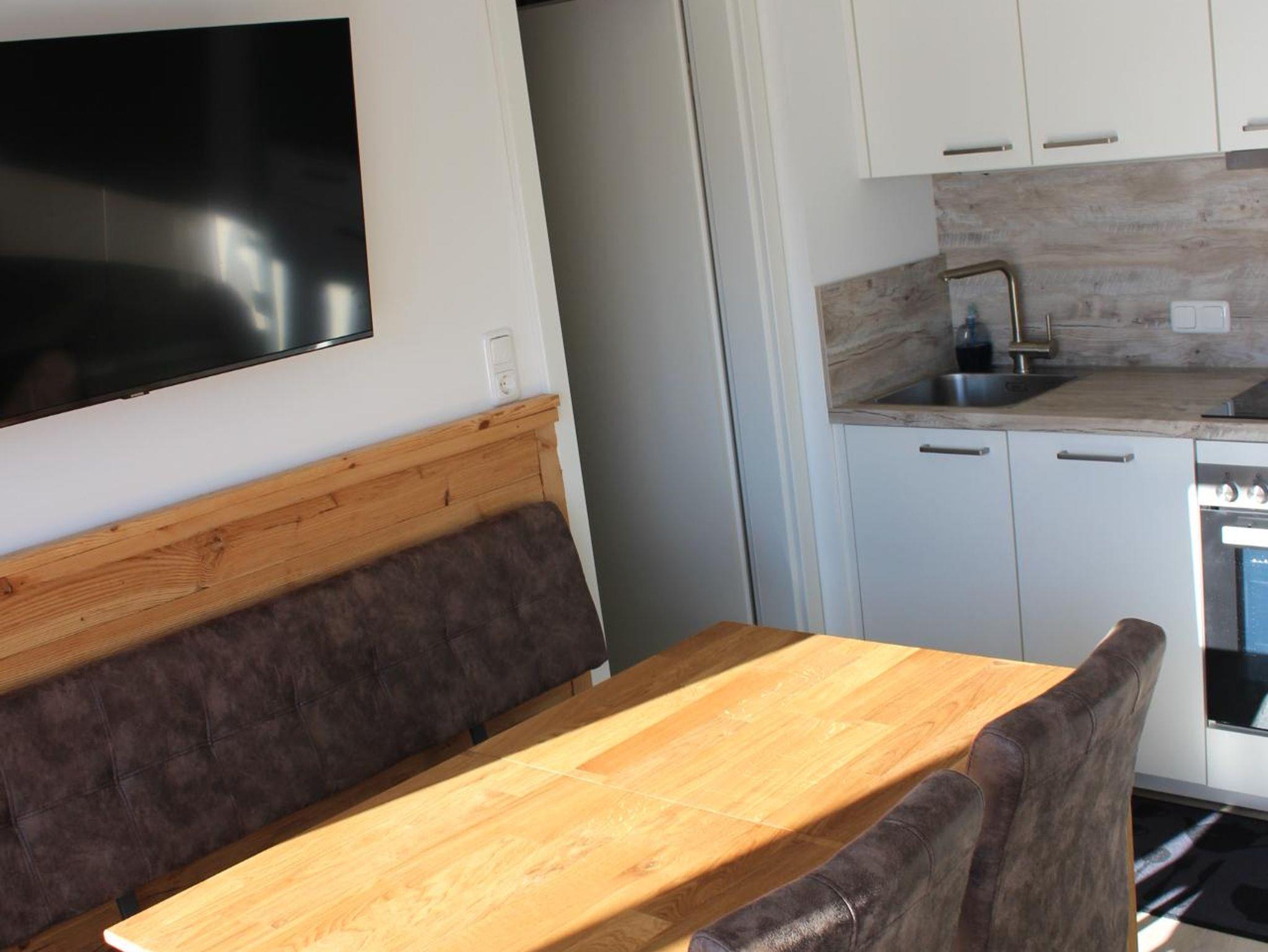 Die Ferienwohnung bietet ein abgetrenntes Schlafzimmer mit einem Boxspringbett (1,60x2m) und kleinem Schreibtisch. Vom Wohnzimmer mit Essecke, Küche und hochwertiger Couch kann man den Blick über den Balkon zu den nahegelegenen, idyllischen Berghängen schweifen lassen. Die moderne und neuwertige Einbauküche ist vollständig eingerichtet und verfügt unter anderem über einen Geschirrspüler, Backofen und eine Senseo Kaffemaschine.