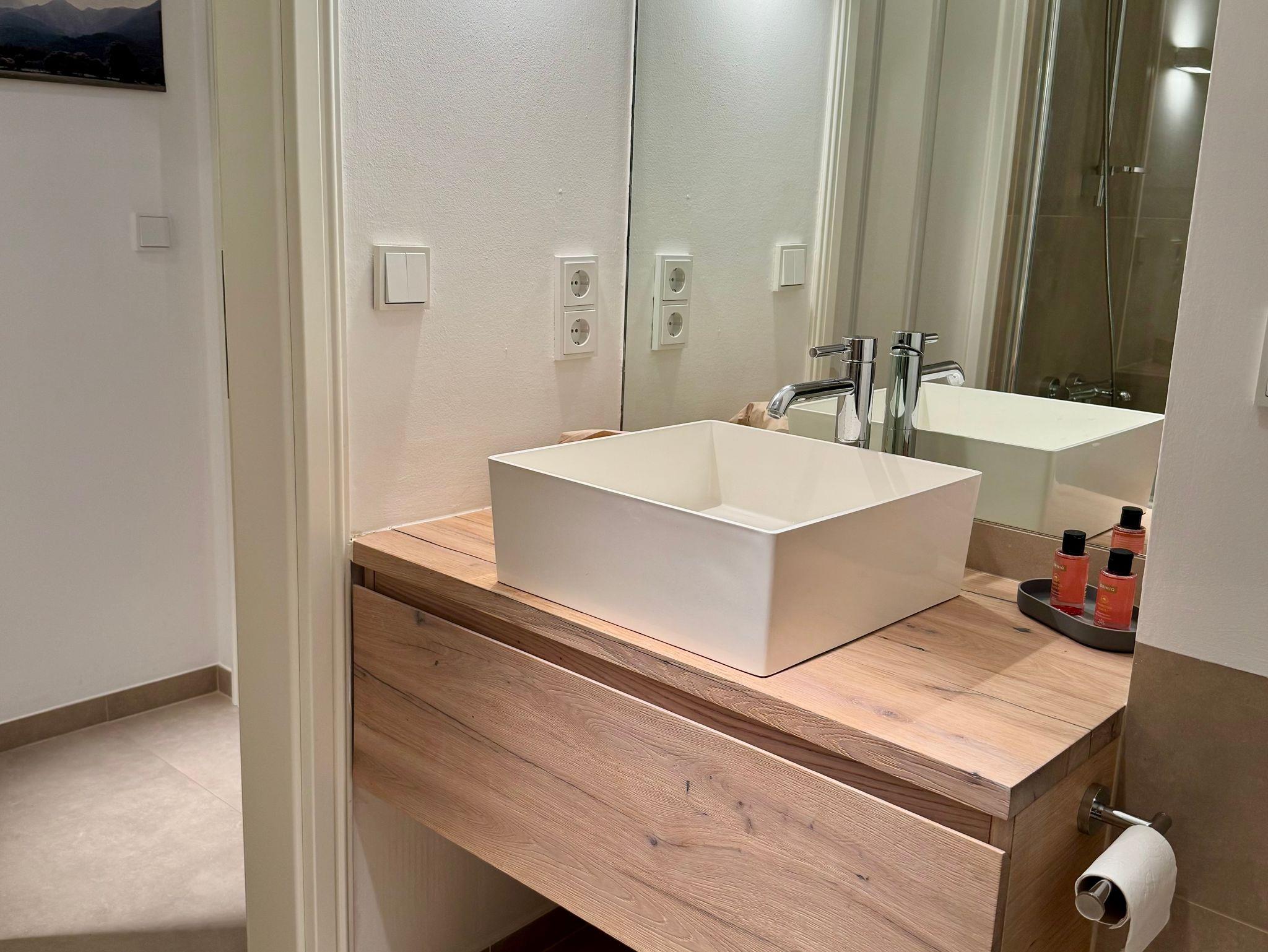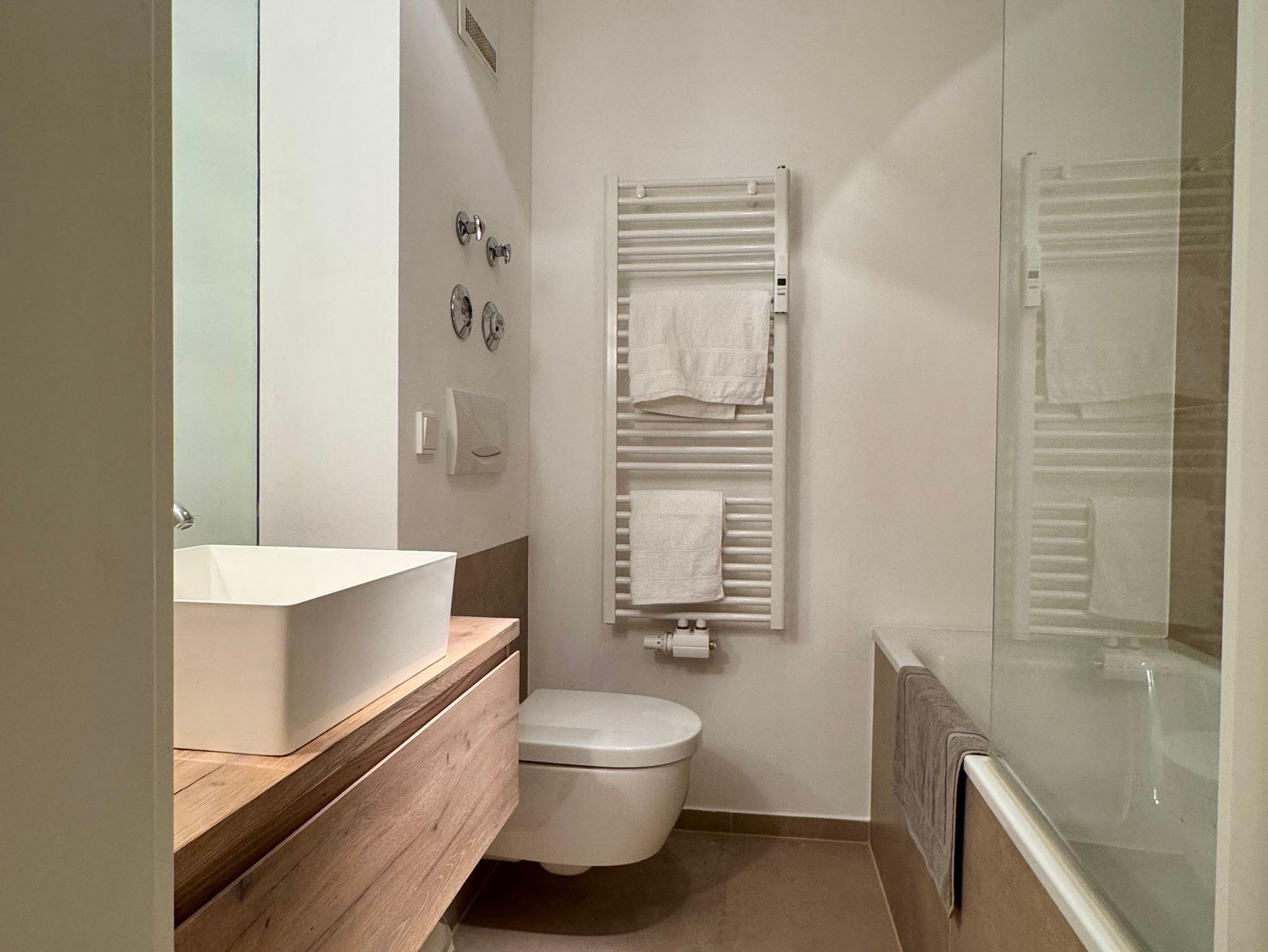 Das Badezimmer verfügt über eine Duschbadewanne. Im Waschbeckenunterschrank befinden sich zusätzliches Toilettenpapier sowie ein Haartrockner.