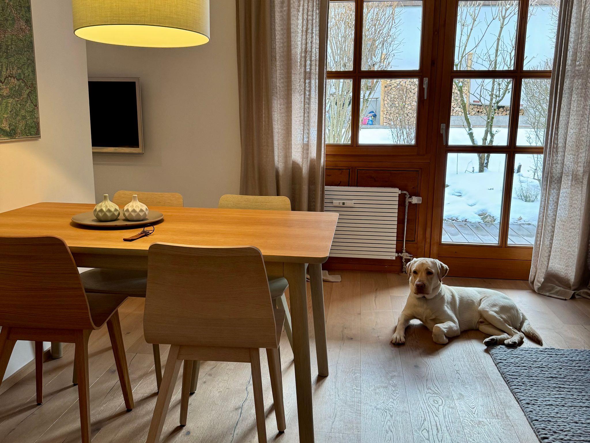 Im Wohn- und Esszimmer befindet sich ein Esstisch. Er bietet Platz für vier Personen. Bitte verwenden Sie die vorgesehenen Unterlagen für Getränke und Speisen. Der Holzofen im Wohnzimmer darf NUR in Rücksprache mit den Gastgebern in Betrieb genommen werden.