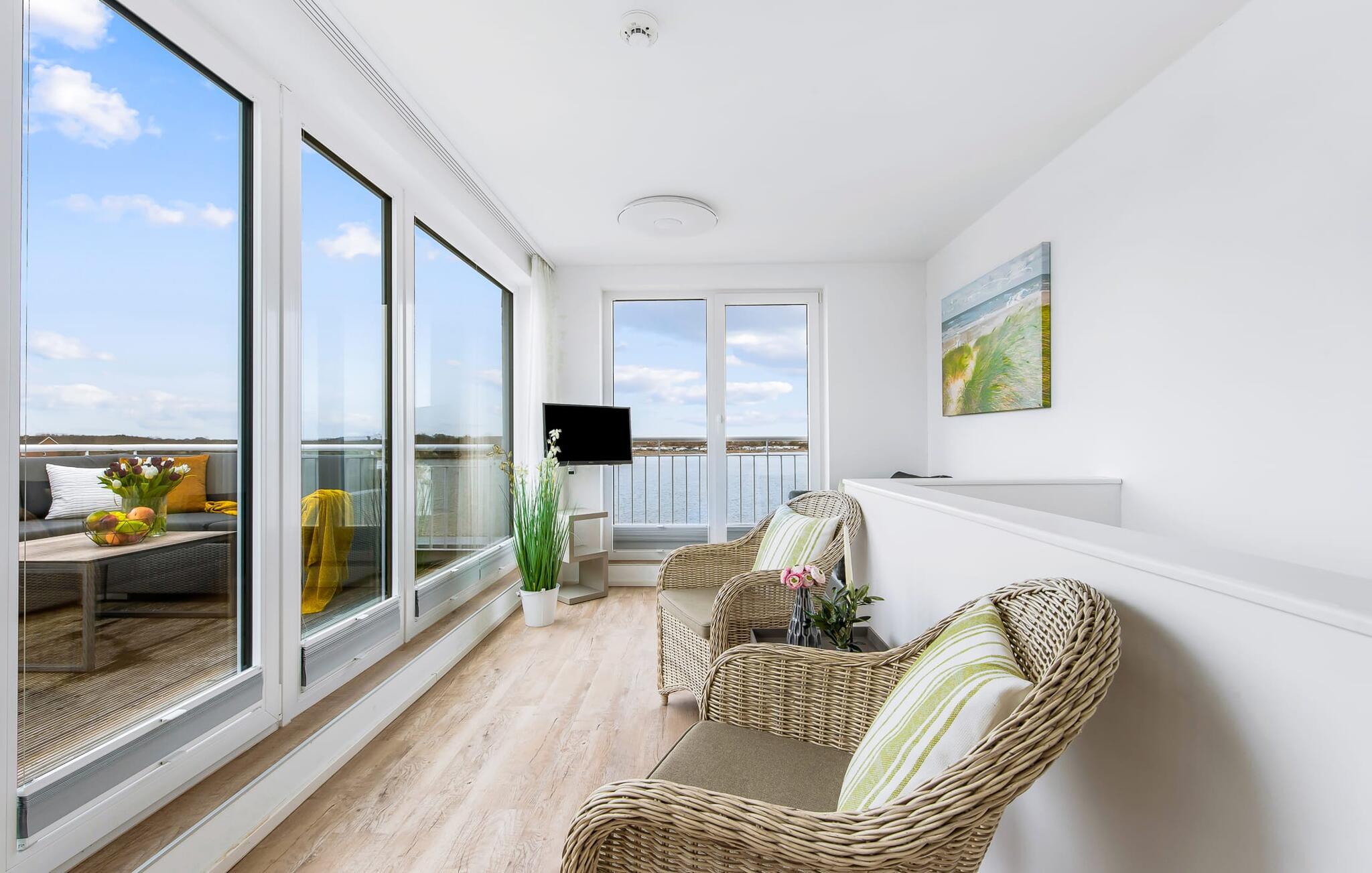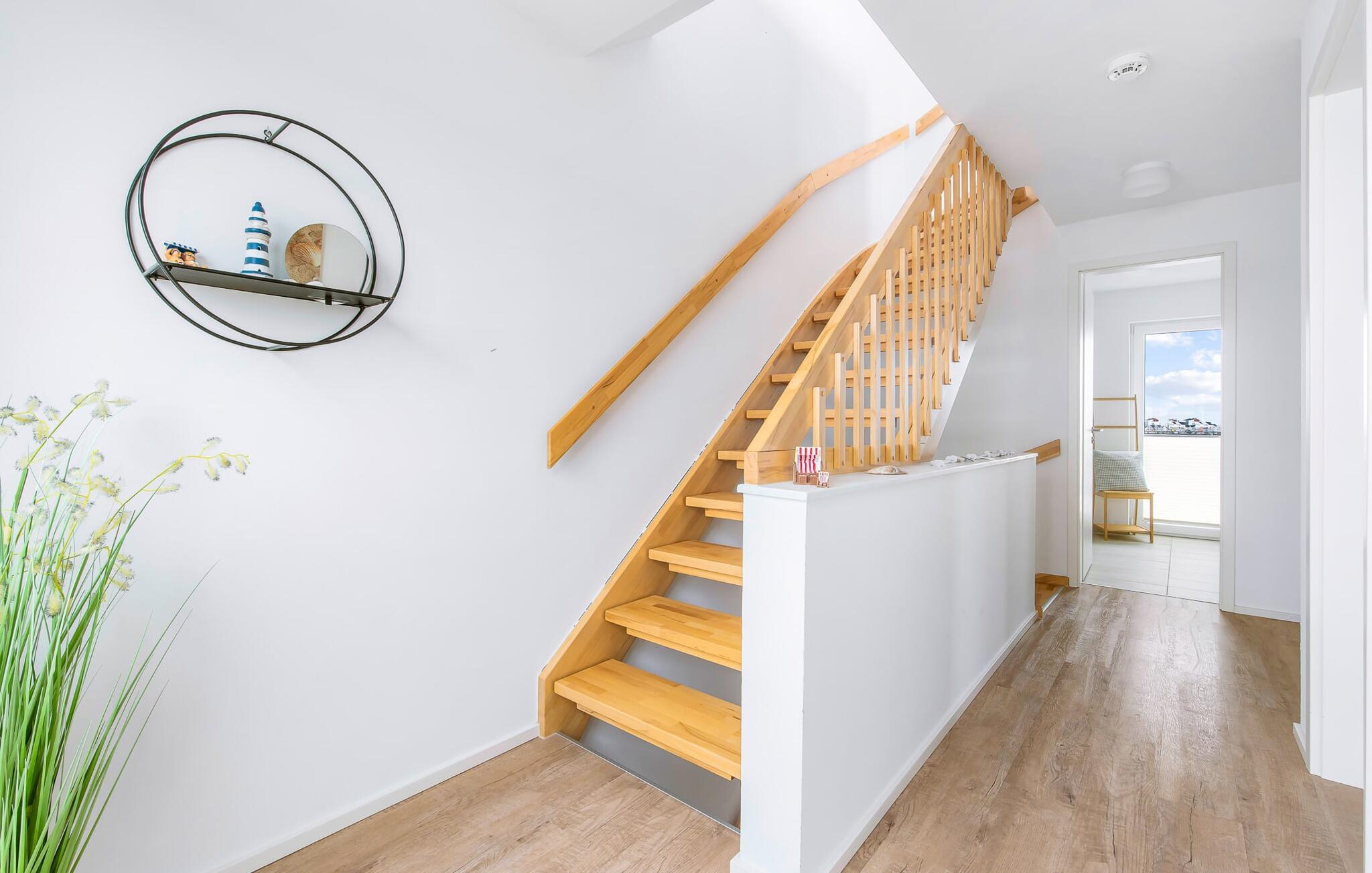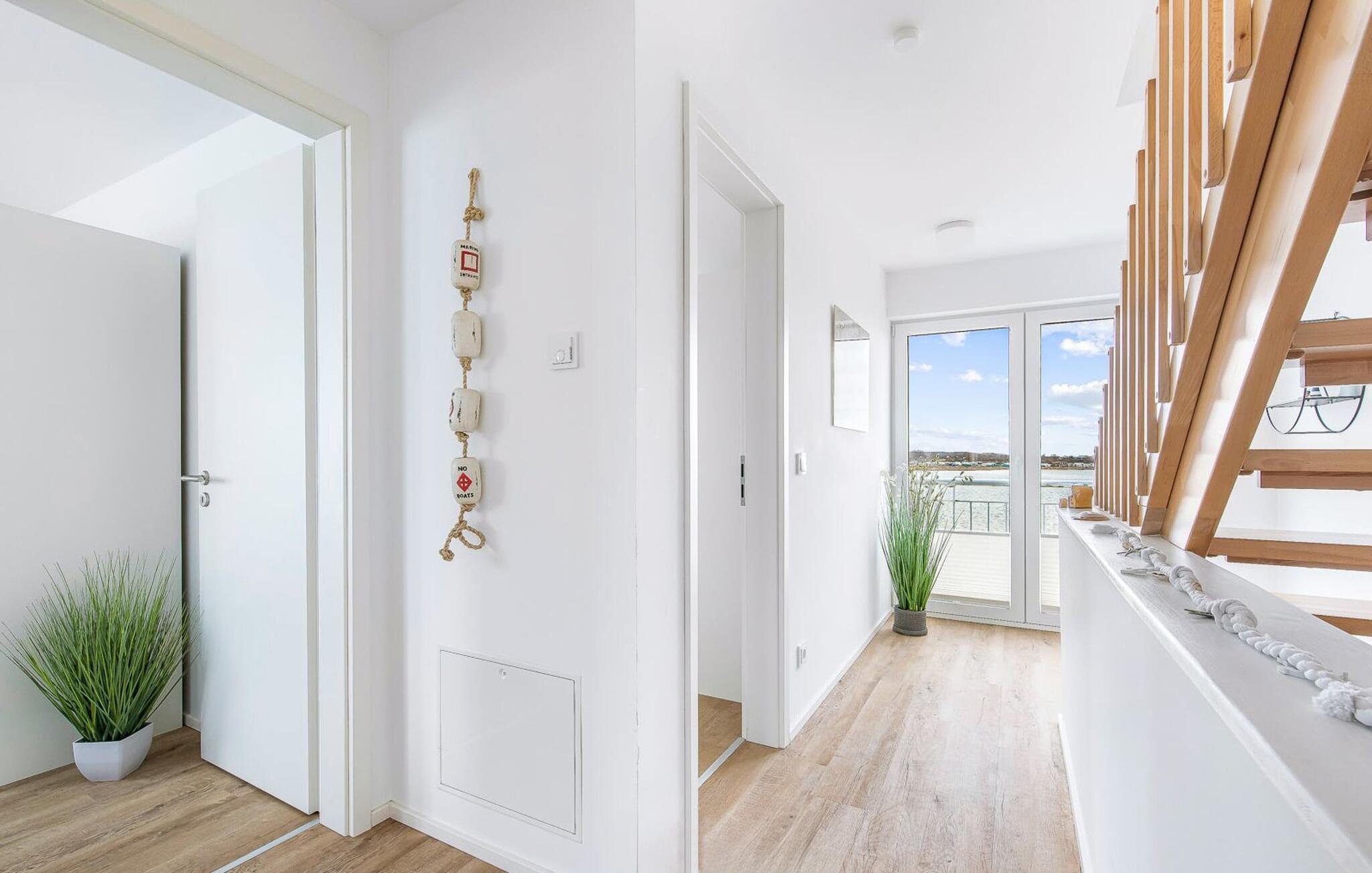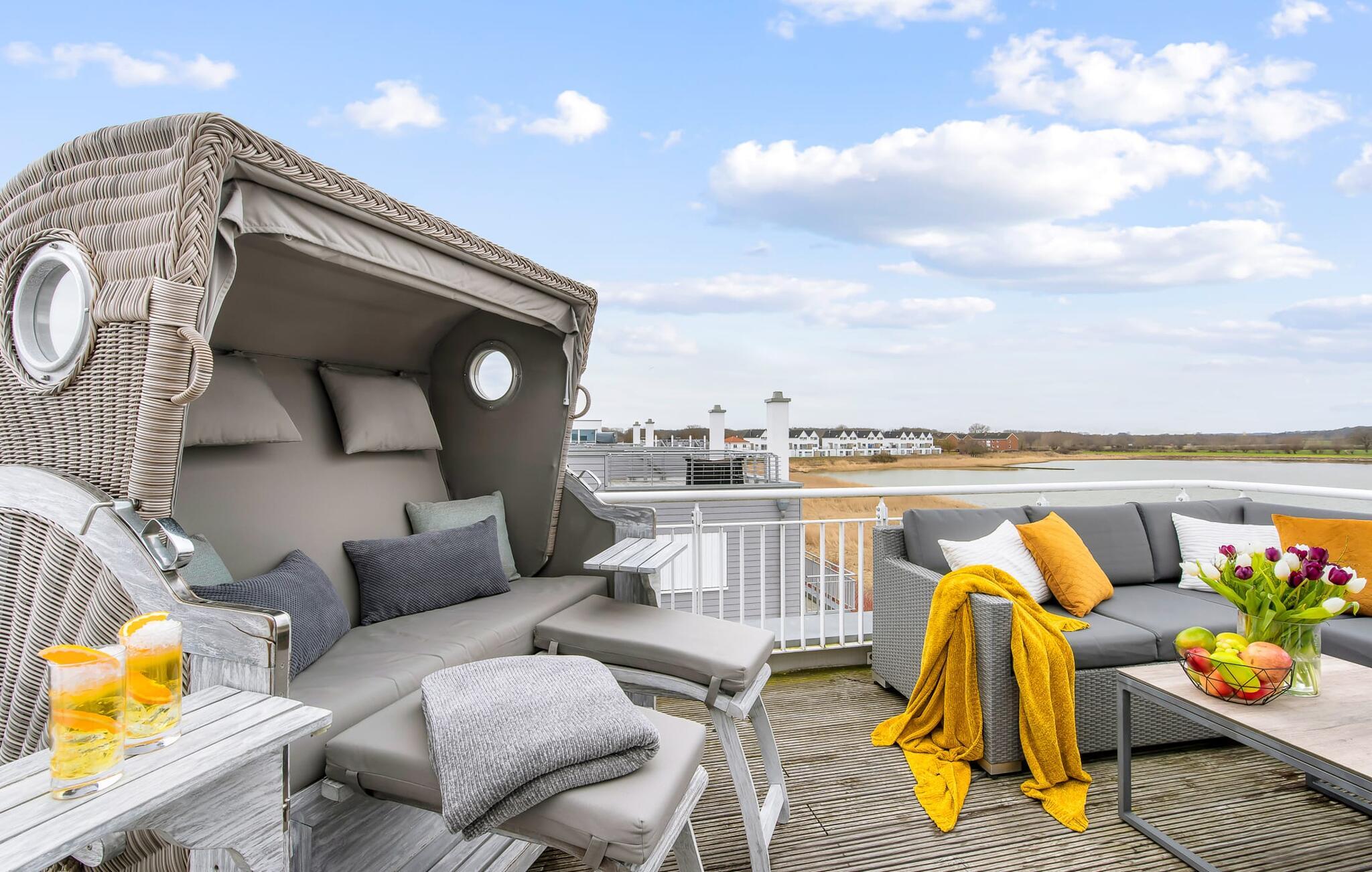 Feriehuset Schleijuwel har en enestående beliggenhed på et smalt næs mellem naturreservatet ved østersøfjorden Slien og sejl- og sportsbådshavnen i ferieområdet Olpenitz. Højdepunktet ved ferieejendommen er studiet på anden sal, for her kan I slappe af i den store finske sauna eller nyde den fantastiske udsigt over Sleien og lystbådehavnen på tagterrassen. Feriehuset Schleijuwel strækker sig over tre etager. Stue/spisestuen i stueetagen af feriehuset er oversvømmet med lys. En stor vinduesfront giver udsigt til den idylliske Sliens bredder fra den tilstødende terrasse. Det, der sker foran døren, er et sandt naturskue: Østersøbrisen svajer blidt sivene på kysten frem og tilbage, mens ænder og svaner muntert starter dagen. Med en kop kaffe på terrassen giver sejlskibe, der passerer forbi, det perfekte panorama. Takket være den sydvestlige orientering er ikke kun masser af solskin, men også fantastiske solnedgange garanteret. Uanset om det er til en hyggelig grillaften eller slapper af med en bog, får den betagende natur lige foran huset feriehjerter til at banke hurtigere. Den stue/spisestue er meget komfortabel. På det komfortable siddeområde eller ved det store spisebord, med en knitrende pejs og gulvvarme overalt, sørger det store fladskærms-tv og Play Station 4 for underholdning på grå dage. Køkkenet er omfattende udstyret og tilbyder fuld feriekomfort. Afslapningsområdet er på første sal. Her giver to soveværelser plads nok til at genoplade jeres batterier. I master bedroom med direkte udsigt over Sleien kan I vågne op og falde i søvn foran en drømmekulisse. Et andet soveværelse giver udsigt over gaden til ferieområdets sejl- og sportsbådshavn. Også på dette niveau er der et komplet badeværelse med bruser og afslappende spabad til det private wellness-program. På anden sal imponerer sommerhuset Schleijuwel med et ekstra opholdsområde og en stor tilstødende tagterrasse. En stor finsk sauna med tilhørende bruser perfektionerer ferieoplevelsen. Heroppefra er den uhindrede udsigt over Sleien og sejl- og sportsbådshavnen i feriestedet Østersøen så smuk, at I ikke kun vil solbade her, men også se stjernerne om natten efter en romantisk solnedgang. En anden soveplads er tilgængelig på dette niveau på den komfortable sovesofa. Et gæstetoilet i stueetagen giver ekstra komfort. Feriehuset Schleijuwel er den ene halvdel af et hus. Der er to parkeringspladser til rådighed direkte foran huset. Cykler kan opbevares i vores eget cykelskur lige foran hoveddøren. Havnepromenaden med supermarked og bistro samt restaurant kan også nås til fods på få minutter. Vores favoritsted: Solnedgangsromantik på tagterrassen. Bemærk venligst, at OstseeResort Olpenitz stadig er under opbygning. På grund af husene under opførelse kan udearealet og bygningstætheden konstant ændre sig og afvige fra de viste billeder. Lejeprisen er allerede beregnet ud fra denne byggesituation. Yderligere rabatter er udelukket.