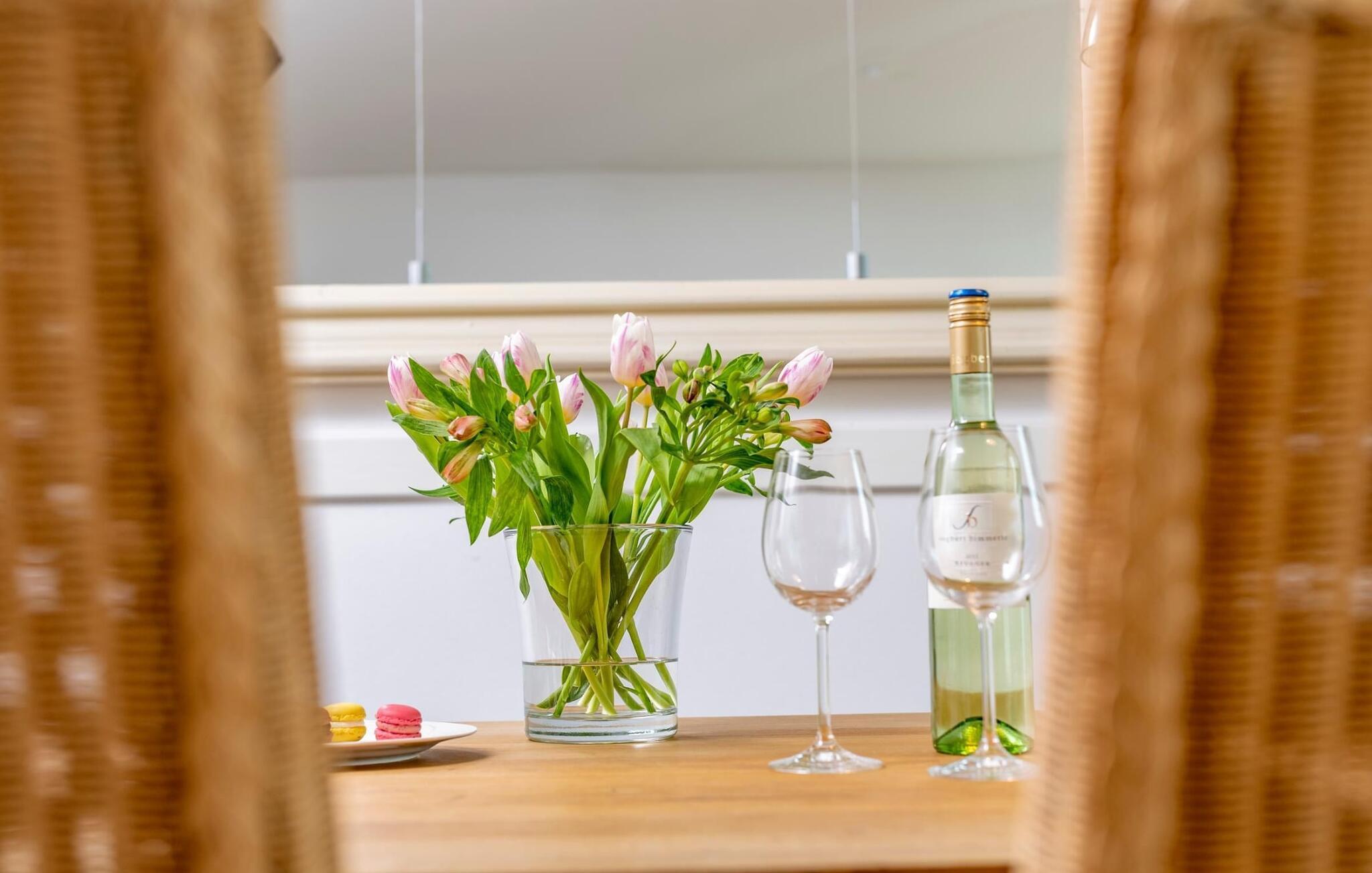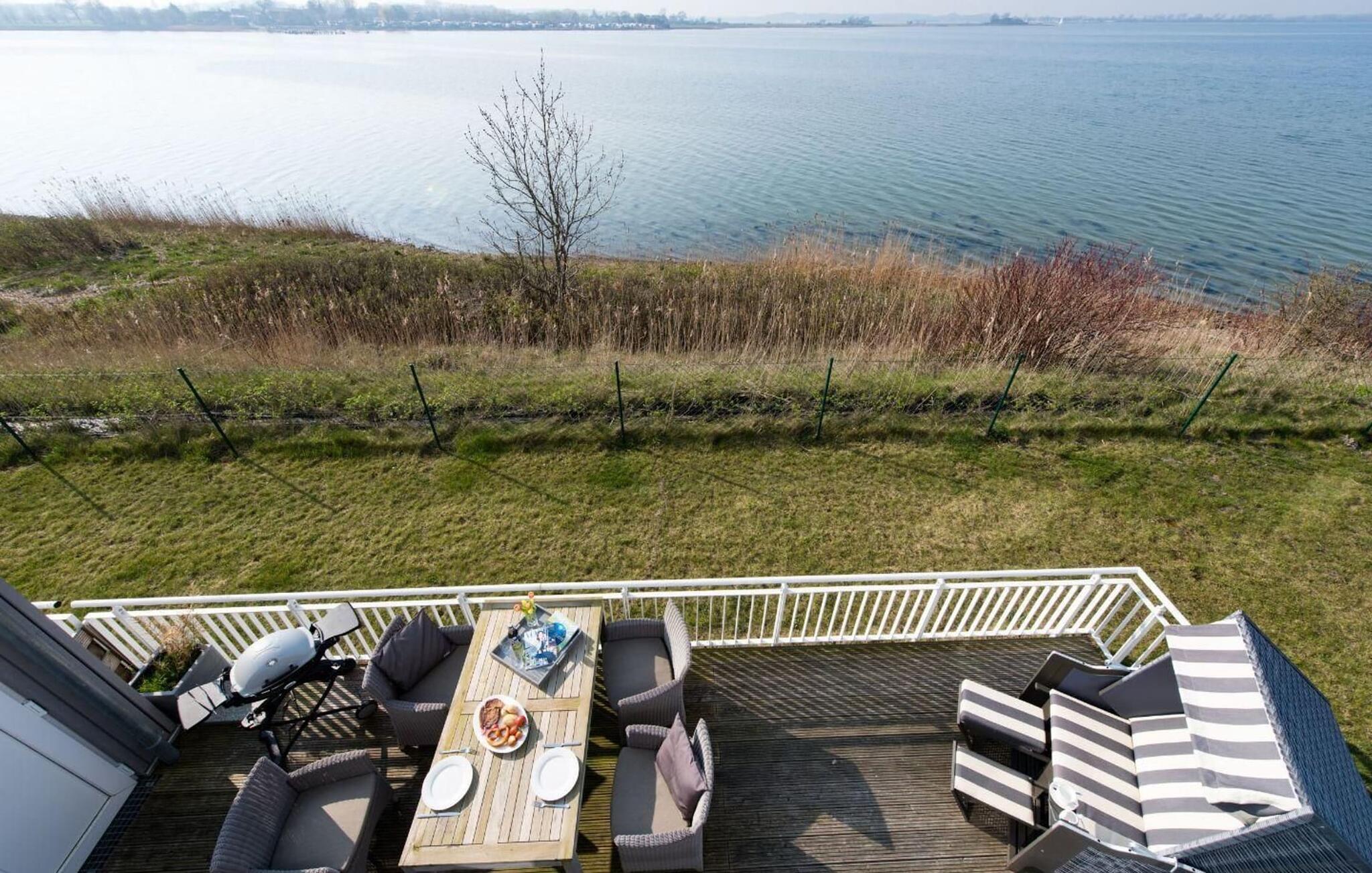 Feriehusets lyse opholds- og spisestue ligger i stueetagen. Gulv-til-loft-vinduer tilbyder uhindret udsigt over Slien og forbipasserende sejlbåde. Et hjemmebiografsystem sikrer komfort i de mørkere måneder. Herfra er der adgang til den vestvendte solterrasse med strandstol, Weber-gasgrill og garanterede solnedgange. Det fuldt udstyrede køkken lader intet tilbage at ønske. Et gæstetoilet på denne etage giver ekstra bekvemmelighed.