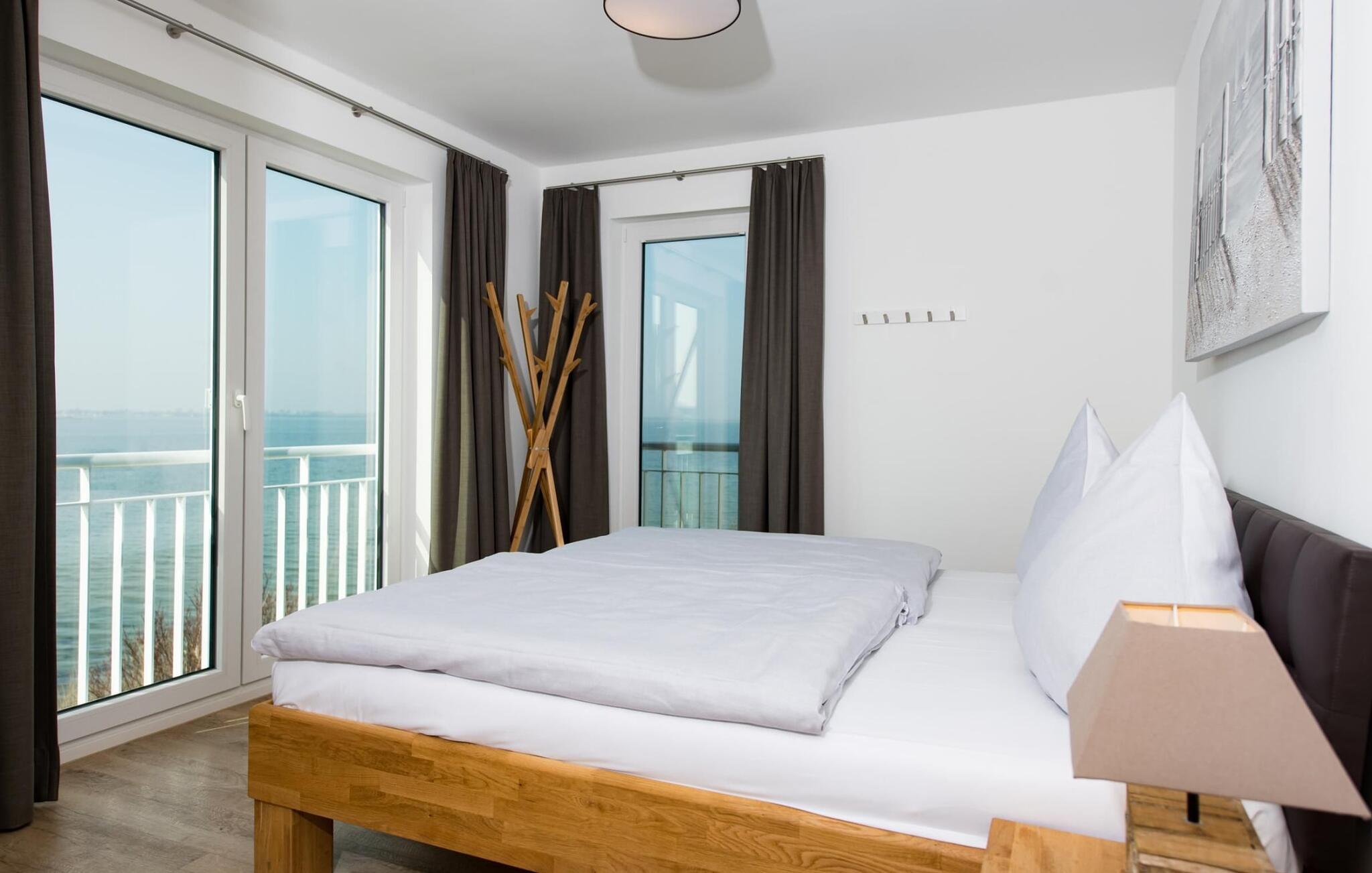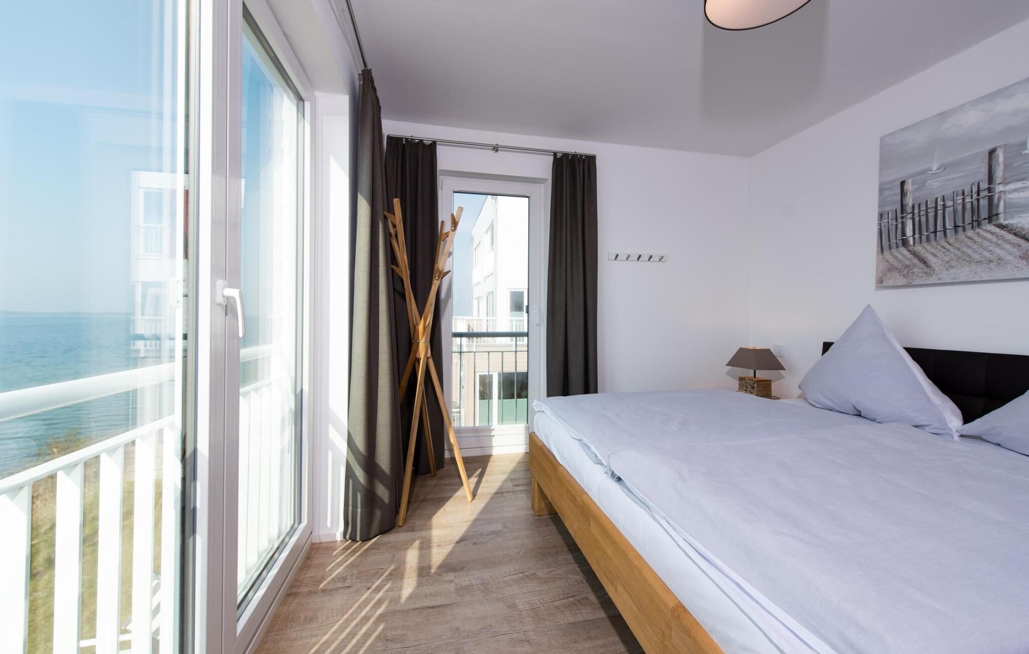 På første sal er der to soveværelser med udsigt over vandet, det ene ud mod Slien og det andet mod havnen. Mens soveværelset med udsigt over Sli-fjorden har en dobbeltseng, kan de to enkeltsenge i det andet soveværelse, som også har et tv, nemt skubbes sammen. Mørklægningsgardiner i begge soveværelser giver varmeisolering. Et fuldt udstyret badeværelse på denne etage tilbyder afslapningsmomenter, da spabadet også har uhindret udsigt over Slien.