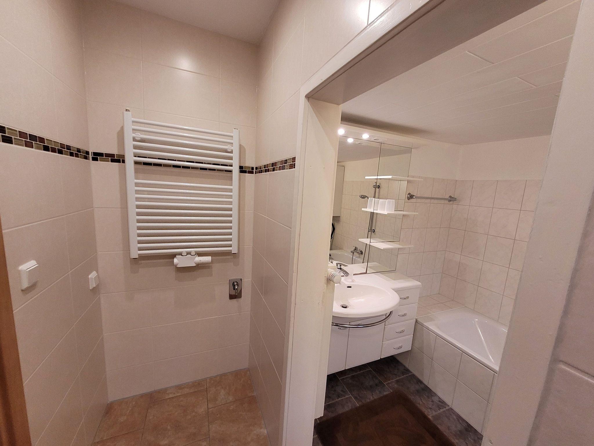 1 Badezimmer mit Anbauwand ,WC, Badewanne und Dusche