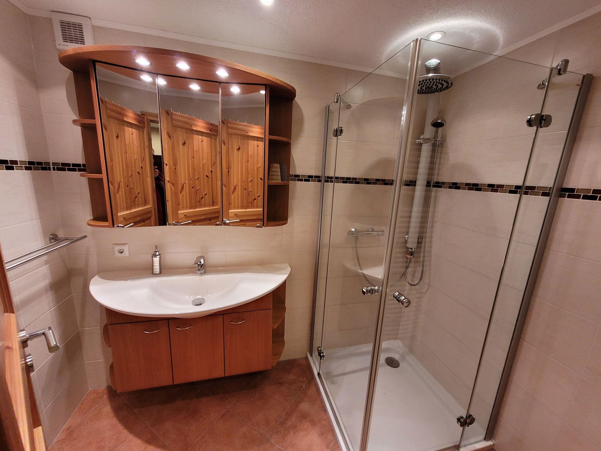 1 Badezimmer mit großer Dusche, WC, Handtuchtrockner, Anbauwand mit 3teiligem Spiegelschrank, Fön, warme Fußbodenfliesen zu jeder Jahreszeit