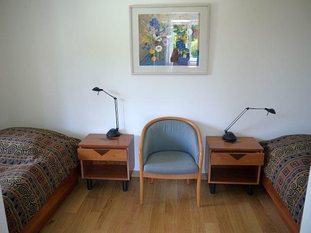 Die 50-qm-Erdgeschoßwohnung mit separatem Eingang besteht aus einer vollständig eingerichteten hellen Wohnküche, einem großzügigen Wohnraum mit bequemem Sofa, Kompaktmusikanlage, Flat-TV, Schreibtisch mit Internetzugang (WLAN) und kleiner Ferienbibliothek, einem Schlafzimmer mit zwei Einzelbetten, ohne Fußblende, einem Bad mit barrierefreier Dusche und WC sowie einem 20 qm großen überdachten Außendeck mit Sitzecke und Sonnenliegen. Der den Gästen zugängliche Garten mit Teichen grenzt unmittelbar an den Garten Spa des Wellnesshotels "Waldschlösschen" (www.ringhotels.de/schleswig), in dem es sich wunderbar entspannen und genießen lässt. Stellplätze für bis zu 3 PKWs sowie abschließbare Unterstände für Fahrräder sind vorhanden. Waschmaschine und Trockner zur Mitbenutzung.