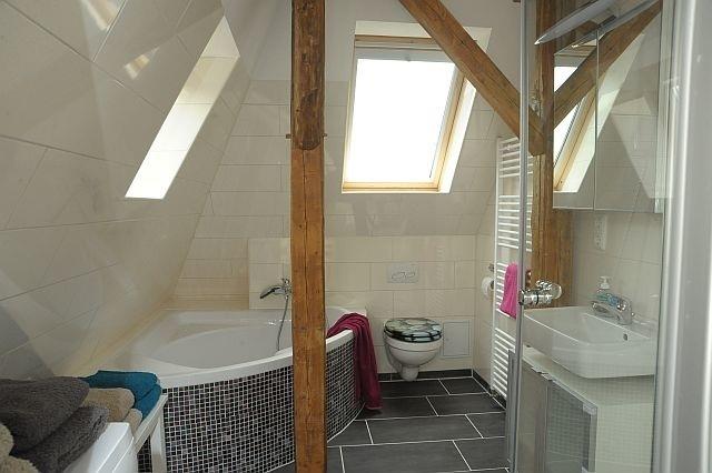 Das Badezimmer bietet eine Dusche, eine Eckbadewanne und WC.