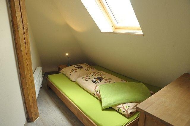 Die Wohnung verfügt über ein Schlafzimmer mit zwei Einzelbetten und ein Schlafzimmer mit einem Französischen Bett (140 cm). Ein offener Schlafboden mit Stehhöhe und Rückzugsnische ist der Lieblingsplatz vieler kleiner Gäste