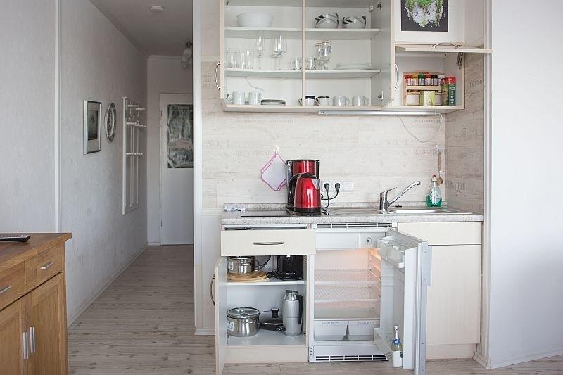 Bei der Wohnung Nr. 3 im 10. Stock handelt es sich um ein helles und voll ausgestattetes 1-Zimmer-Apartment mit Balkon. Der Wohnraum ist mit freundlichen Möbeln überwiegend aus hellem Holz ausgestattet, es gibt einen Flachbildfernseher, WiFi, eine Stereoanlage sowie schöne Bilder und Dekoration. Geschirr, Besteck, Töpfe und Pfannen sind in der Küchenzeile vorhanden. Der Herd hat zwei Cerankochfelder und es gibt eine Mikrowelle mit Grillfunktion. Vom Balkon, dessen Fensterscheiben zur Seite geschoben werden können, blickt man auf die Innenstadt und den Dom, den Stadthafen, die Möweninsel und die Schlei. Einen ähnlich schönen Ausblick hat man auch vom Wohnraum aus. Bestens geeignet, um von hier aus Schleswig und Umgebung zu erkunden. Außer zum Apartment selbst besteht für diejenigen Gäste, die Wäsche waschen wollen, im Keller Zugang zu Waschmaschine und Trockner. Einzelheiten insbesondere zu den erforderlichen Münzen, aber auch zu wichtigen Ausflugszielen und mehr können in der Willkommensmappe nachgelesen werden. Ferner kann man im Erdgeschoss den Durchgang zum Fahrstuhl nehmen, der ganz nach oben zur "Bar 26" im Wikingturm führt. Netzwerkname und Passwort finden sich in der Mappe und in der Kommodenschublade.