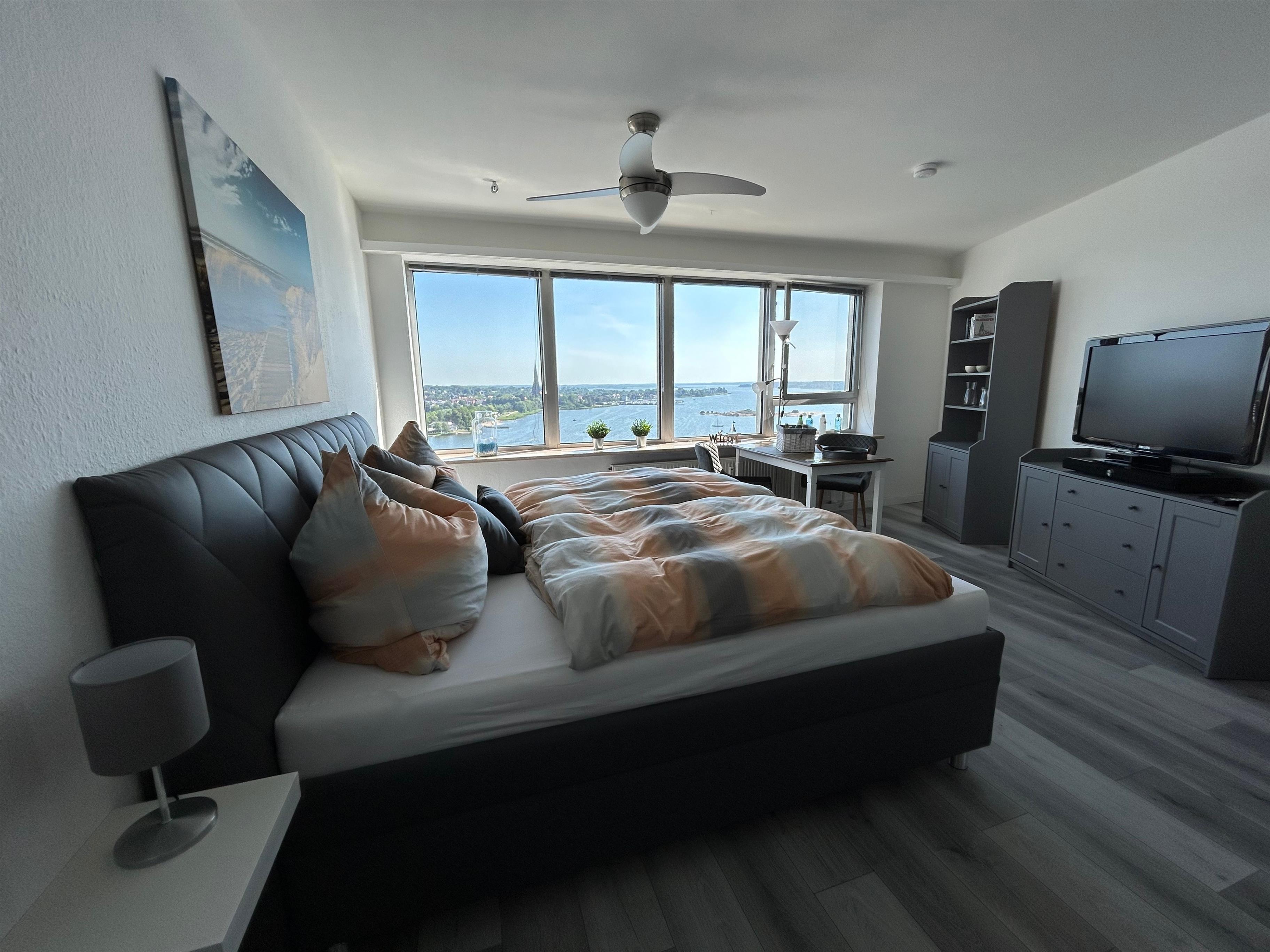 Hoch hinaus im Wikingturm – Exklusive Ferienwohnung mit Panoramablick – Genießen Sie den Ausblick auf die Schlei, die Möweninsel und den Dom aus der breiten Fensterfront. Die Wohnung verfügt über ein Doppelbett, eine kleine Küchenzeile und ein eigenes Bad