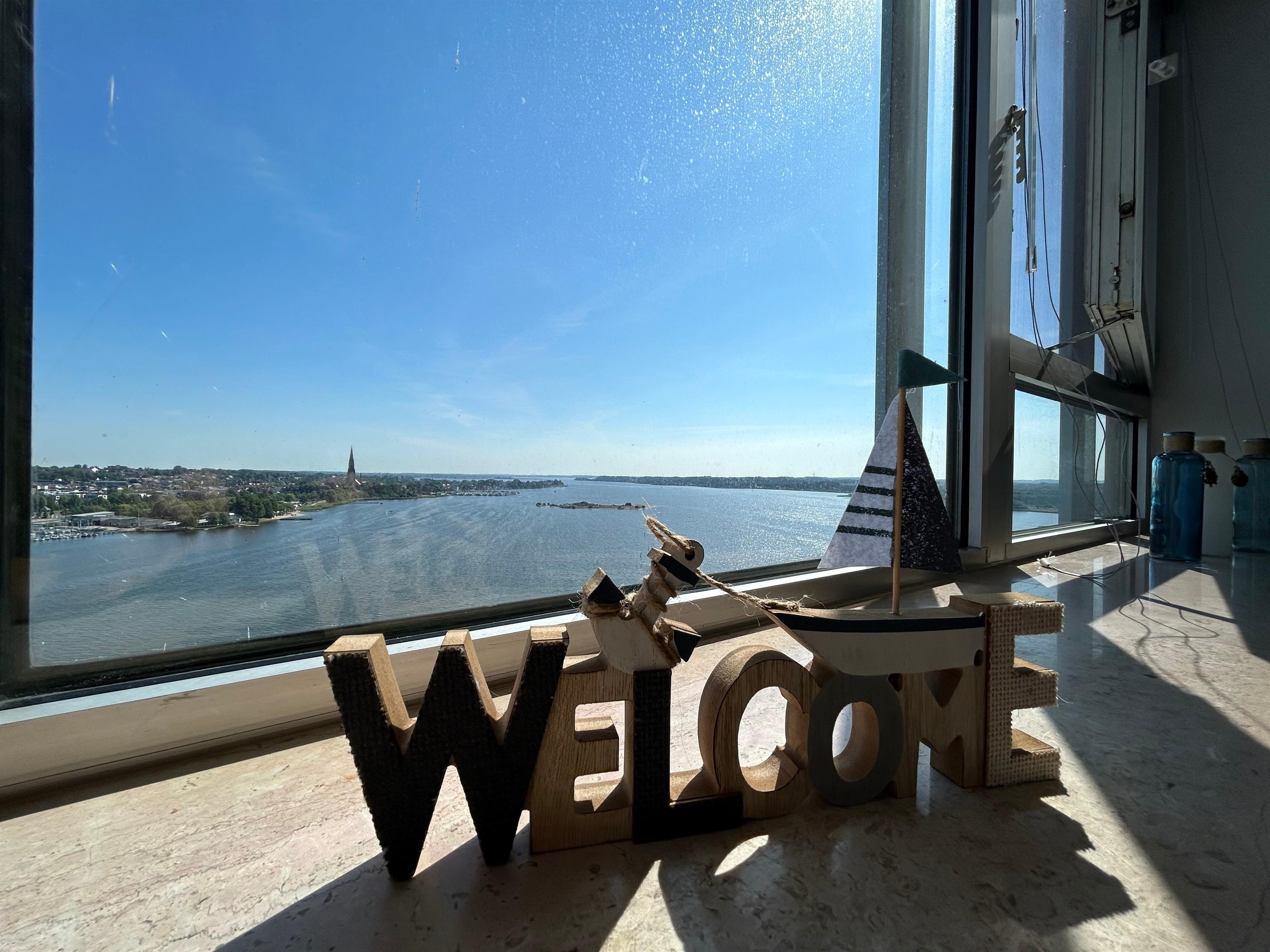 Die Wohnung 4 in der 16. Etage ist eine kombinierte Wohn-/Schlafeinheit (Doppelbett 1,80x2,00m) mit einem separaten Badezimmer (Dusche, Waschbecken, WC) und macht ihrem Beinamen "Bellevue" alle Ehre, wenn Sie aus der breiten Fensterfront über die Schlei auf die Stadt Schleswig schauen können. Die im Wasser liegende Möweninsel ist ebenso zu sehen, wie der kleine Strandabschnitt vom "Louisenbad", die "Königswiesen" oder der Dom. In der Wohnung befindet sich eine kleine Küchenzeile (zwei Herdplatten) mit einer Microwelle, einem Kühlschrank, einem Wasserkocher und einem Toaster. Ein Fernseher befindet sich ebenfalls in der Wohnung.