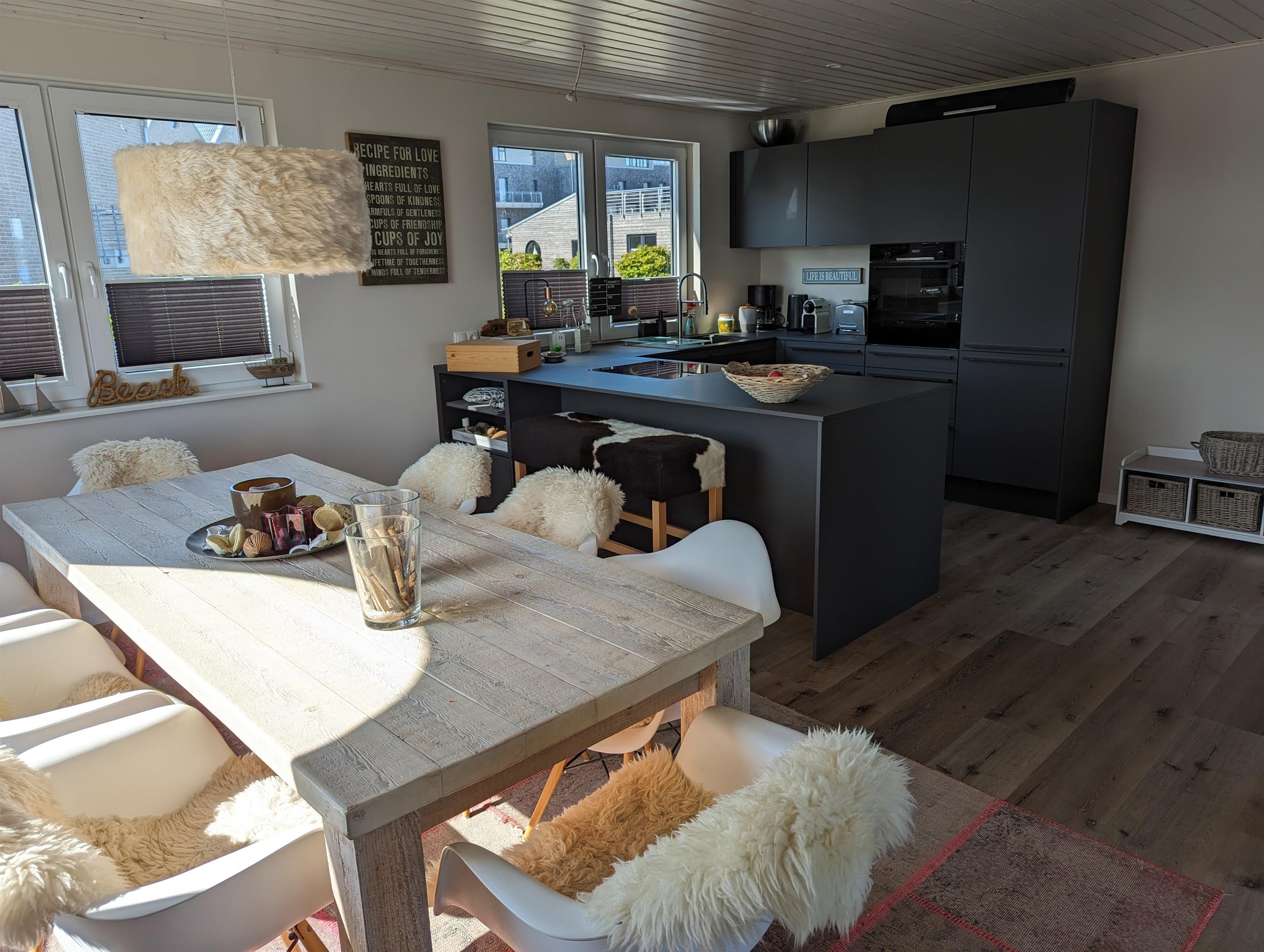 Wohn- und Essbereich (mit Schlafcouch) mit offener Küche sowie ein Gäste-WC untergebracht.