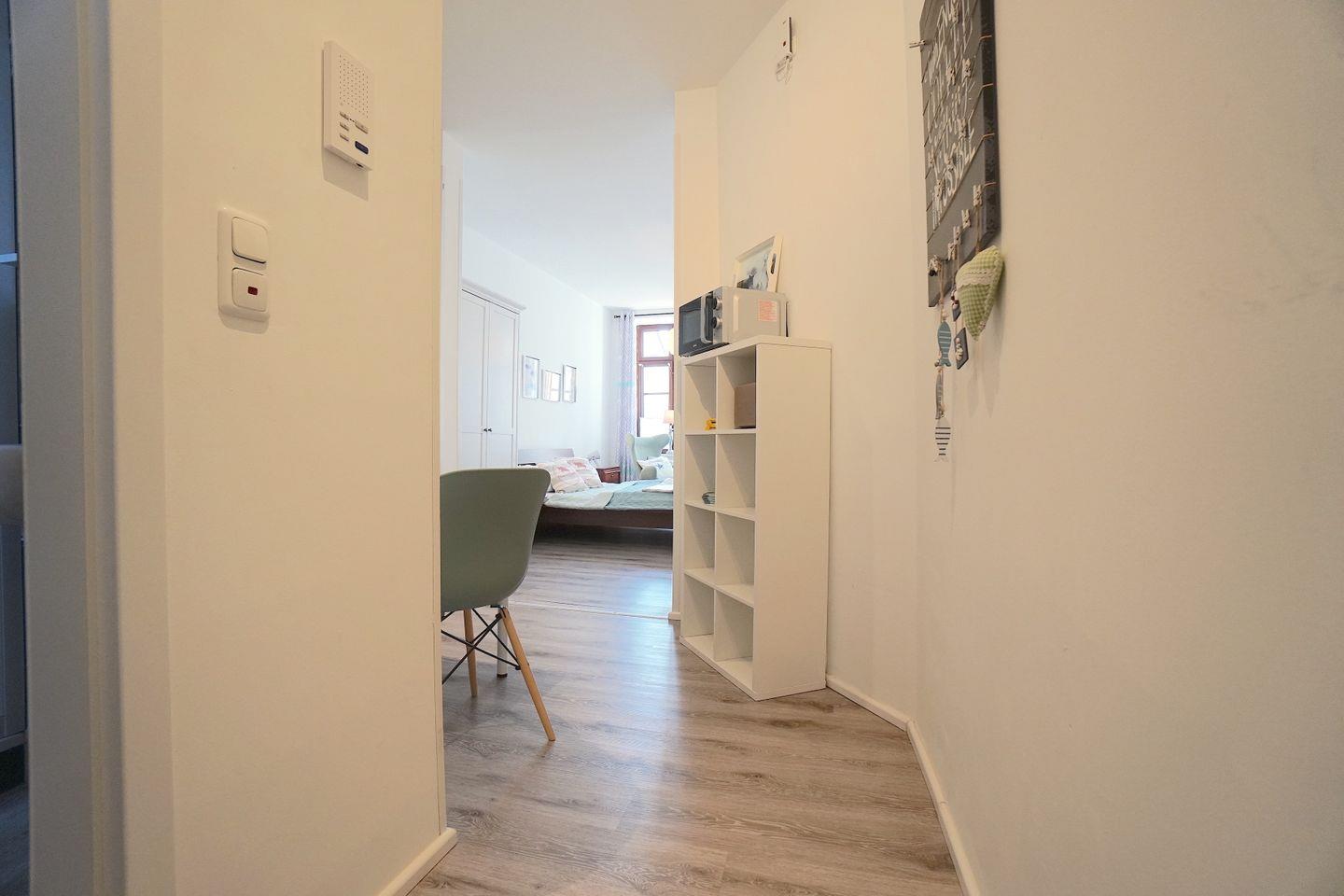 Absolutes Wohlfühlen auf 30qm! Die kleine Wohnung bieten alles was man für einen Aufenthalt in der Wikingerstadt Schleswig braucht. Sie verfügt über einen geräumigen Wohn- und Schlafraum mit einer kleinen Küchenzeile und Essbereich. Ein Flur führt in die Wohnung und bietet Platz für Schuhe und Garderobe. Gleich vorne an befindet sich außerdem das Badezimmer, welches frisch renoviert ist und über Tageslicht verfügt. Das Bad ist hell und bieten genügend Platz und Komfort.