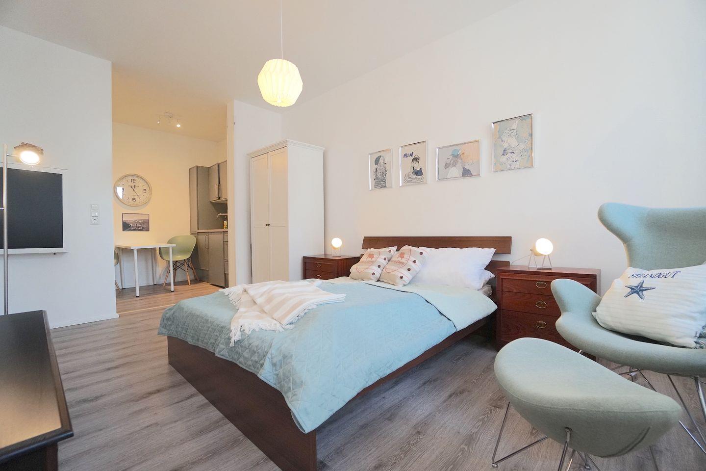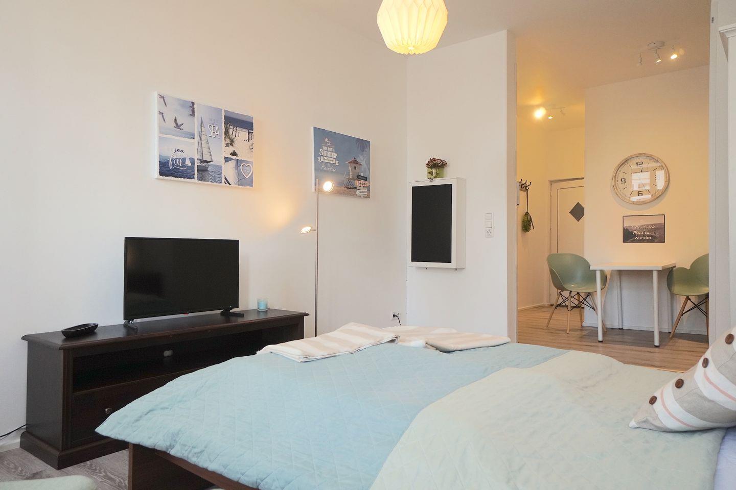 Der helle, freundliche Wohn-Schlaf-Raum ist geschmackvoll eingerichtet. Das Doppelbett sorgt für eine erholsame Nacht.