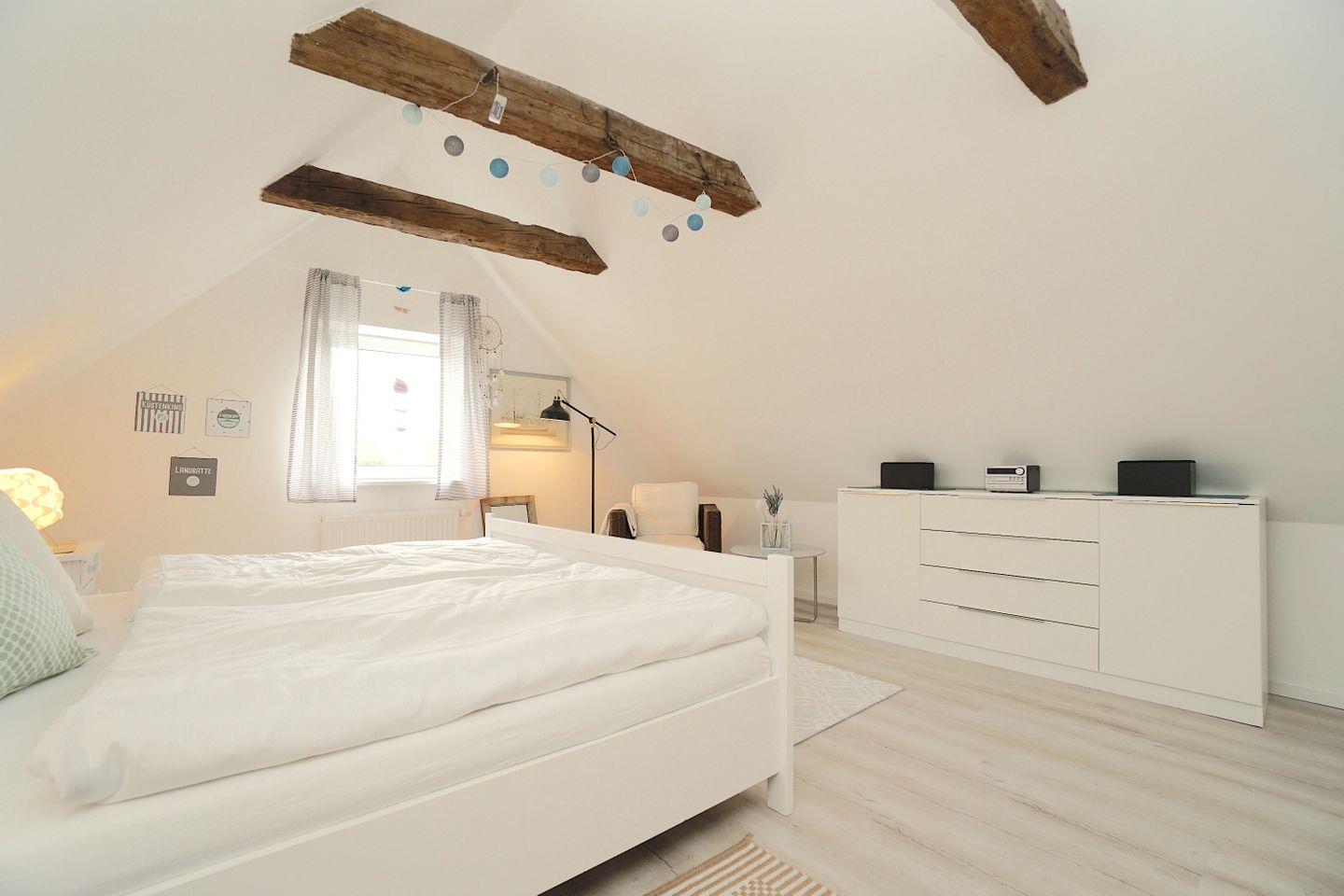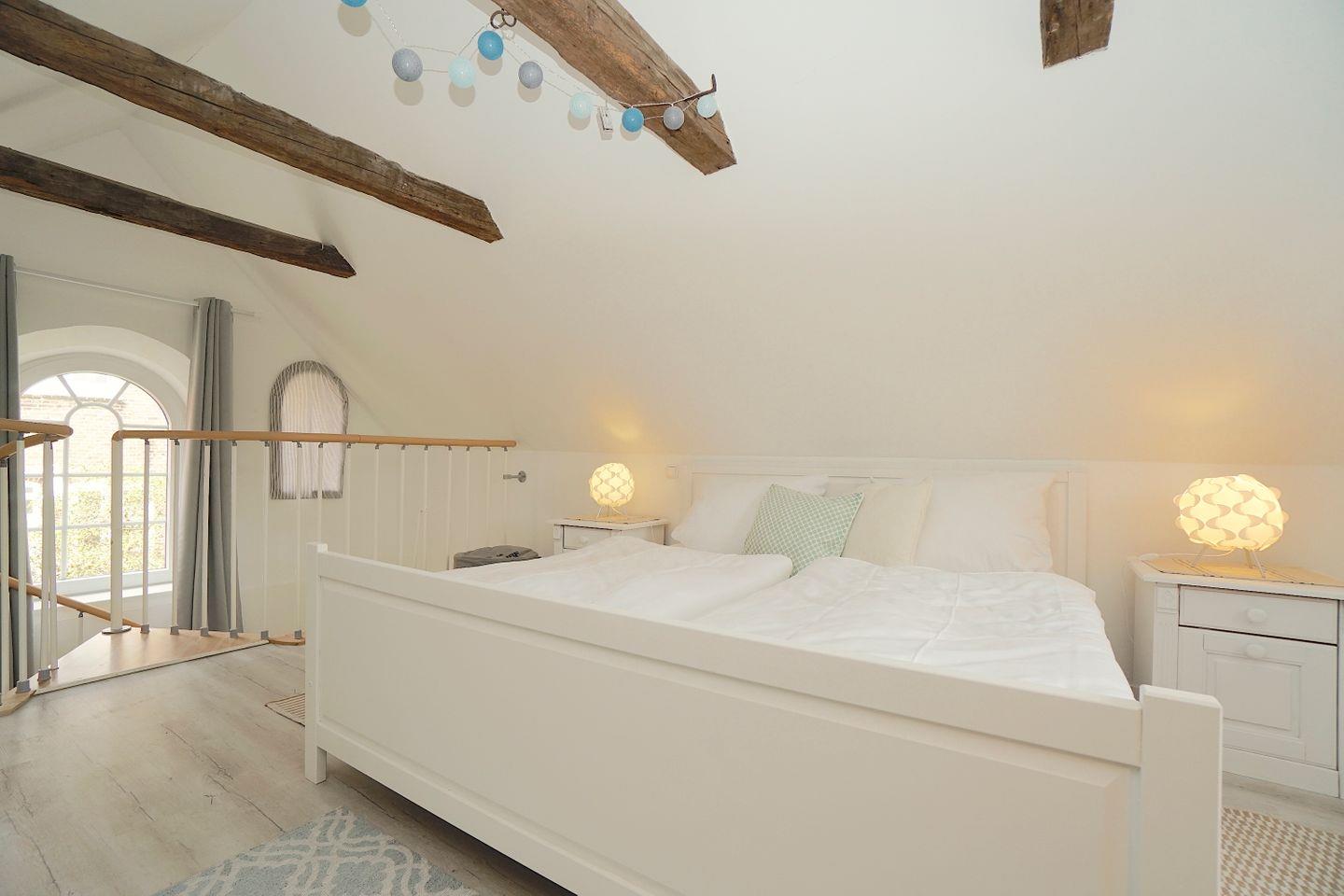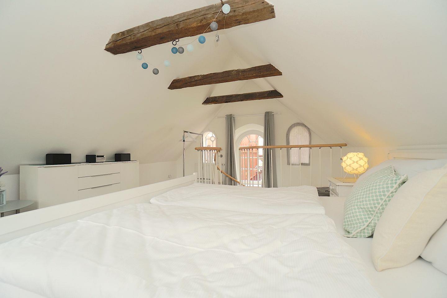 Über eine schmale Wendeltreppe gelangt man in das Obergeschoss der Maisonettewohnung in dem sich, unter den alten Balken der Tischerlei, das Schlafzimmer befindet.