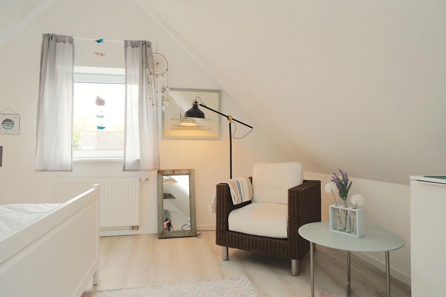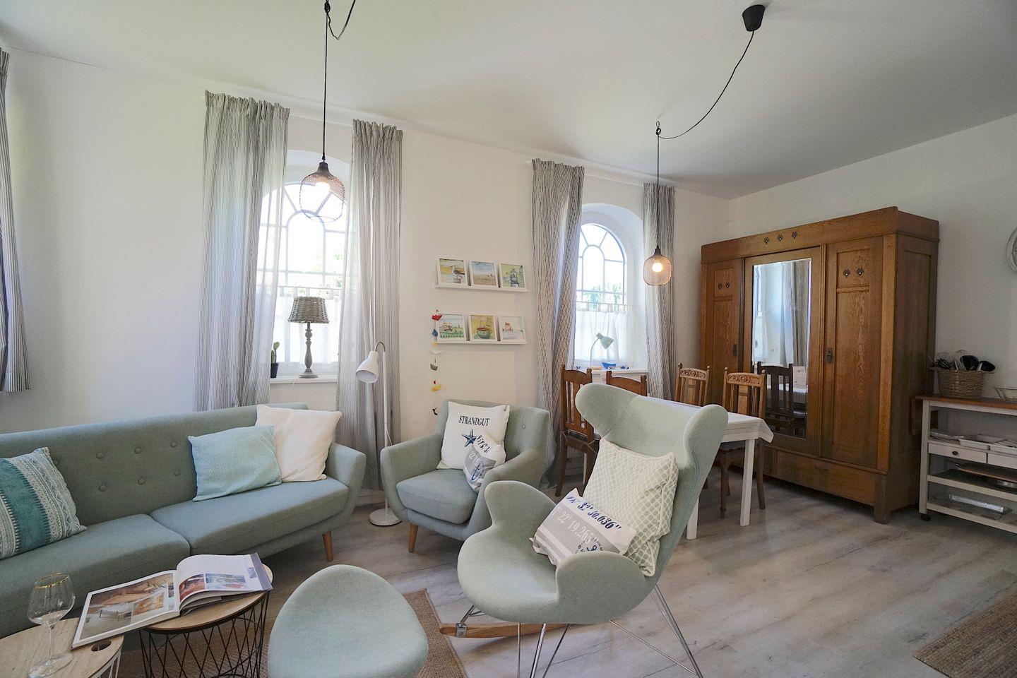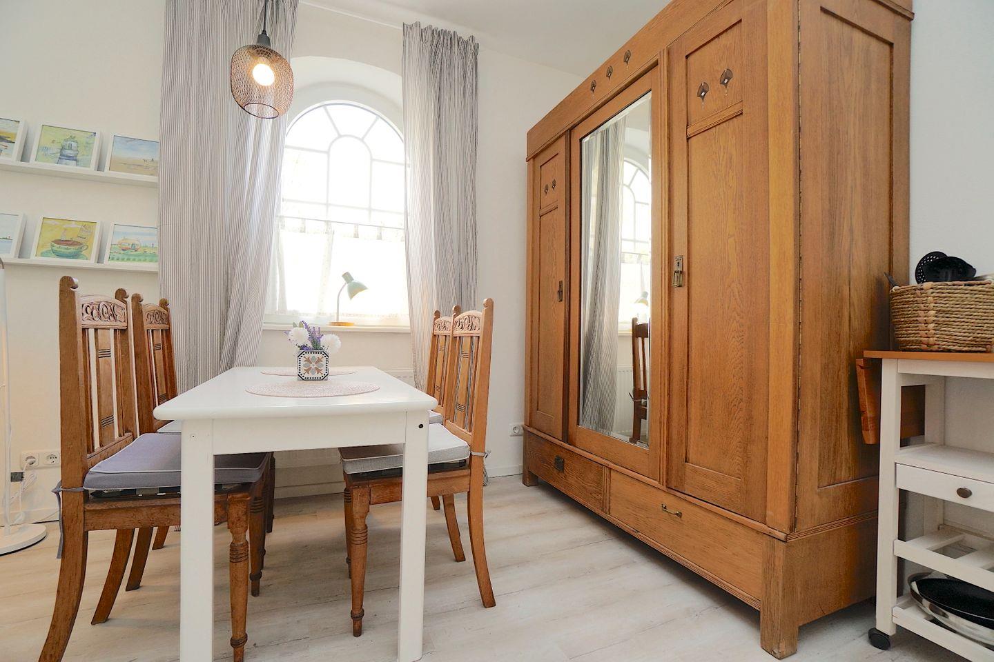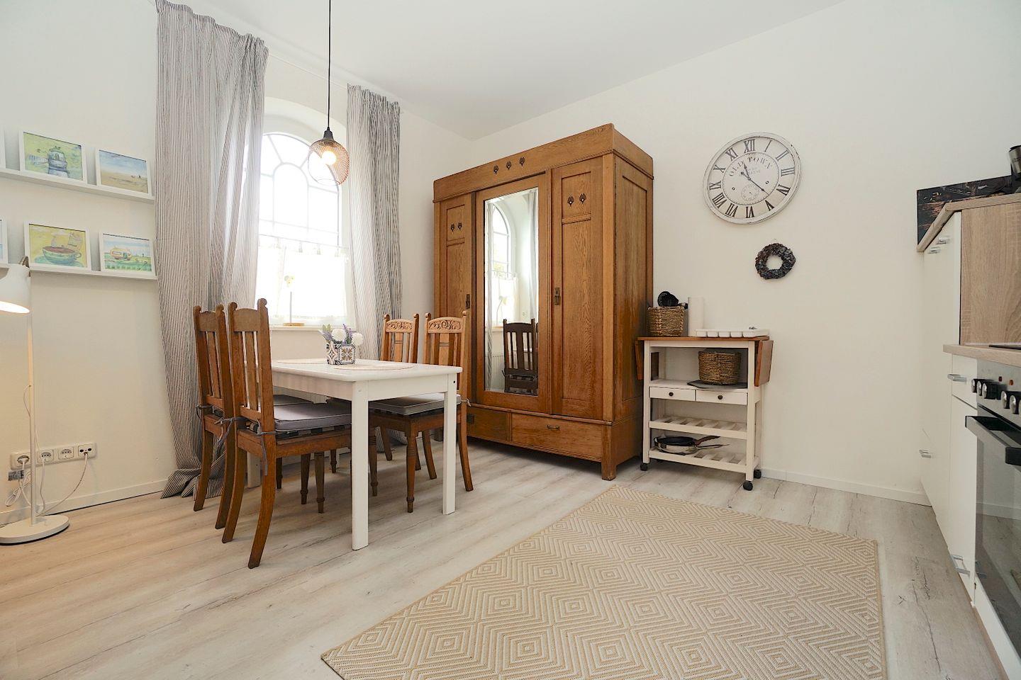 Die Ferienwohnung teilt sich auf in ein offenen Wohn-, Ess- und Kochbereich im Erdgeschoss mit einem Tageslichtduschbad.