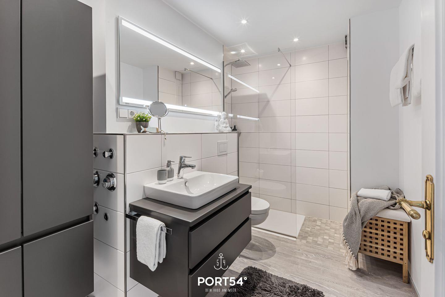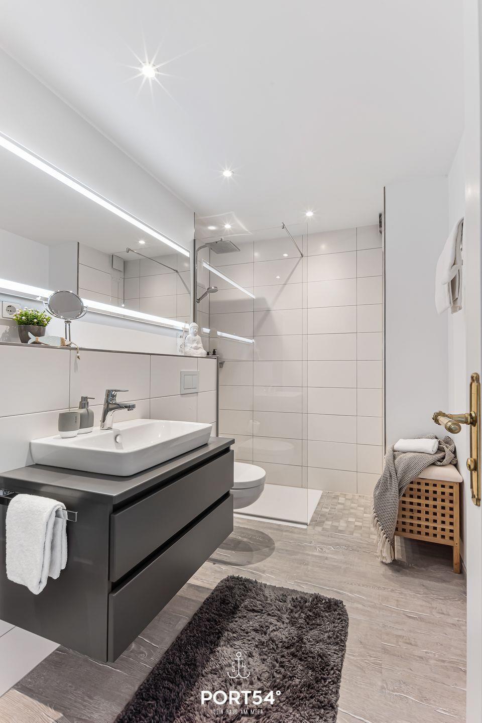 Das Badezimmer ist modern ausgestattet mit einer Walk-in-Dusche und einem Aufsatzwaschbecken.