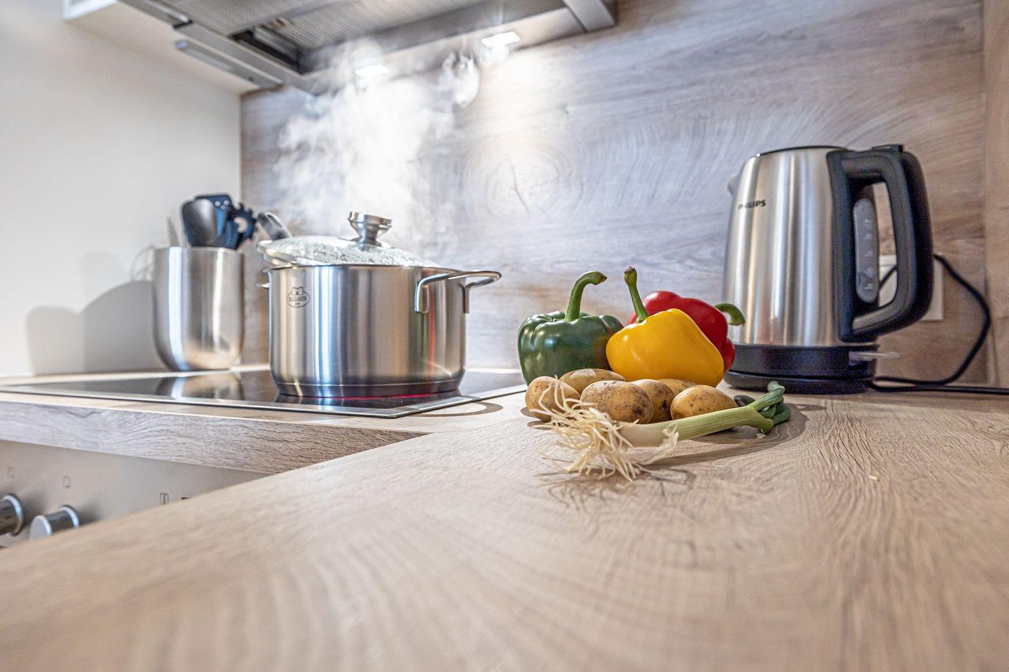 Die vollausgestattete Küche lässt keine Wünsche offen und im Wohnzimmer kannst Du Deine Urlaubstage auf dem Sofa vor dem Smart-TV ausklingen lassen. Diesen kannst Du bei Bedarf so drehen, dass Du auch vom Bett aus fernsehen kannst.