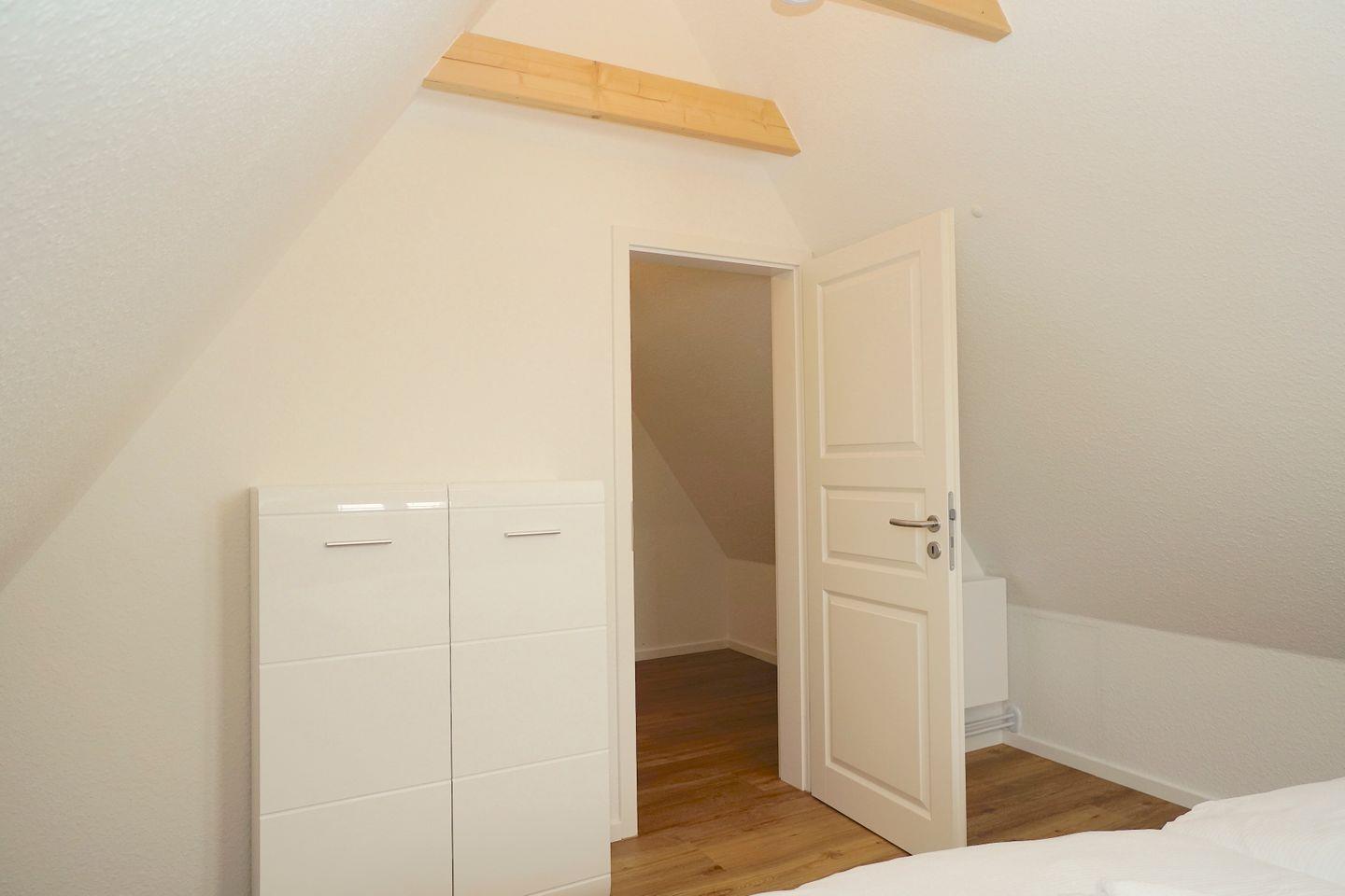 Im oberen Stockwerk des Ferienhauses befinden sich zwei Schlafzimmer, eines mit zwei Einzelbetten und das anderen mit einem gemütlichen Boxspringbett mit einer Breite vom 160cm.