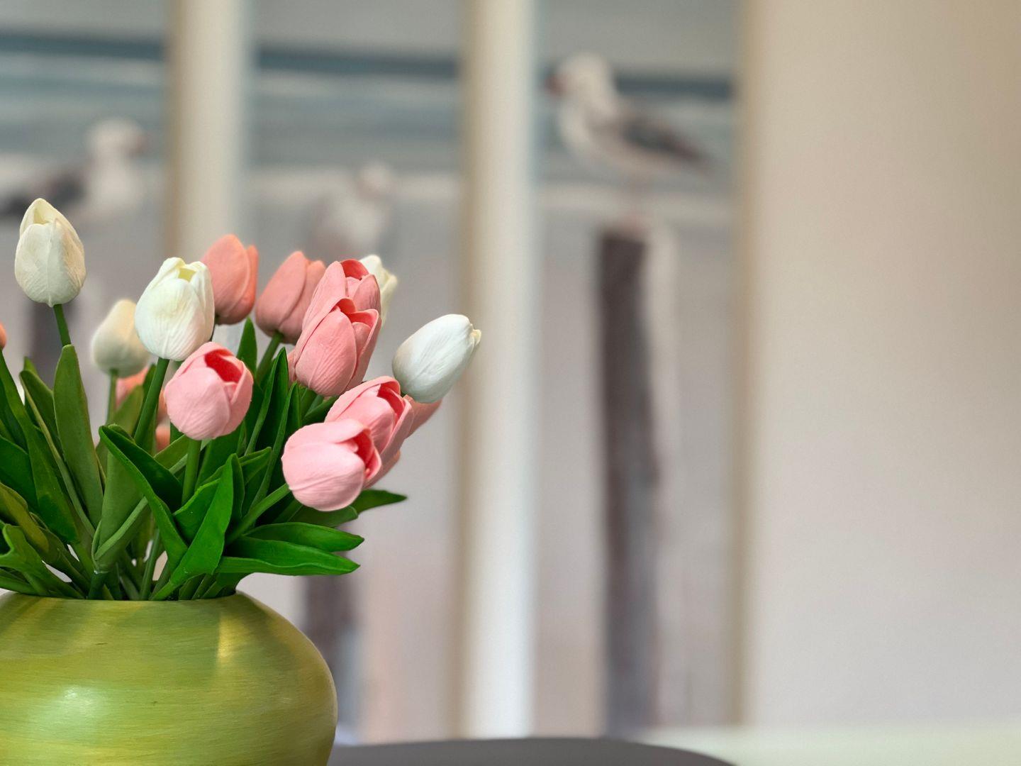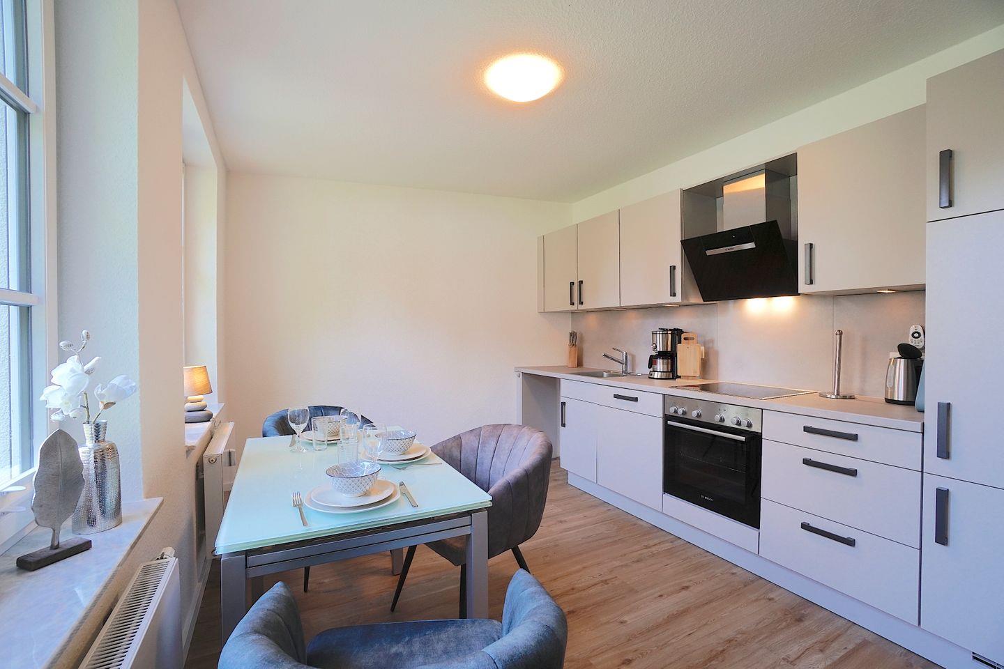 Im unteren Bereich des Lütt Huus liegt der offene Wohn- und Essbereich. Mit Blick auf den Schleswiger Dom und in den grünen Vorgarten wird das Kochen zum Genuss. Der neue Esstisch kann bei Bedarf vergrößert werden, so dass alle Gäste Platz nehmen können.