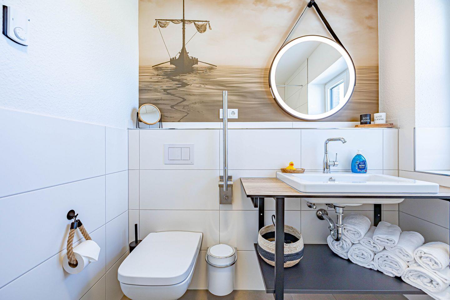 Zwei Schlafzimmer bieten jeweils ein gemütliches Boxspring-Doppelbett (180x200cm) sowie eine Verdunklungsmöglichkeit für erholsame Nächte. Das Badezimmer ist modern gestaltet und bietet eine bodengleiche Dusche mit Haltegriff sowie eine Fußbodenheizung, die für zusätzlichen Komfort sorgt. Ebenfalls stehen Dir ein Kosmetikspiegel und ein Föhn bereit. Eine Waschmaschine steht zur gemeinschaftlichen Nutzung im Nachbarhaus zur Verfügung, damit Du auch bei längeren Aufenthalten immer frisch gewaschene Kleidung hast. Durch die einzigartige Lage am Ostseefjord Schlei kann auch ein Boot mitgebracht und auf einem Liegeplatz gegen Gebühr direkt am Pionierhafen angelegt werden. Bitte sprich uns hierfür an.