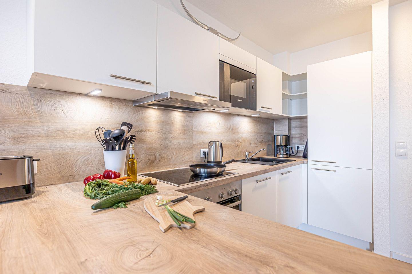Ein besonderes Highlight der Unterkunft ist der Balkon, von dem Du einen beeindruckenden Blick über die Umgebung genießen kannst – der perfekte Ort, um den Tag mit einem Kaffee zu beginnen oder abends den Sonnenuntergang zu beobachten. Die Küche ist voll ausgestattet mit modernen Geräten, darunter ein Cerankochfeld, Backofen, Mikrowelle, Kühlschrank, Spülmaschine und Kaffeemaschine, sodass Du Deine Lieblingsgerichte zubereiten kannst.