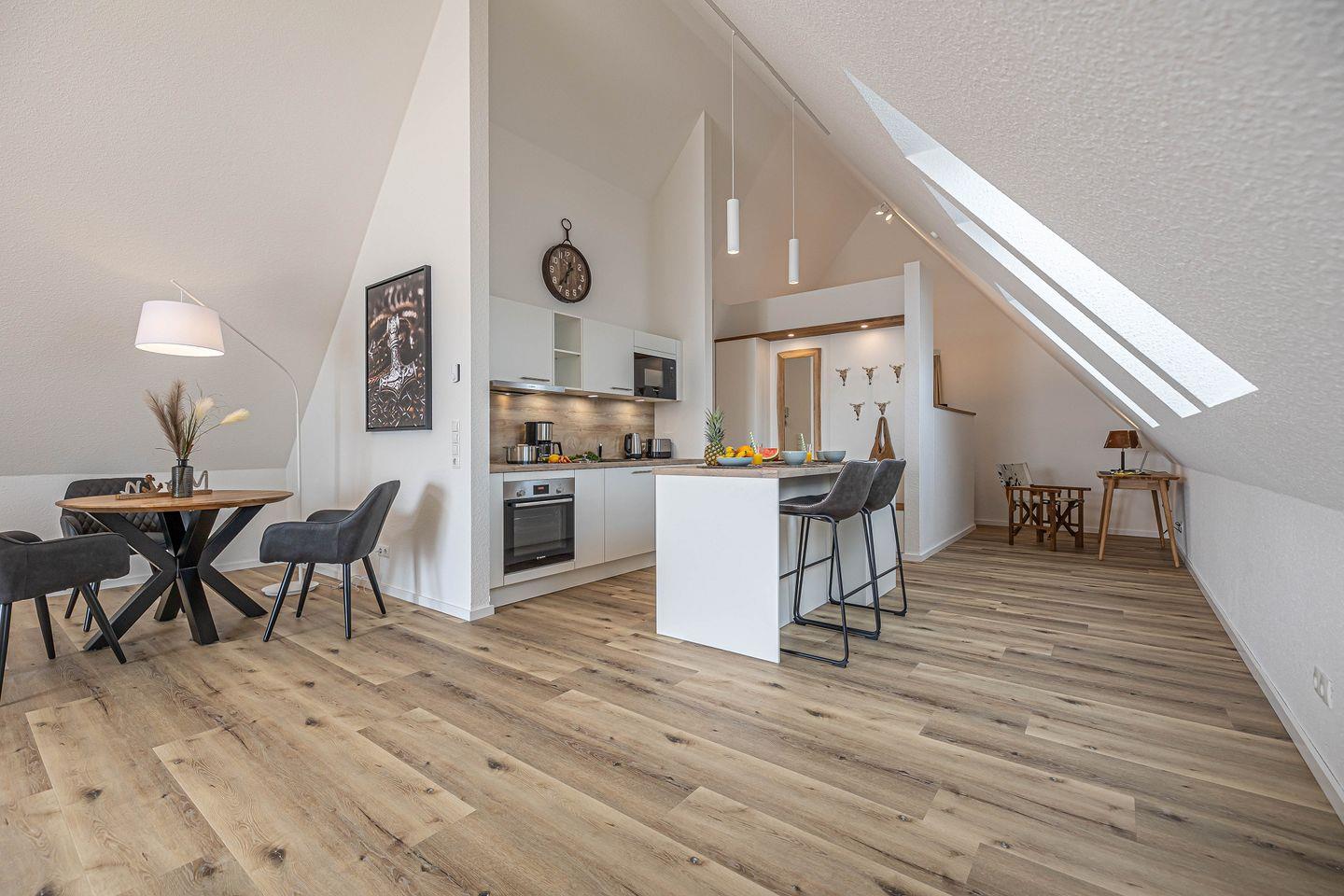 Das Apartment verfügt über ein einladendes Wohnzimmer, das durch seine offene Gestaltung zur Küche eine entspannte Atmosphäre ausstrahlt. Genieße gemütliche Abende auf dem komfortablen Sofa oder ein Abendessen am Esstisch, der genügend Platz für gesellige Stunden bietet. Für Deine Unterhaltung sorgt ein digitaler TV-Anschluss, und auch WLAN ist kostenfrei für Dich verfügbar.