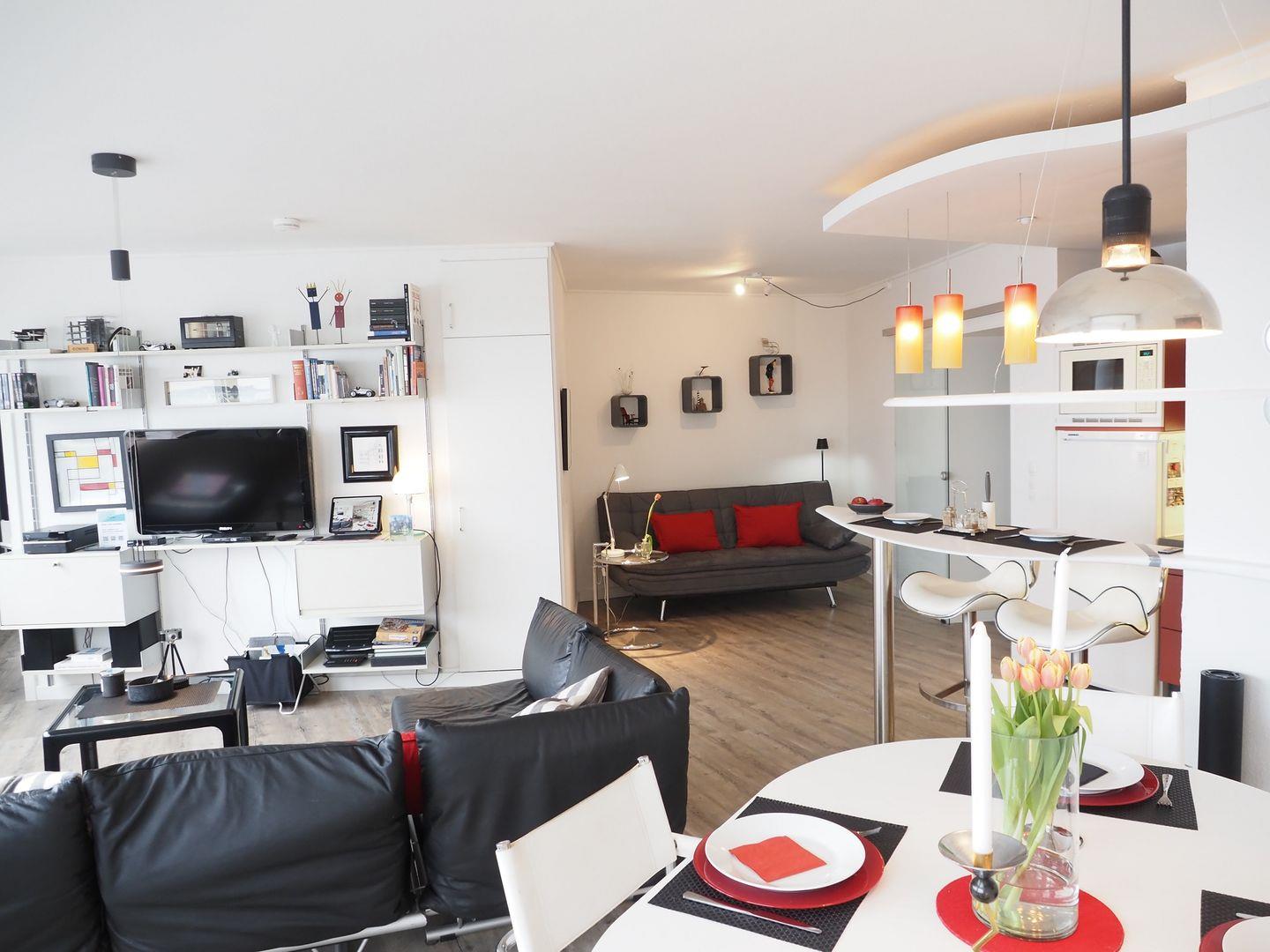 Ein moderner und offener Wohnbereich empfängt Dich mit einer voll ausgestatteten Küche (der Herd hat keinen Backofen, dafür hat die Mikrowelle jedoch eine Backofenfunktion). Im gemütlichen Essbereich kannst Du Deine kulinarischen Meisterwerke mit dem beeindruckenden Ausblick genießen. Und die diversen Sitzgelegenheiten laden Dich zum Verweilen und Plaudern ein.