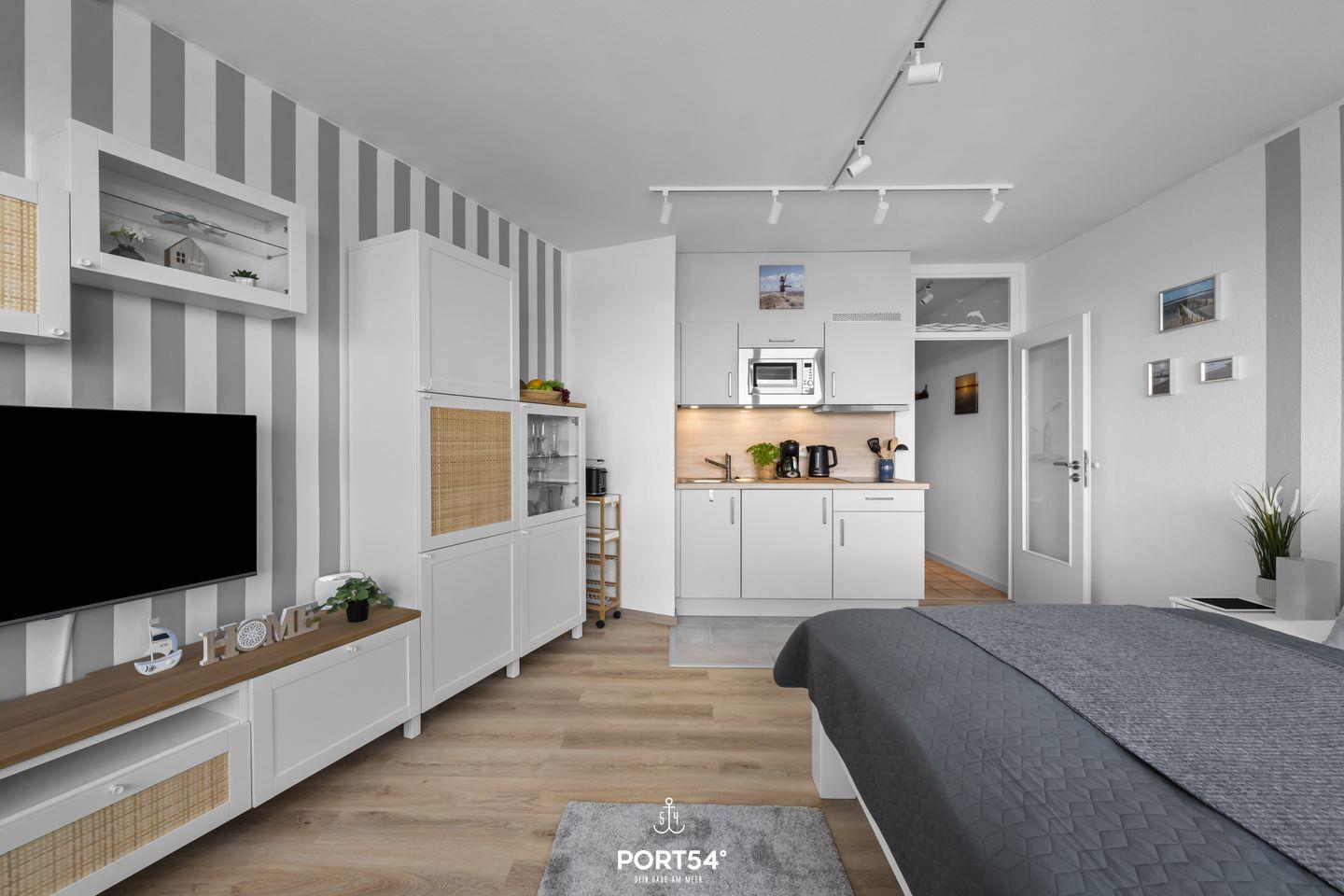 Die Wohnung bietet Platz für bis zu zwei Erwachsene. Der offene Wohn- und Schlafbereich mit Küchenzeile ist gemütlich und geschmackvoll eingerichtet und verfügt über ein komfortables Bett, das für erholsame Nächte sorgt.