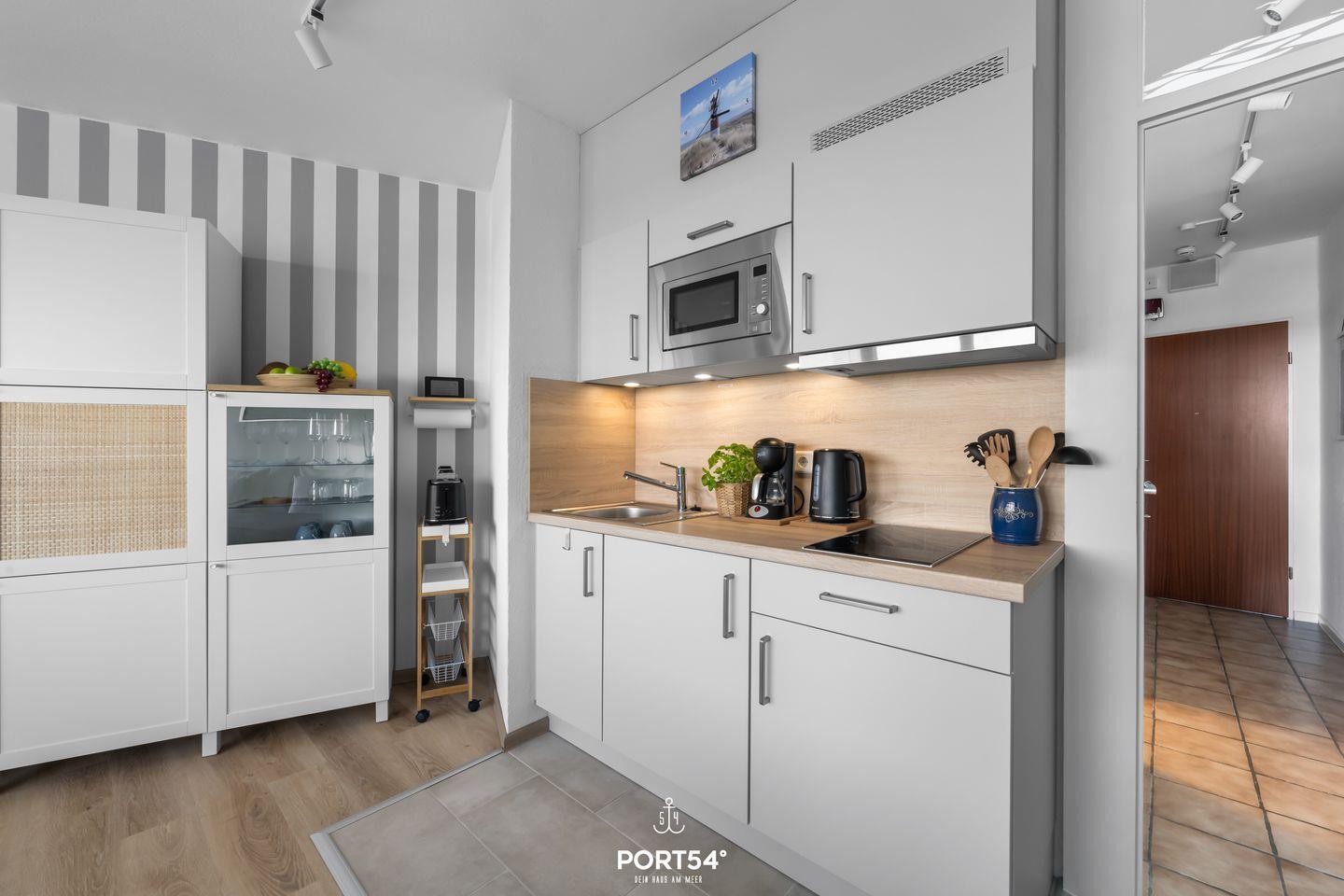 Die gut ausgestattete Küche bietet alles, was Du für Deinen Urlaub brauchst. Neben einer Kaffeemaschine findest Du eine Mikrowelle mit Backofenfunktion, zwei Herdplatten sowie einen Toaster und einen Wasserkocher.