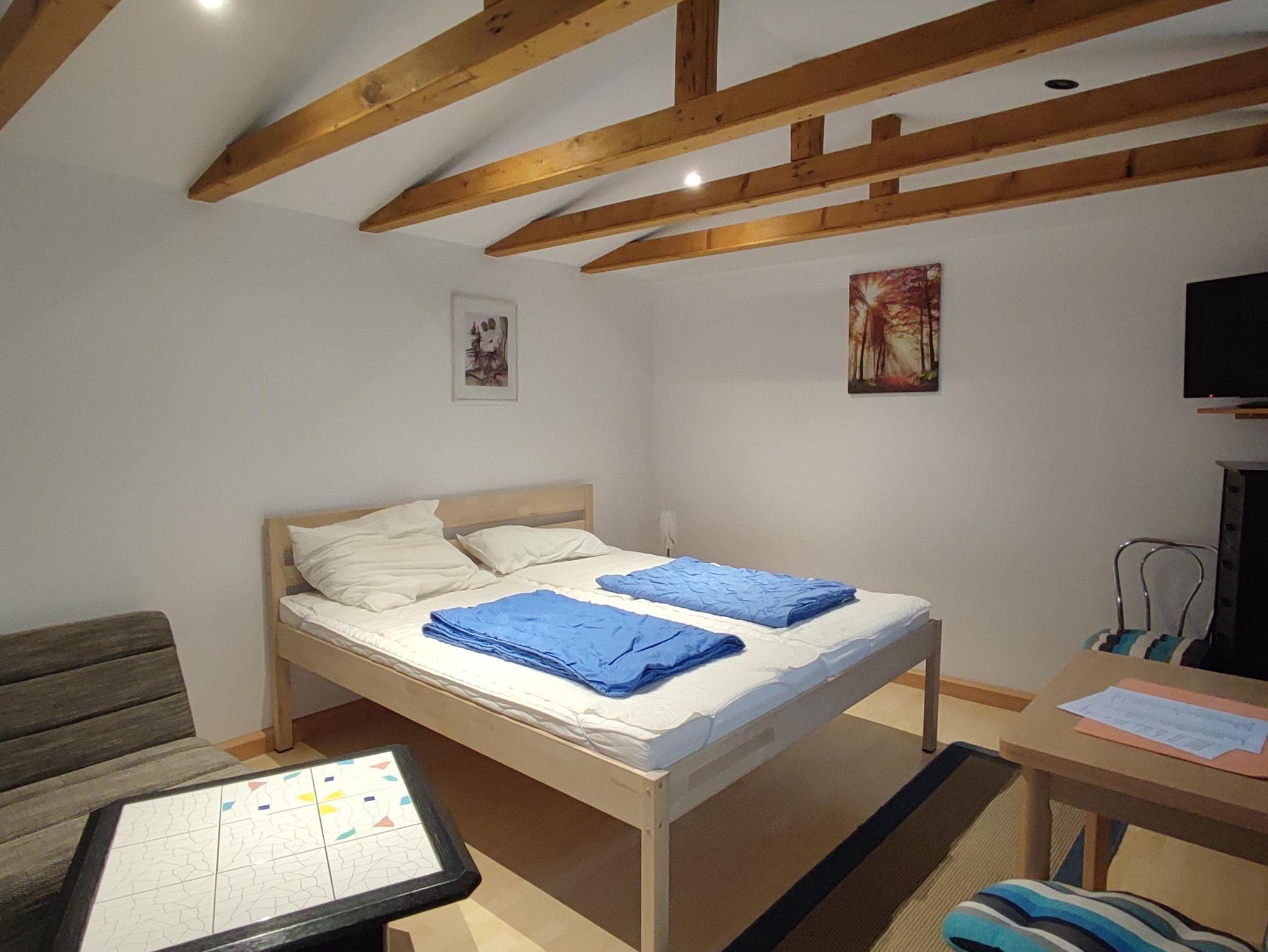 1 Schlaf-/ Wohnraum mit Doppelbett, Kochnische 2-Platten-Kochfeld, Spüle und Kühlschrank, Grundausstattung, Kaffeemaschine (1x4 Filtermaschine), Toaster, Wasserkocher, Geschirr, Besteck, Gläser, Töpfe, Pfanne. Couch, Couchtisch, 1 Doppelbett, Kabel-TV, Bad mit Waschtisch, Dusche / WC. Kleine überdachte Terrasse.