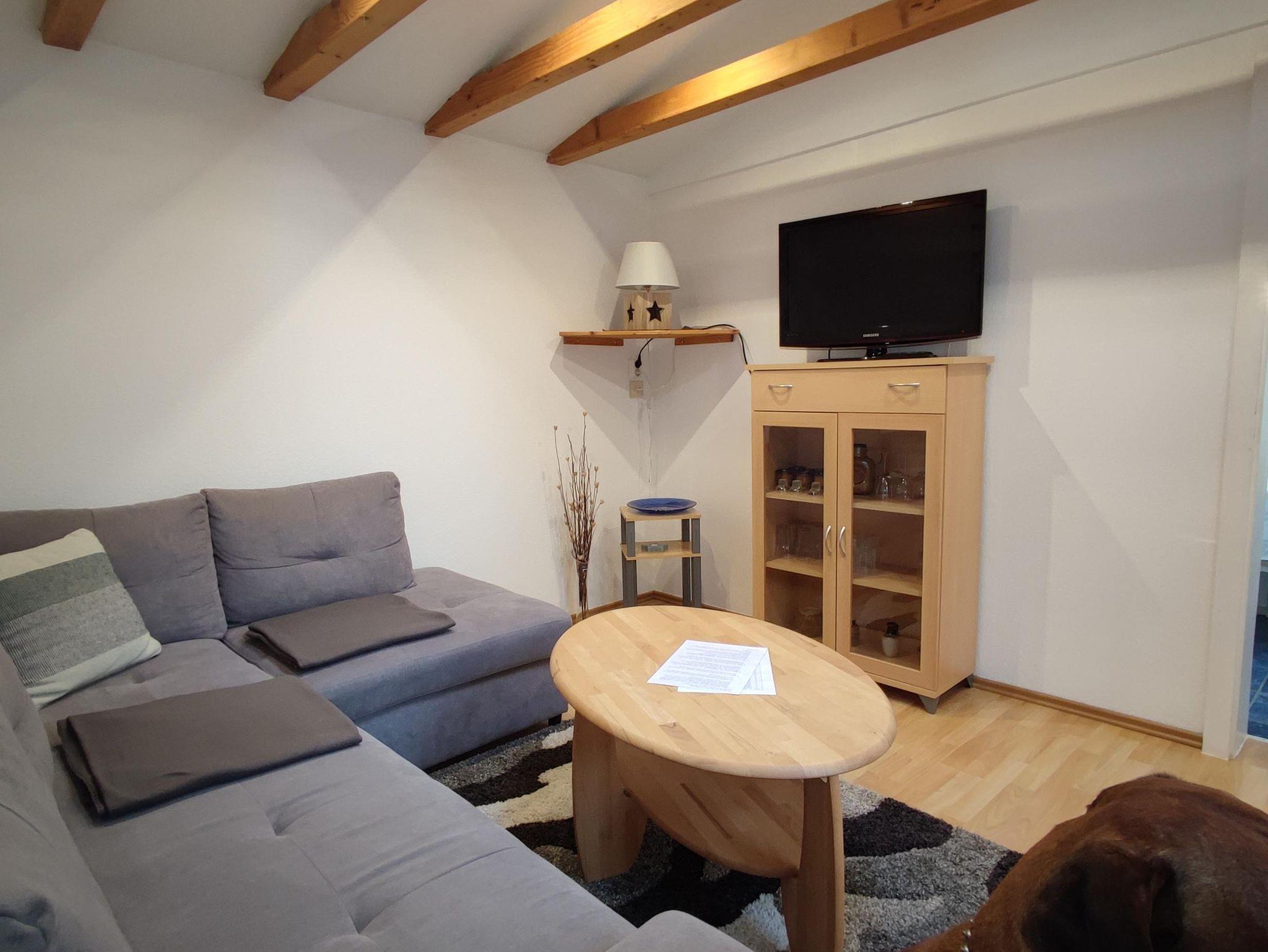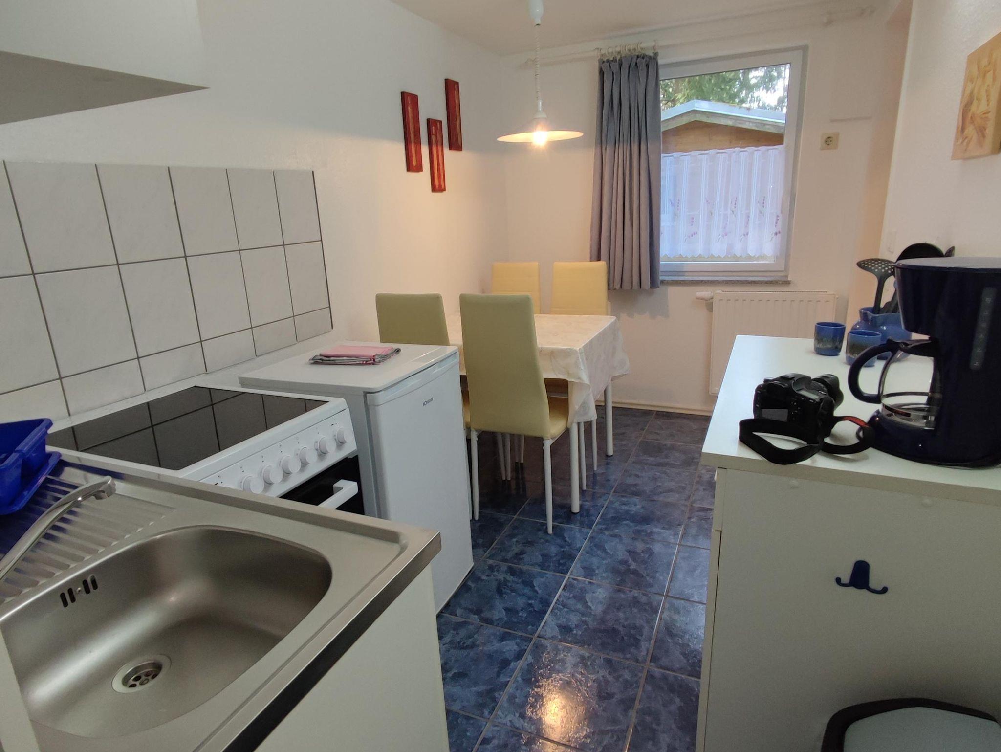 1 Schlafraum mit 1 Ehebett, 1 Schlafraum mit 2 Einzelbetten, Wohnraum mit TV, Bad mit Dusche und WC, Küche mit Herd, Grundausstattung, Kühlschrank, Kaffeemaschine (1x4 Filtermaschine), Toaster, Wasserkocher, Geschirr, Besteck, Gläser, Töpfe, Pfanne. Überdachte Terrasse.
