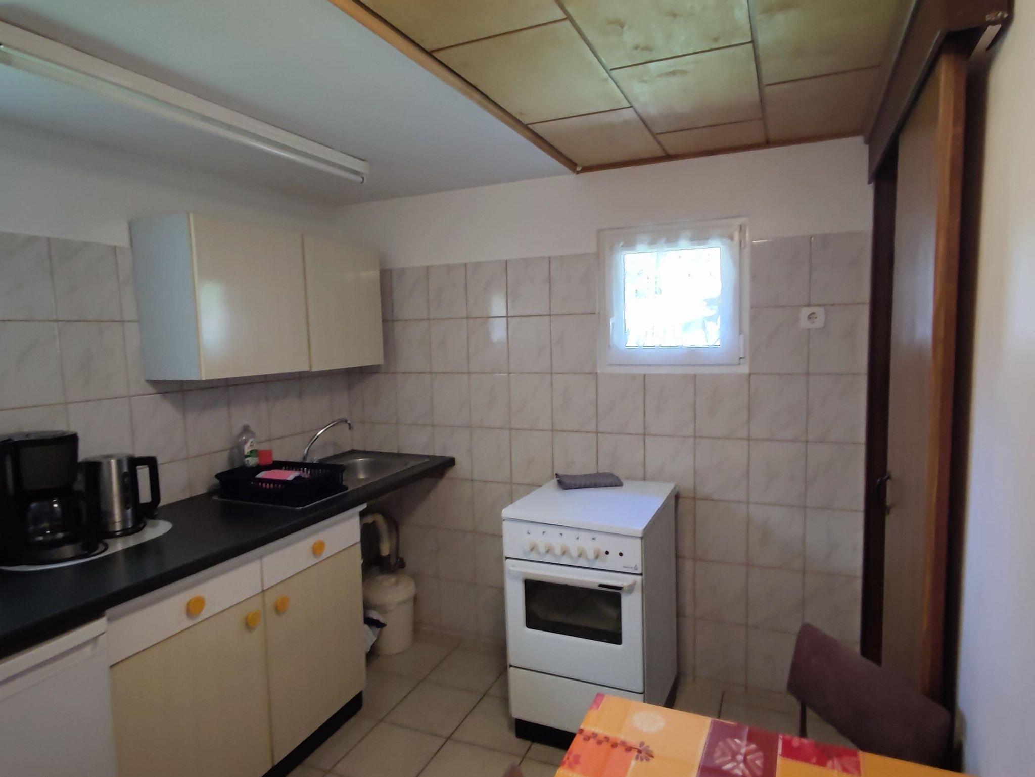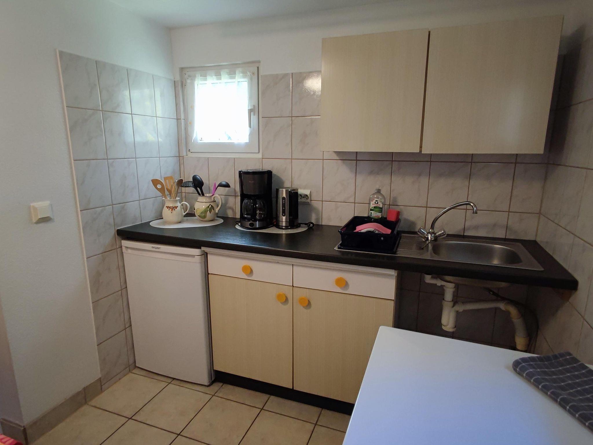 1 Schlafraum mit zwei Einzelbetten, 1 Wohnraum mit Tisch, Couch und Kabel-TV. Kleines Bad mit Dusche, Waschtisch, WC. Küche mit Herd, Backofen, Grundausstattung, Kühlschrank, Kaffeemaschine (1x4 Filtermaschine), Toaster, Wasserkocher, Geschirr, Besteck, Gläser, Töpfe, Pfanne. Überdachte Terrasse.