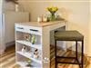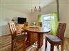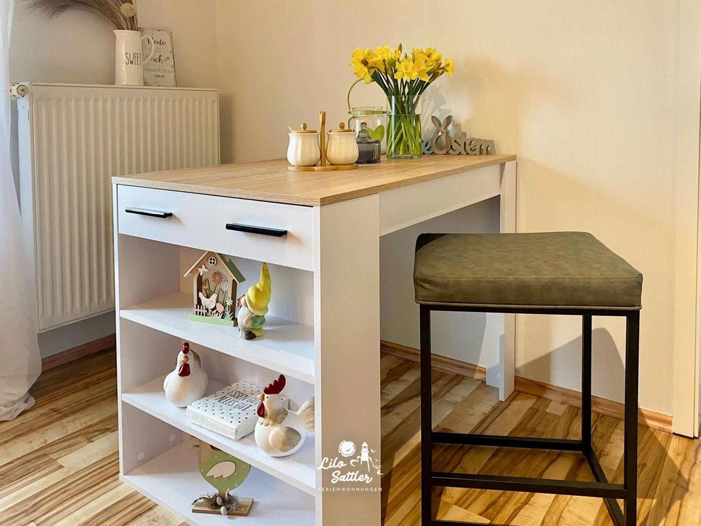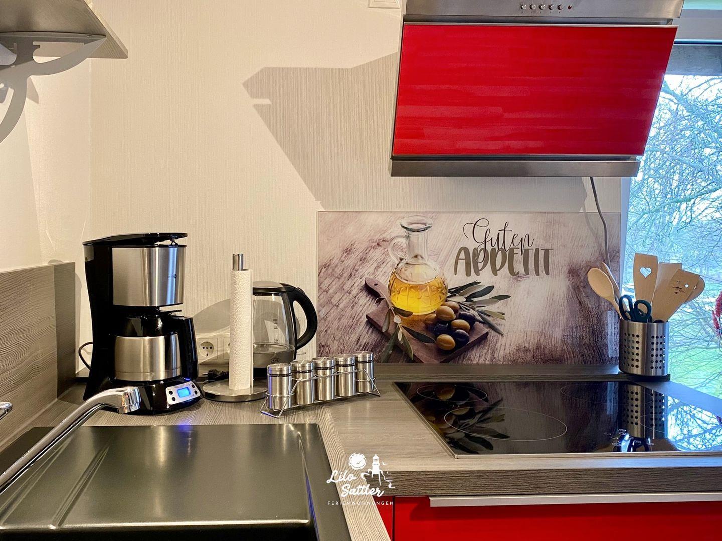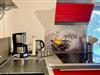 Backofen, Ceranfeld, Abzug, Kühlschrank, Spüle, Kaffeemaschine, Wasserkocher, Toaster, Esstisch mit Stühlen