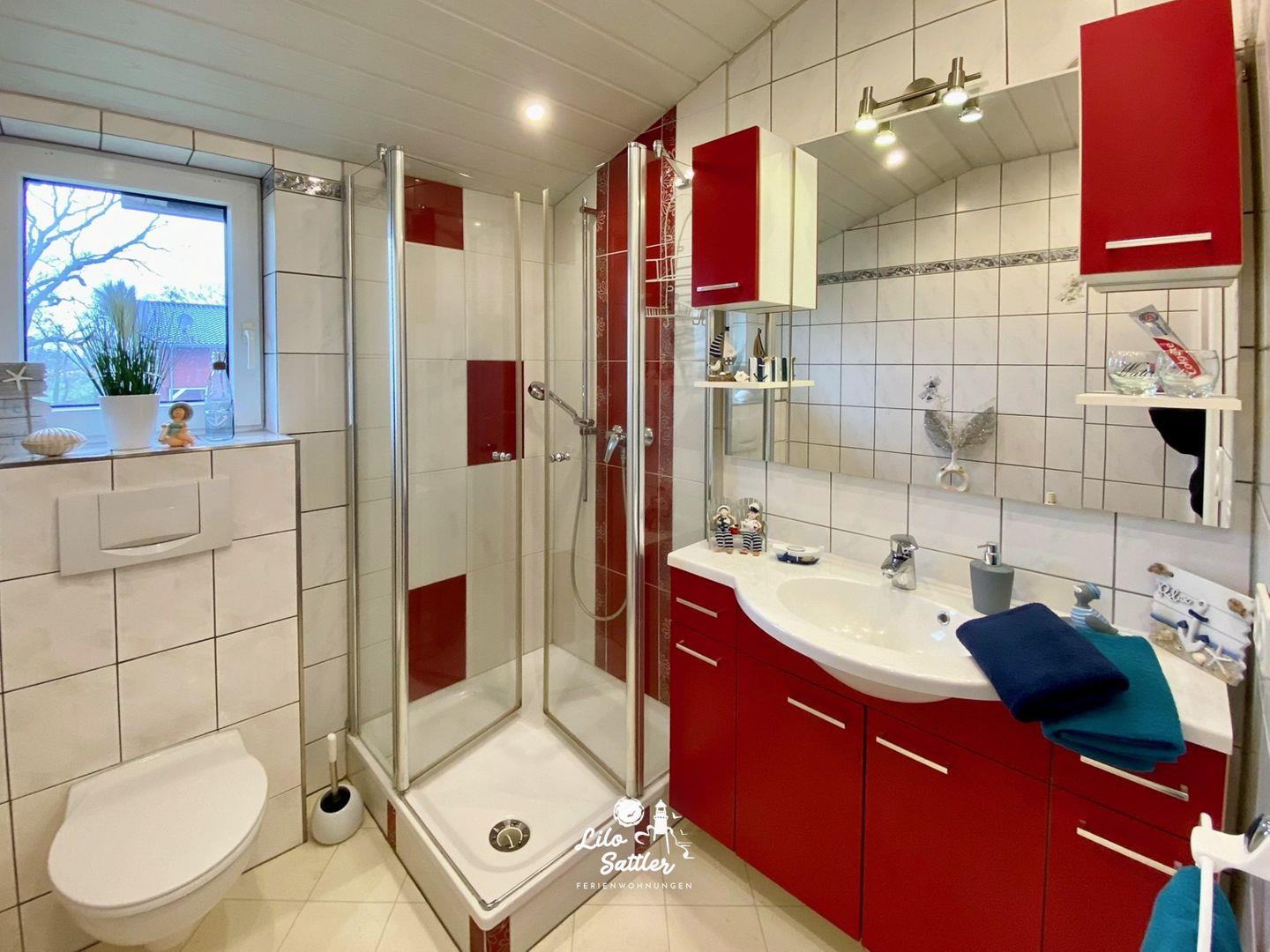 Dusche, WC, Spiegel, Waschtisch, Schränke, Fenster