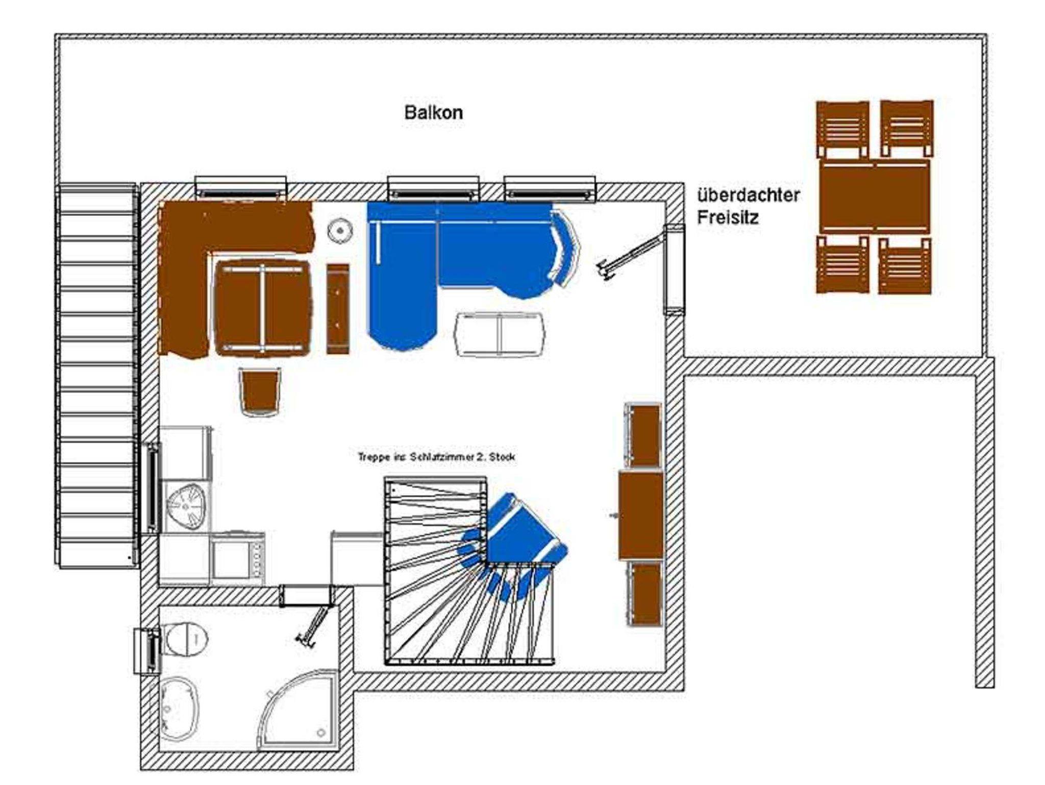 Telefon, SAT-TV (im Schlafzimmer und Wohnzimmer), Internetzugang im Apartment. Großer Freisitz, beide Balkone im Schlaf- und Wohnzimmer sind nach Süden ausgerichtet. Doppelbett im 2. Stock unter dem Dach.