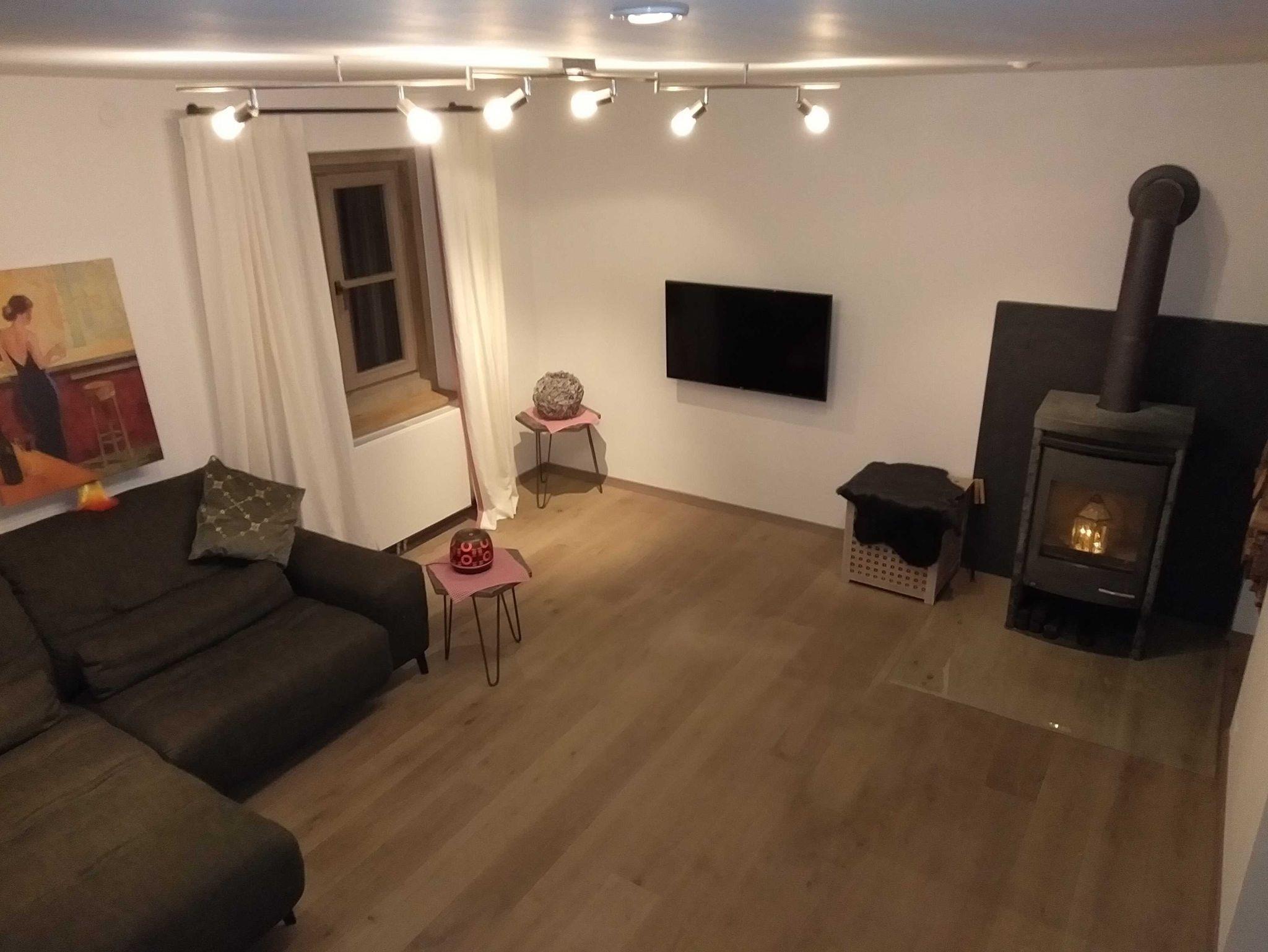 Im Wohnzimmer befinden sich ein Kaminofen sowie ein großer Flachbildfernseher. Die moderne Küche mit Kochinsel ist mit Herd, Backofen, Mikrowelle, Kaffeemaschine und Spülmaschine ausgestattet.