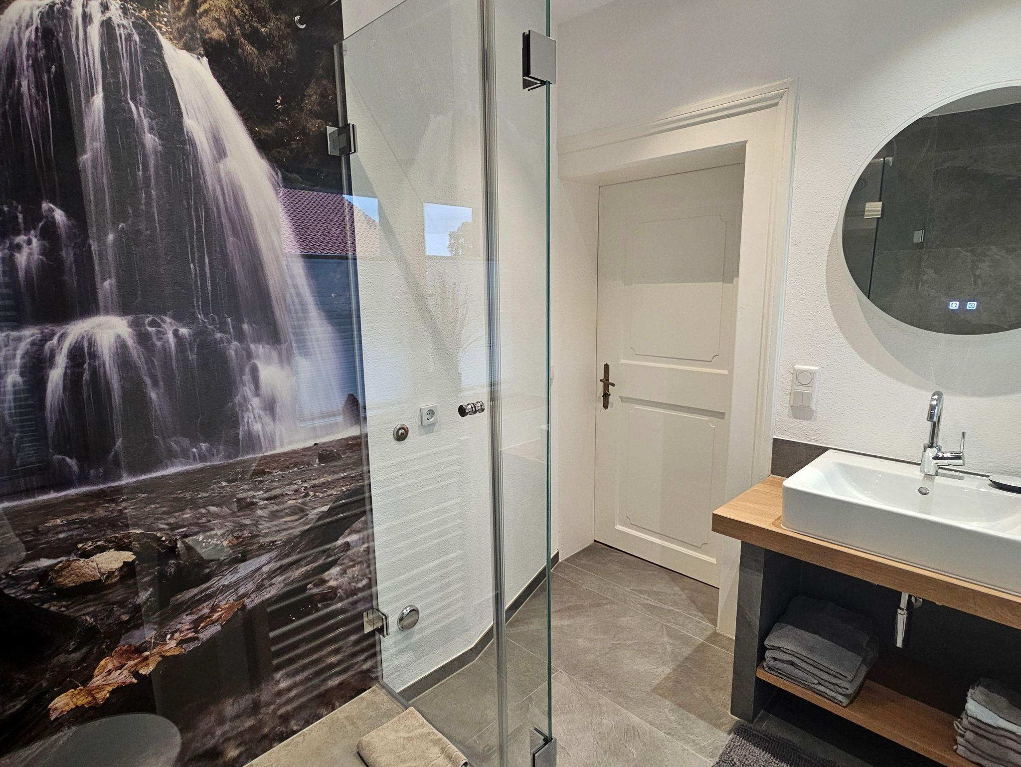 Das Wellnessbad lädt mit Regendusche und großzügigen Waschbereich und Fenstern zum Wohlfühlen ein.