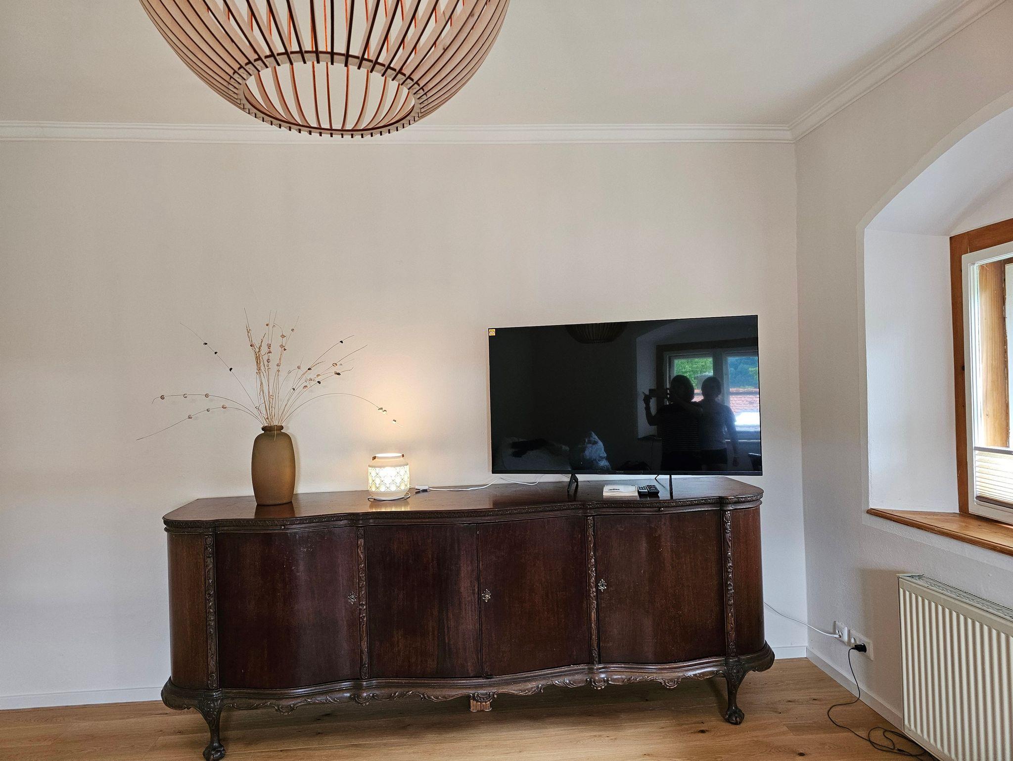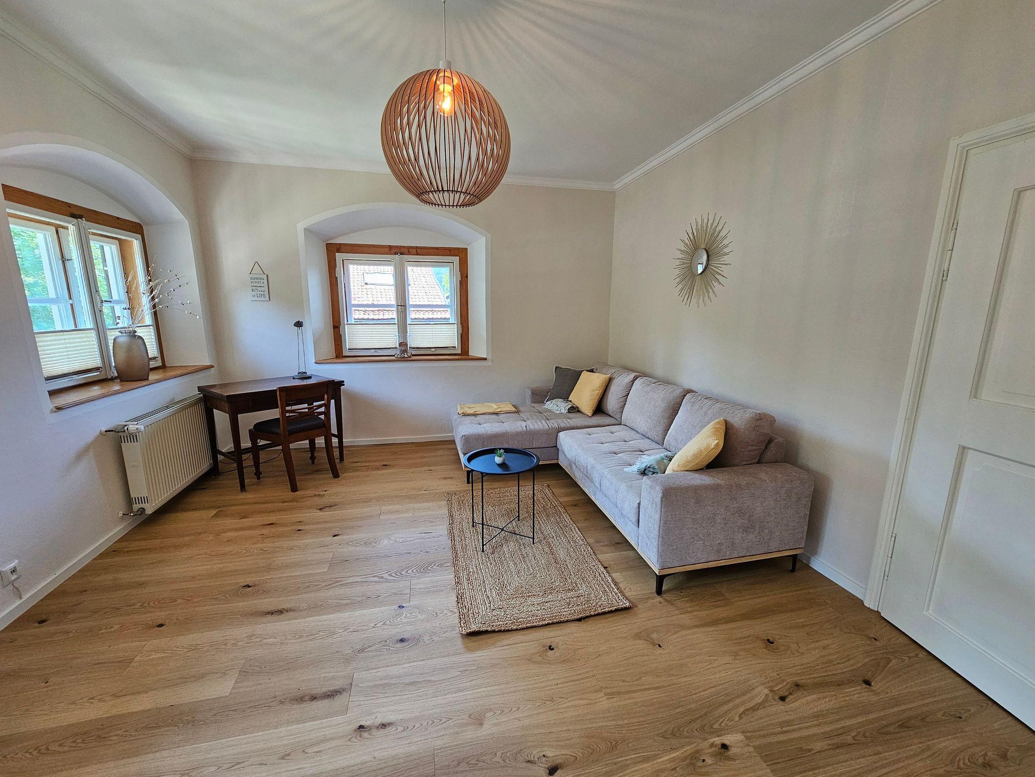 Unsere kernsanierte Ferienwohnung im historischen Landhaus verfügt über ein helles Wohnzimmer mit einem modernen L-Schlafsofa und großzügigem TV und hat einen traumhafen Berg- und Seeblick, 1 Schlafzimmer mit Doppelbett, ein kleines Einzelzimmer bzw. Kinderzimmer, ein modernes Wellness-Badezimmer mit Fußboden- und Handtuchheizung, eine voll ausgestattete Küche mit Essbereich, einen Schreibtisch mit Home-Office Möglichkeit und einen umgehenden Balkon mit Süd- und Westausrichtung mit Blick auf den See und in die Berge.