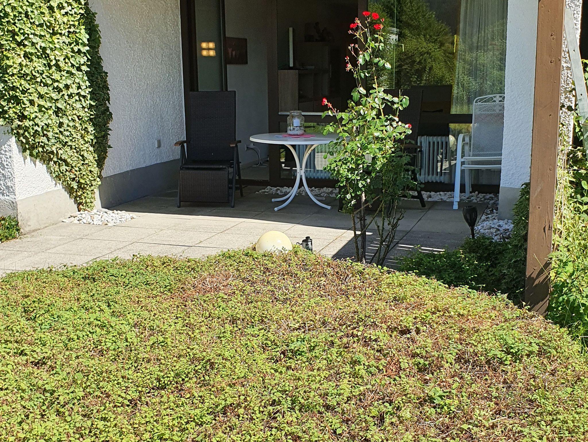 Ferienwohnung mit Miniküche, Badezimmer und sehr schöner teilweise überdachter Terrasse. Eigener PKW-Stellplatz.