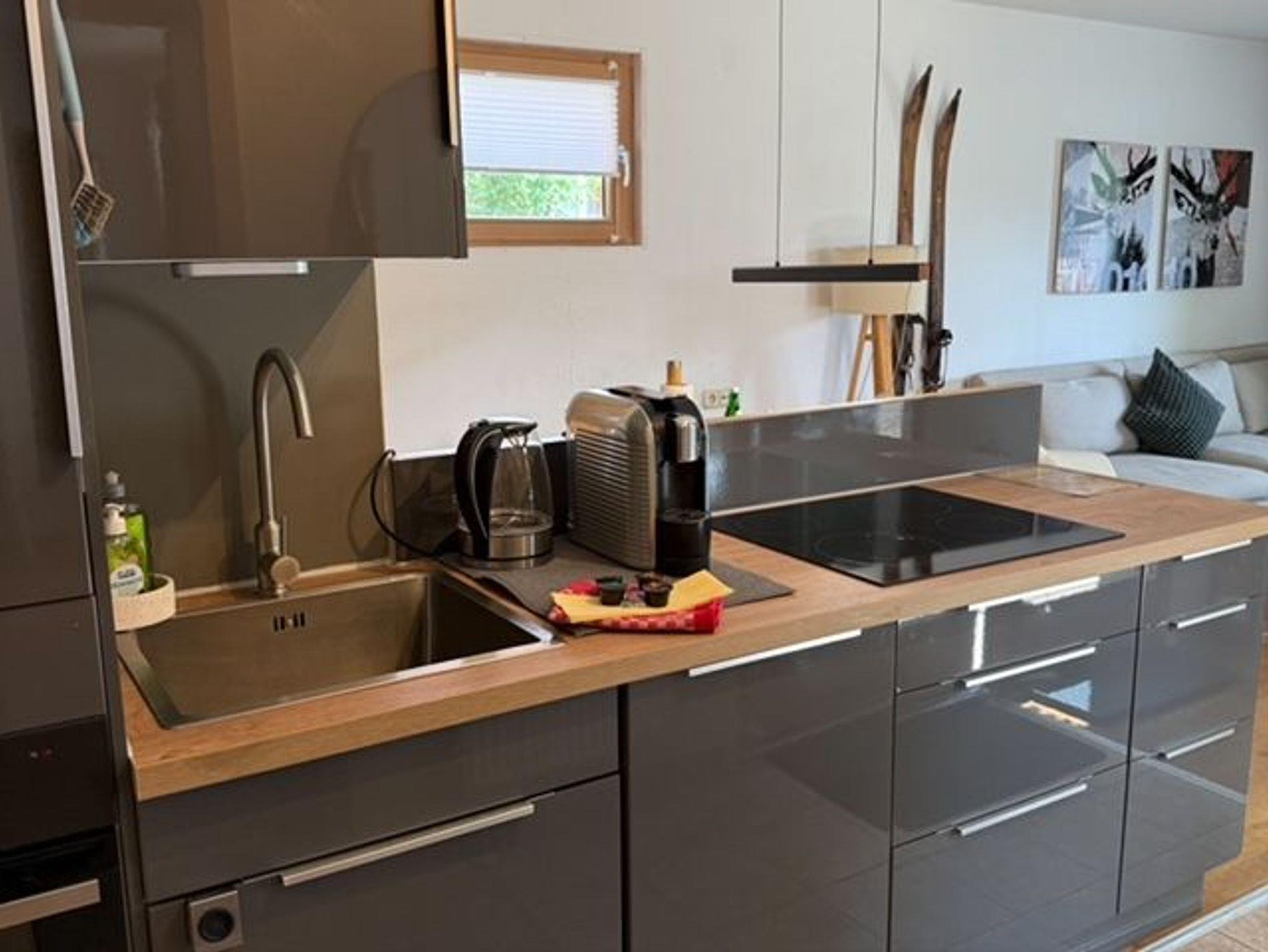 -vollausgestattete Küchenzeile mit Kapselkaffeemaschine und French Press Kaffeebereiter, Wasserkocher, Geschirrspüler, Kühlschrank mit Gefrierfach, Herd und Backofen