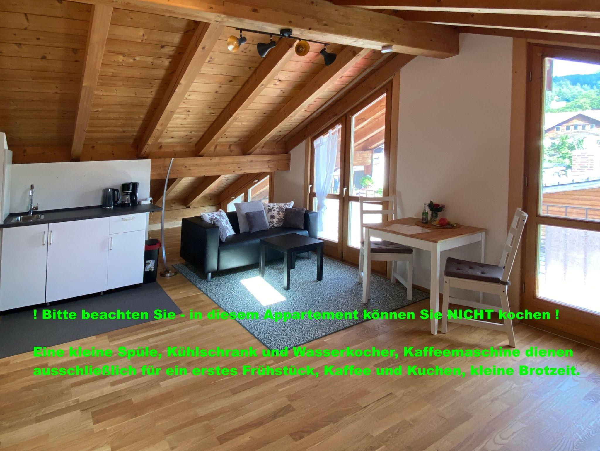 In diesem Appartement dienen die kleine Spüle, Kühlschrank, Kaffeemaschine und Wasserkocher ausschließlich für ein erstes Frühstück, Kaffee und Kuchen oder eine kleine kalte Brotzeit. Für das tägliche Kochen ist das Appartement weder ausgestattet noch geeignet.