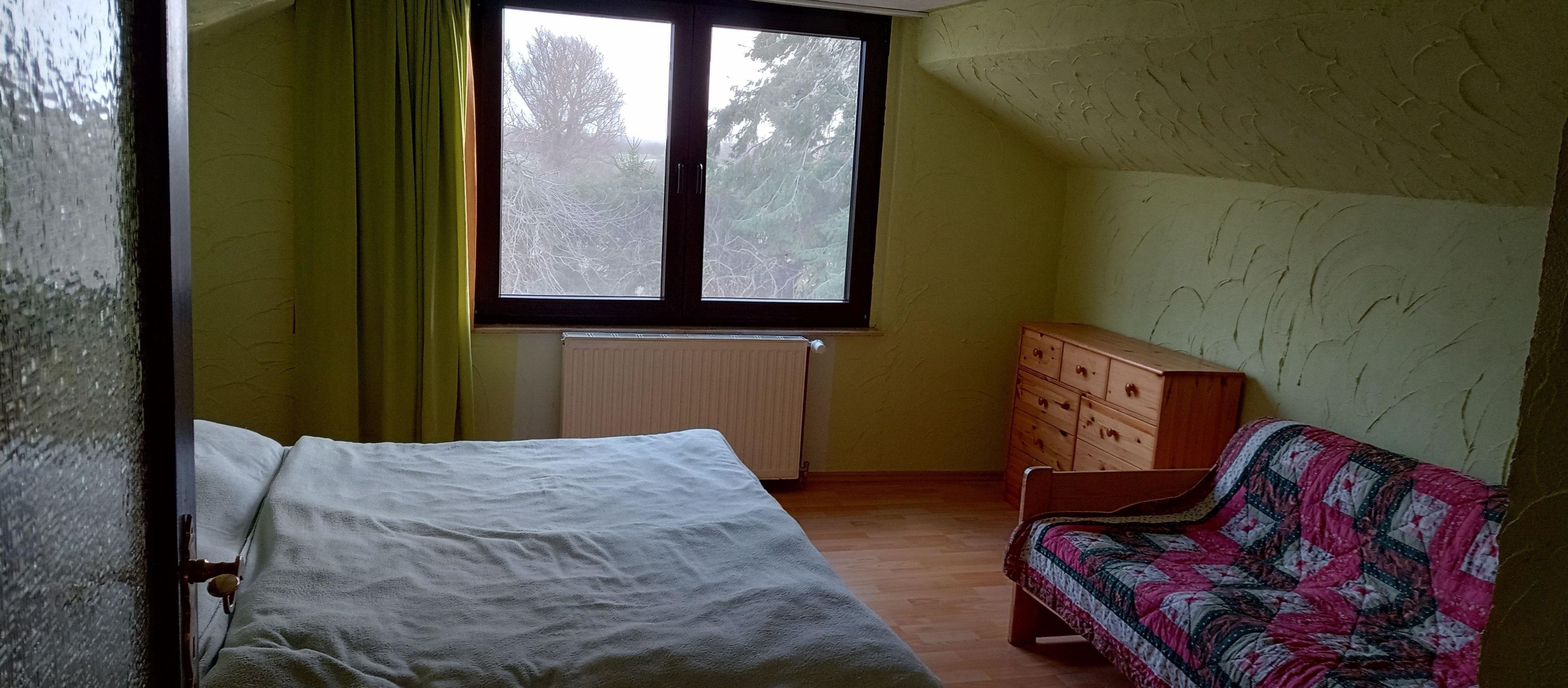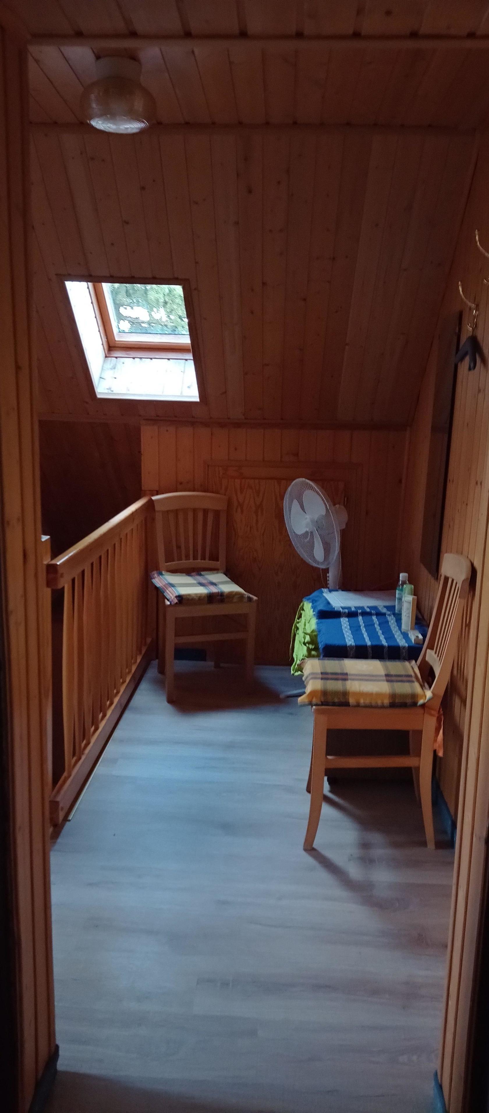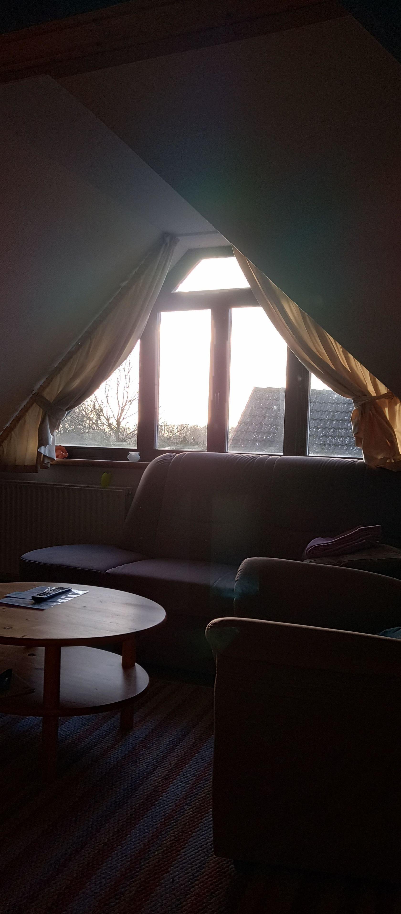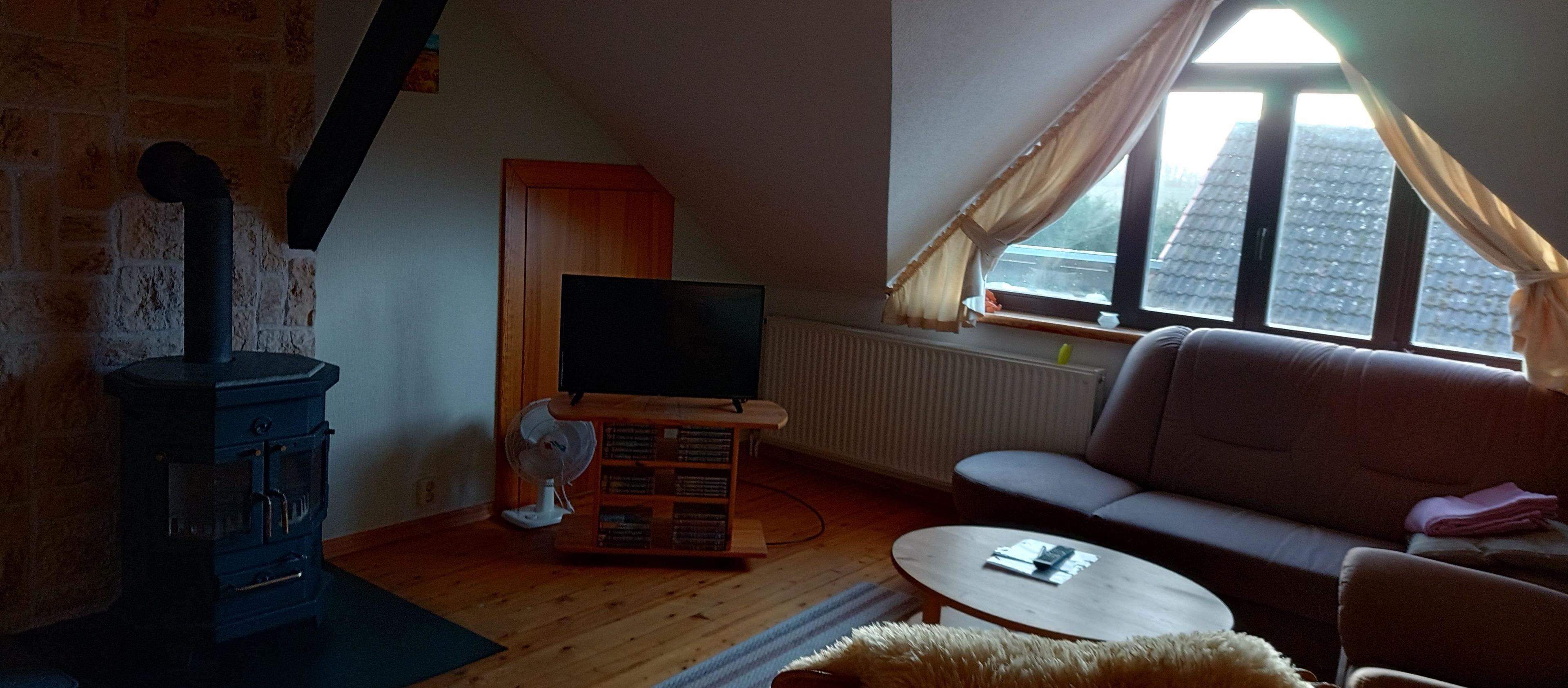 Die Ferienwohnung im Dachgeschoss mit schrägen Wänden verfügt über ein Wohnzimmer mit 25 qm mit Tv,Radio,Kaminofen,Sofa und Sessel.Im ca 10 qm großen Schlafzimmer finden bis zu drei Personen in Doppel-und Kojenbett Erholung.Bettwäsche wird gestellt.Die Küche verfügt über eine Singleküche mit 2-Flammen-Elektroherd,Kühlschrank mit Eisfach, Mikrowelle,Minibackofen,Wasserkocher,Toaster,Eierkocher,diverses Geschirr und ist ca 10 qm groß