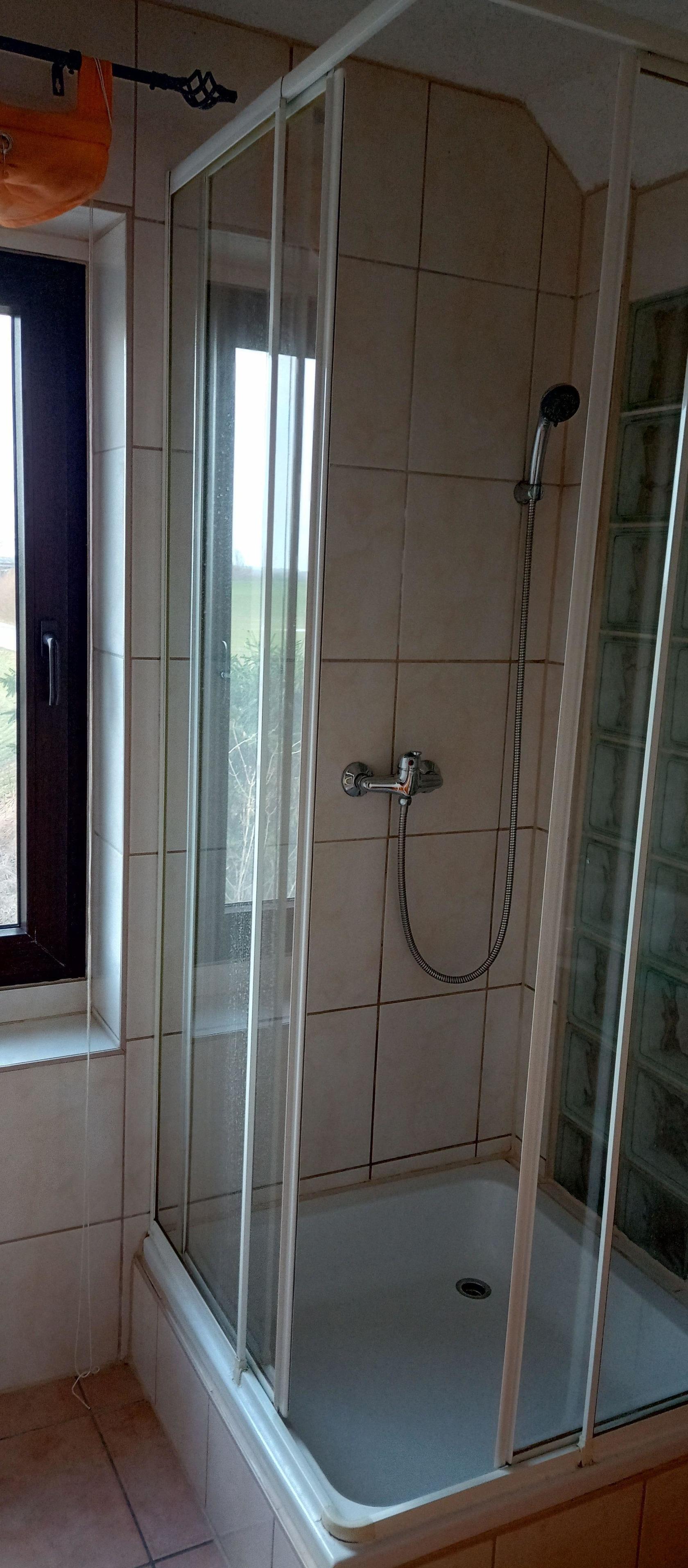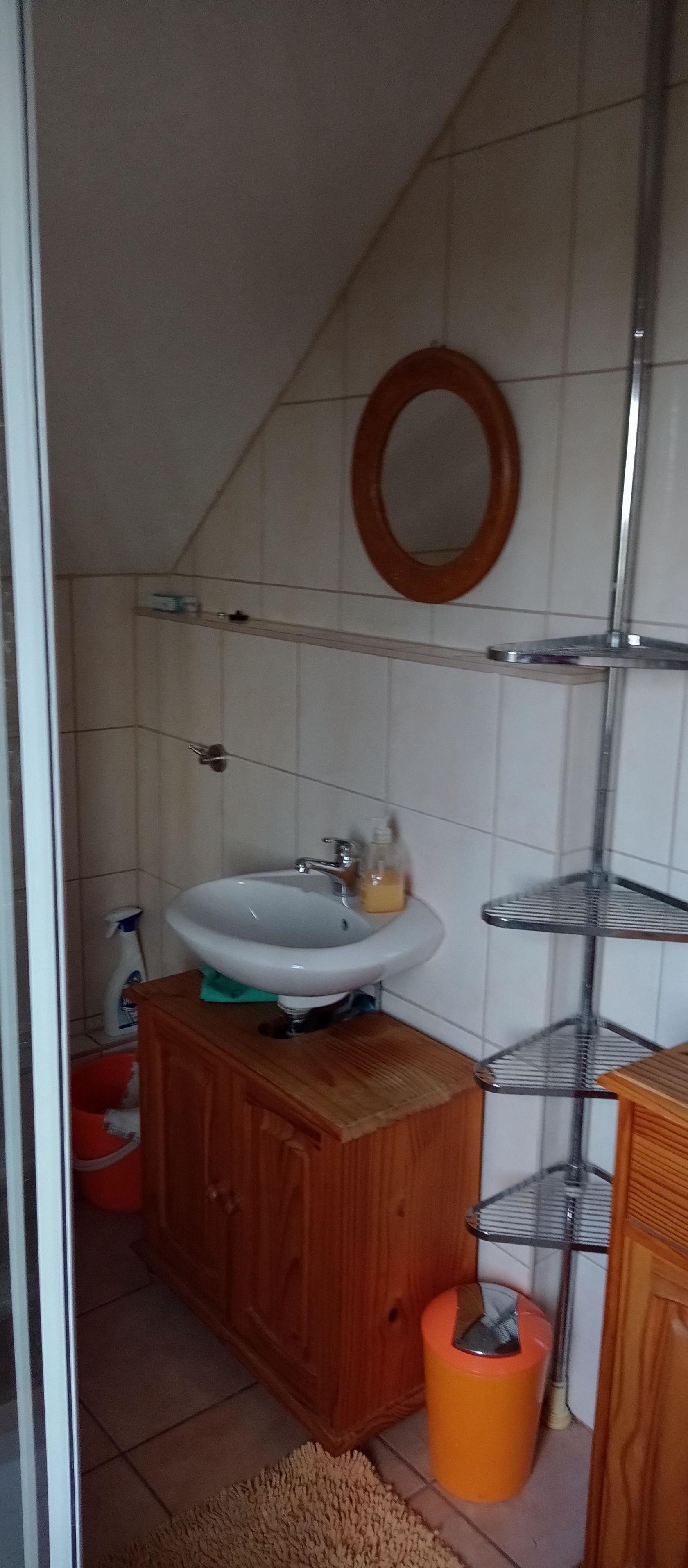 Das Badezimmer ist ca.4 qm groß und verfügt über WC Duschkabine Handwaschbecken Fön . Handtücher werden gestellt