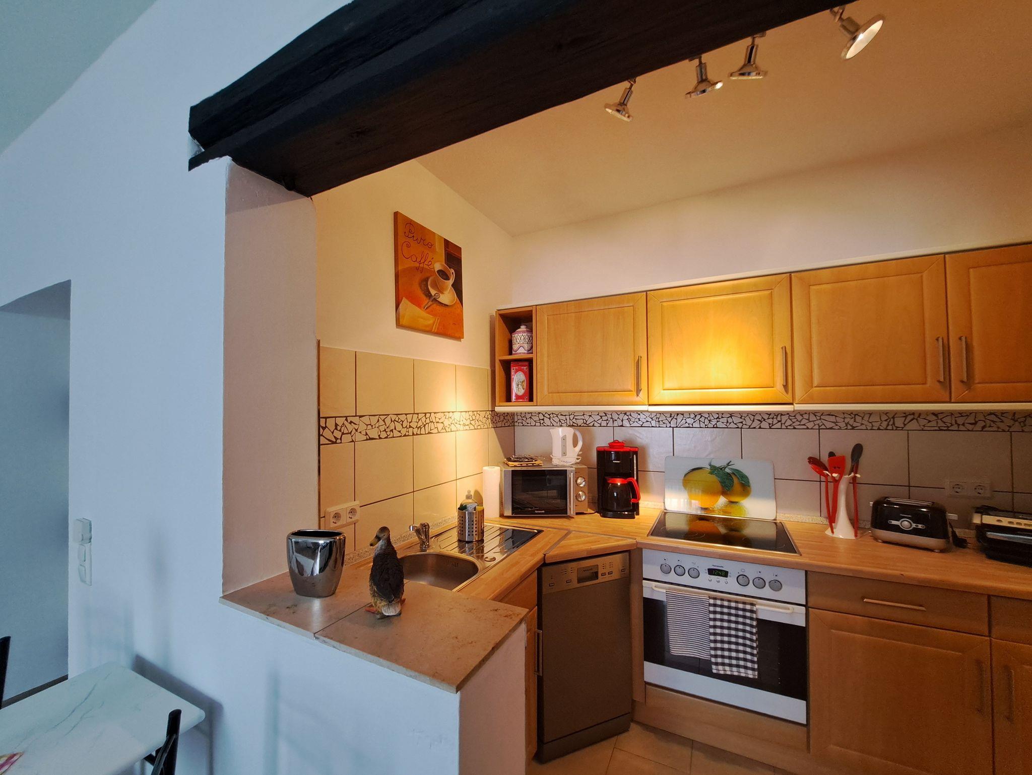 Die Ferienwohnung empfängt Sie mit großem Flur, einem Tageslicht-Badezimmer mit Dusche, Badewanne, Waschtisch und WC. Im kombinierten Wohn- und Schlafraum befindet sich ein Doppelbett mit einer 1,80 m Breite, kleinem Esstisch für 2 Personen, 2 Sessel mit Couchtisch, Kamin und Flach-TV. Eine Aufbettung (Schlafsessel) kann für ein 1 Kind bis 14 Jahre nach Absprache dazu gestellt werden. Die Einbauküche ist offen zum Wohn-Schlafraum und komplett ausgestattet. Die Ausstattung der Wohnung ist sehr gepflegt, hell und freundlich. Zur Gastgeberfamilie gehört ein kleiner Jack Russel. Für Angler steht ein Boot am Torgelower See nach Absprache zur Verfügung (kostenpfl.). Der See ist ca. 3,5 km entfernt.