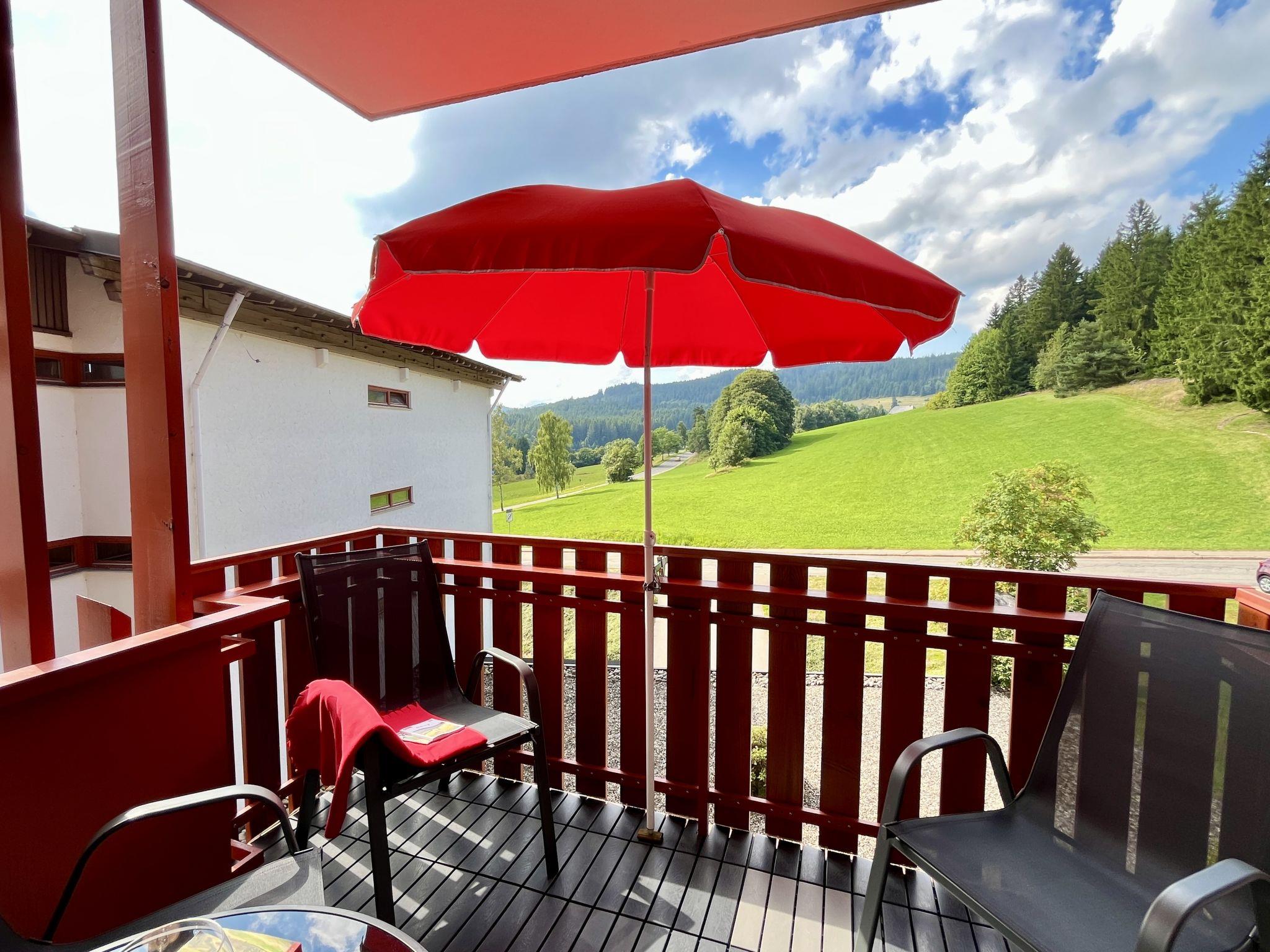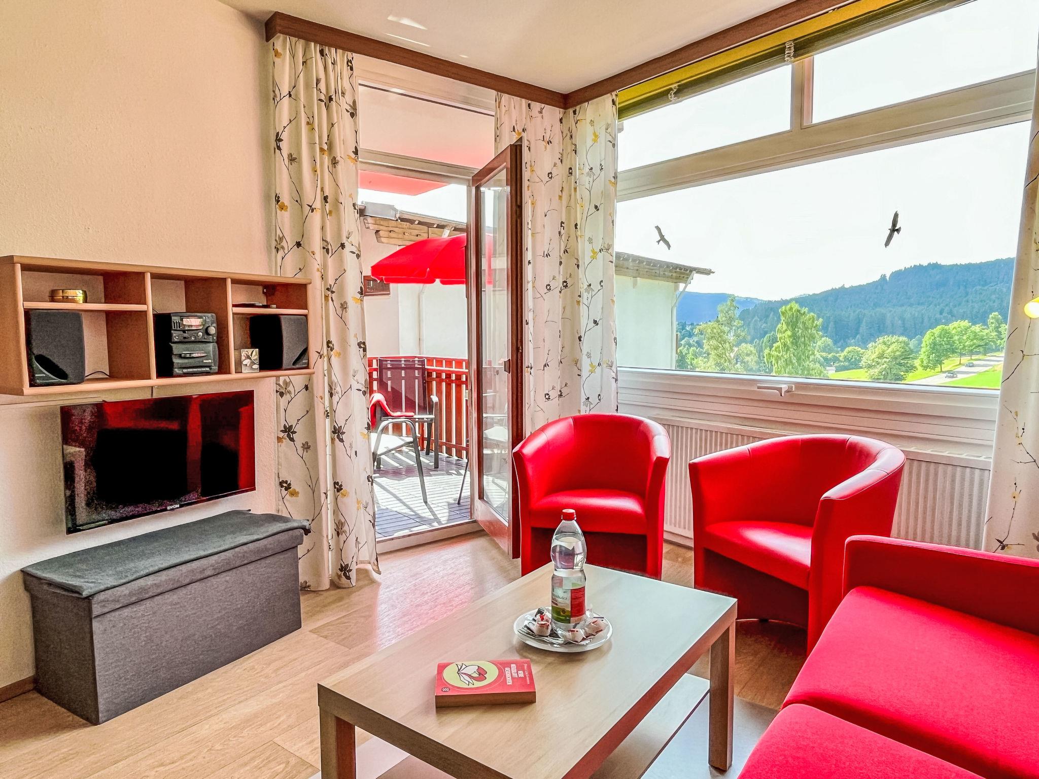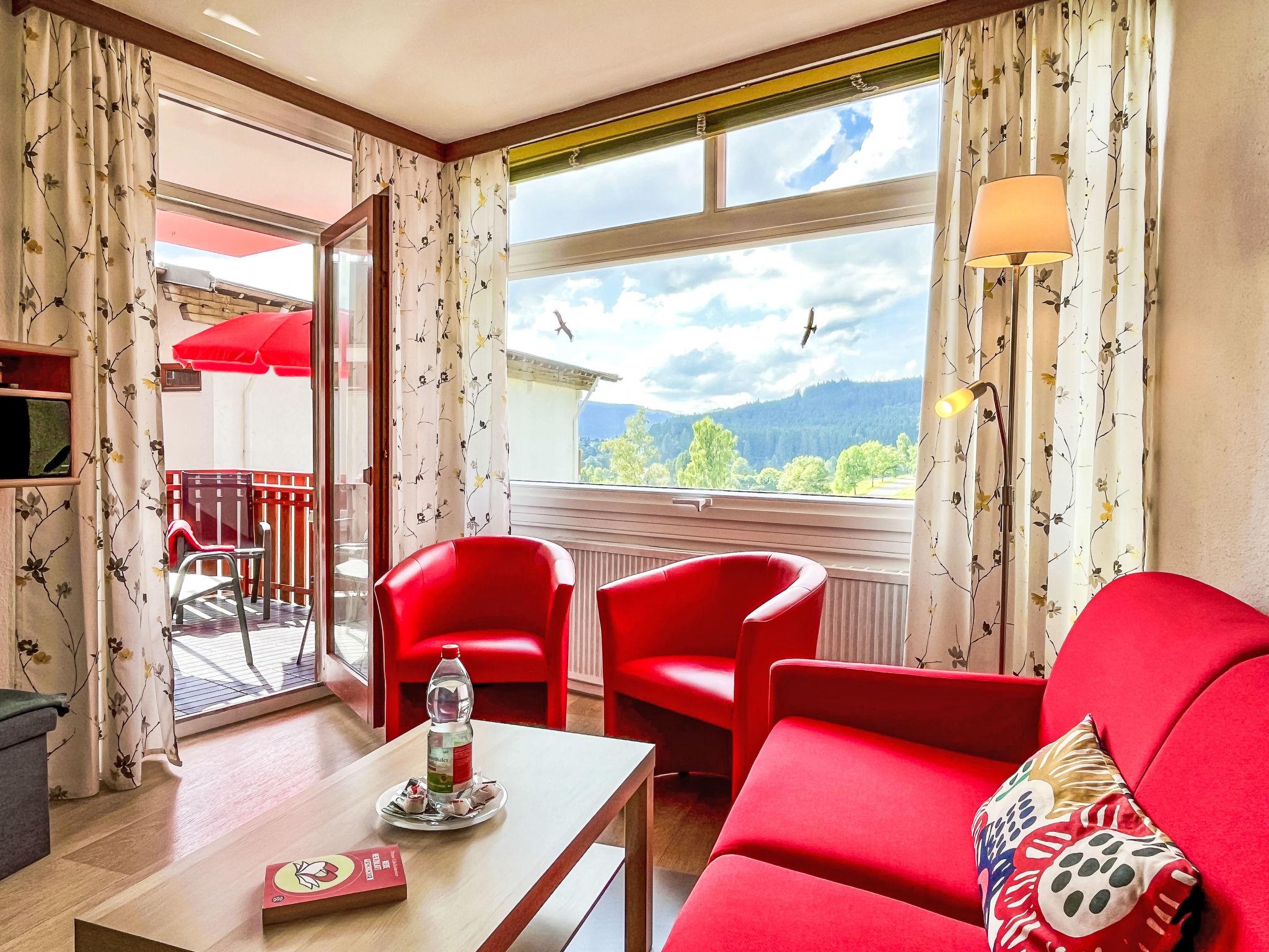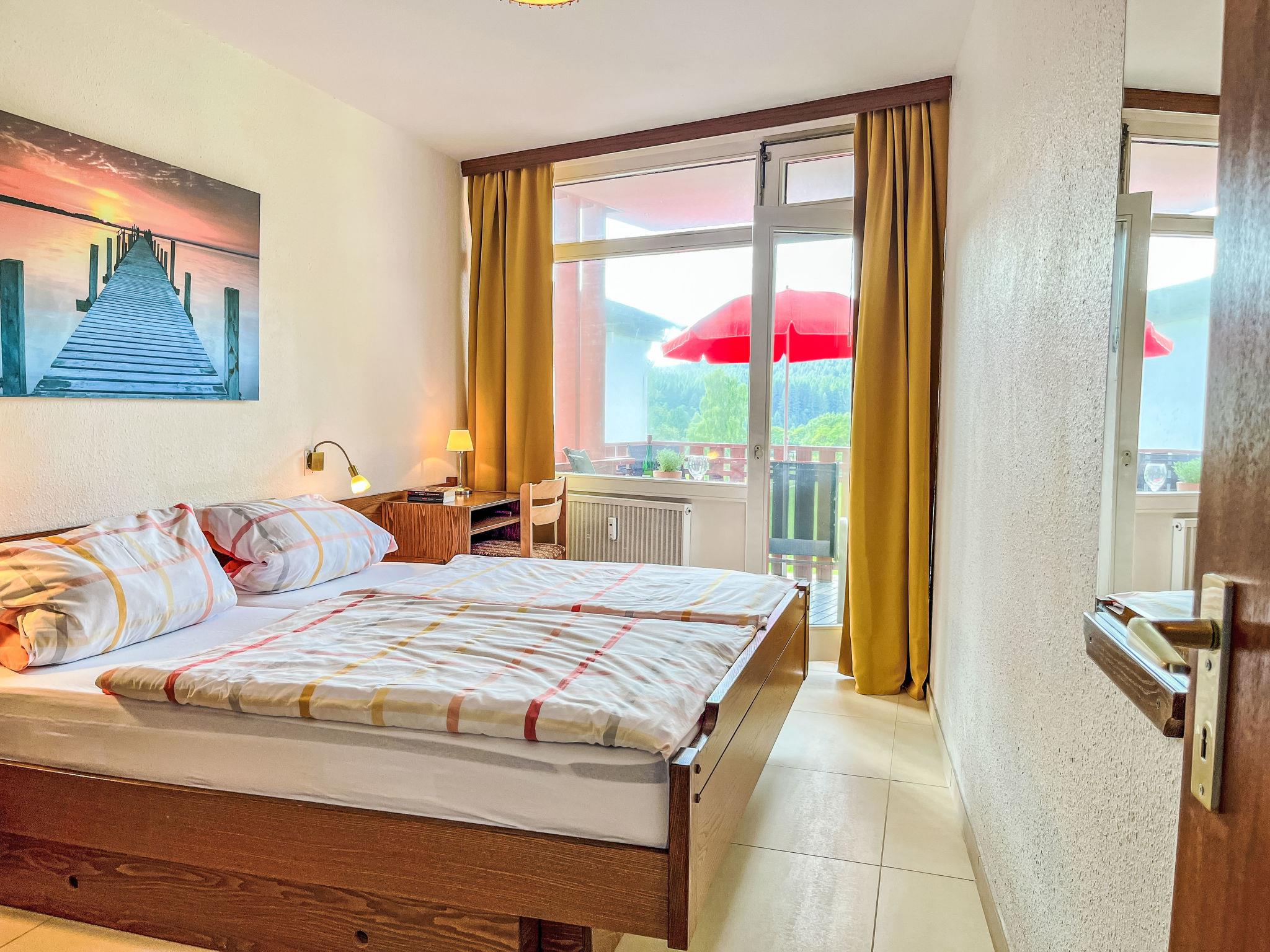 "Schöne Aussicht (App 1406 / EX-Kurhotel)", 2-room apartment 45 m2 on 4th floor. Bright, cosy furnishings: living/dining room with 1 double sofabed and satellite TV (flat screen), hi-fi system and DVD. Exit to the balcony. 1 double bedroom with 1 double bed. Exit to the balcony. Small kitchenette (2 hot plates, microwave, electric coffee machine). Bath/WC. Balcony 6 m2. Balcony furniture. Beautiful view of the countryside and the forest. Facilities: iron, hair dryer. Internet (WiFi, extra). Garage. Please note: fridge without freezer, non-smokers only. Smoke alarm.