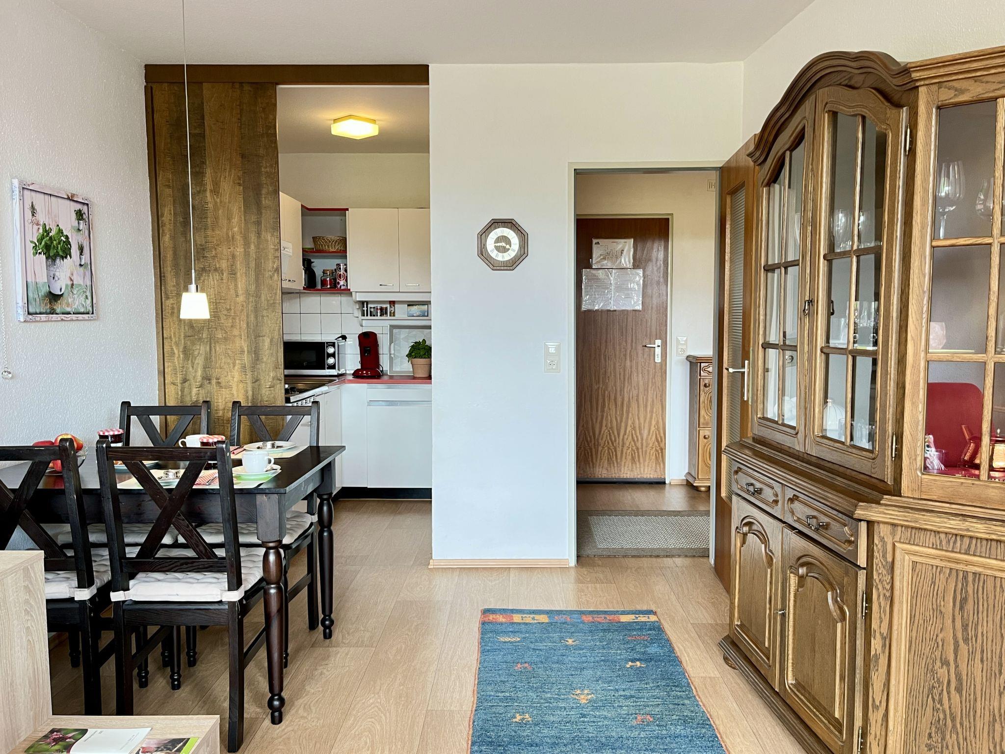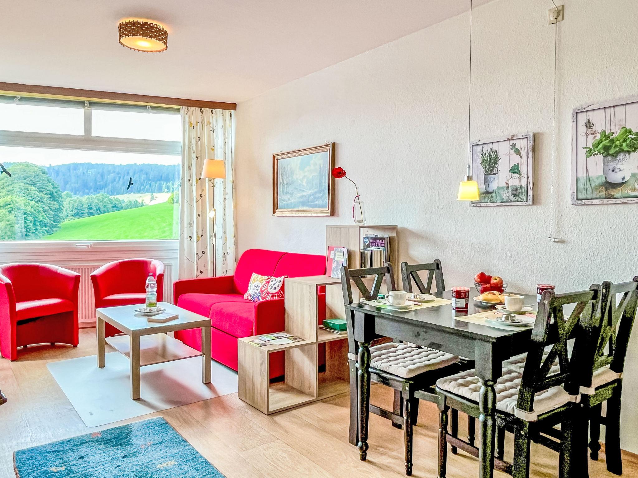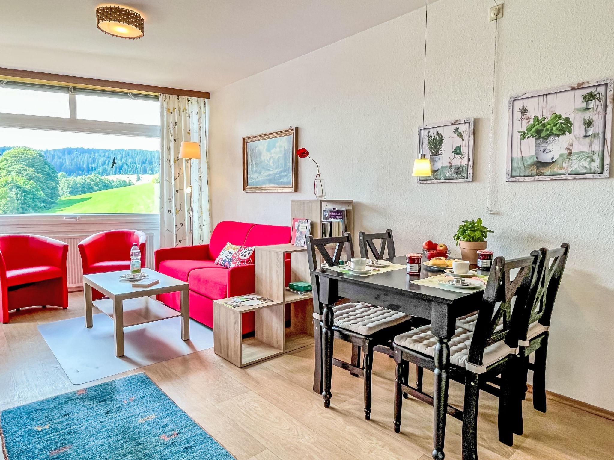 "Schöne Aussicht (App 1406 / EX-Kurhotel)", 2-room apartment 45 m2 on 4th floor. Bright, cosy furnishings: living/dining room with 1 double sofabed and satellite TV (flat screen), hi-fi system and DVD. Exit to the balcony. 1 double bedroom with 1 double bed. Exit to the balcony. Small kitchenette (2 hot plates, microwave, electric coffee machine). Bath/WC. Balcony 6 m2. Balcony furniture. Beautiful view of the countryside and the forest. Facilities: iron, hair dryer. Internet (WiFi, extra). Garage. Please note: fridge without freezer, non-smokers only. Smoke alarm.