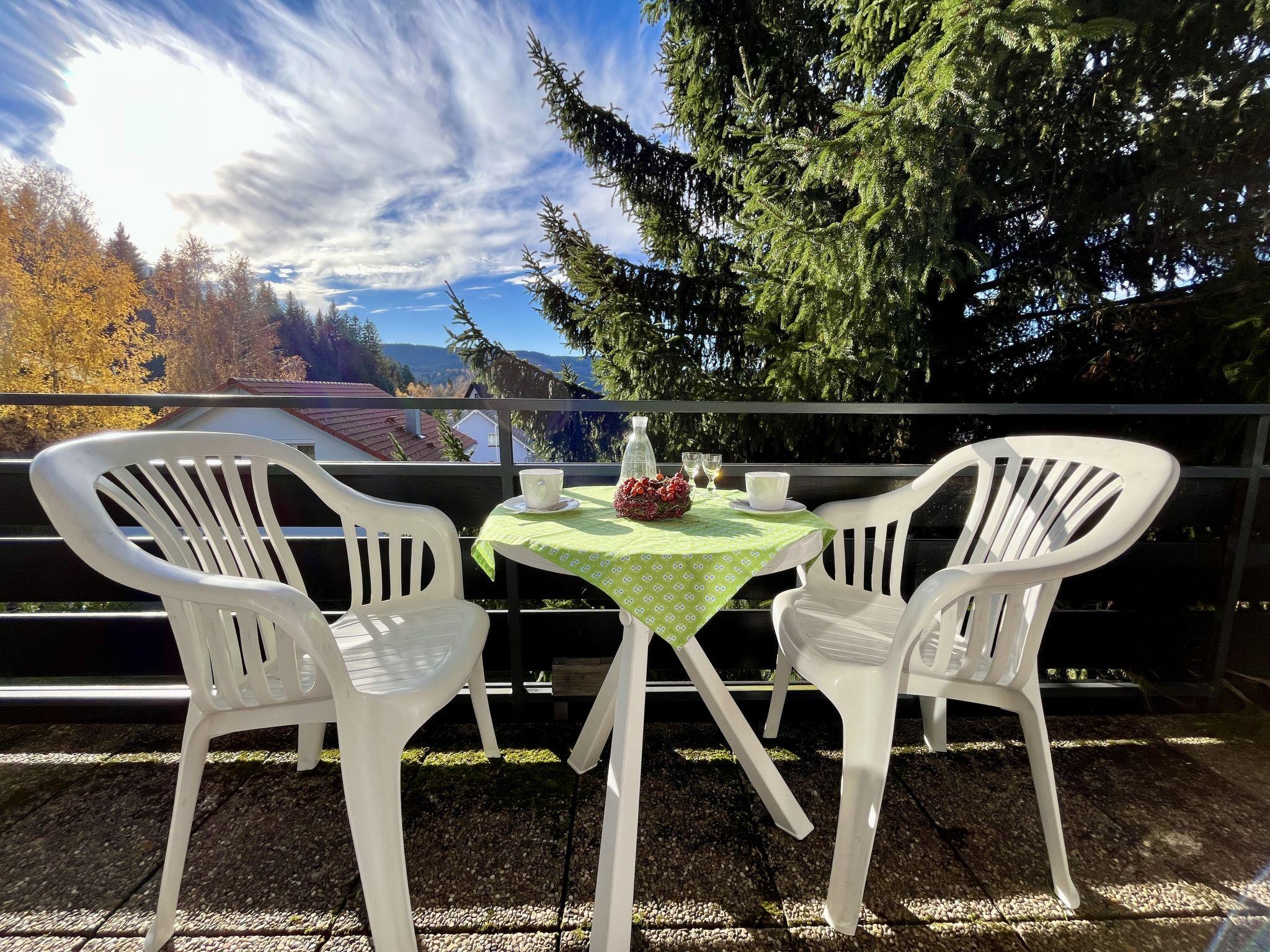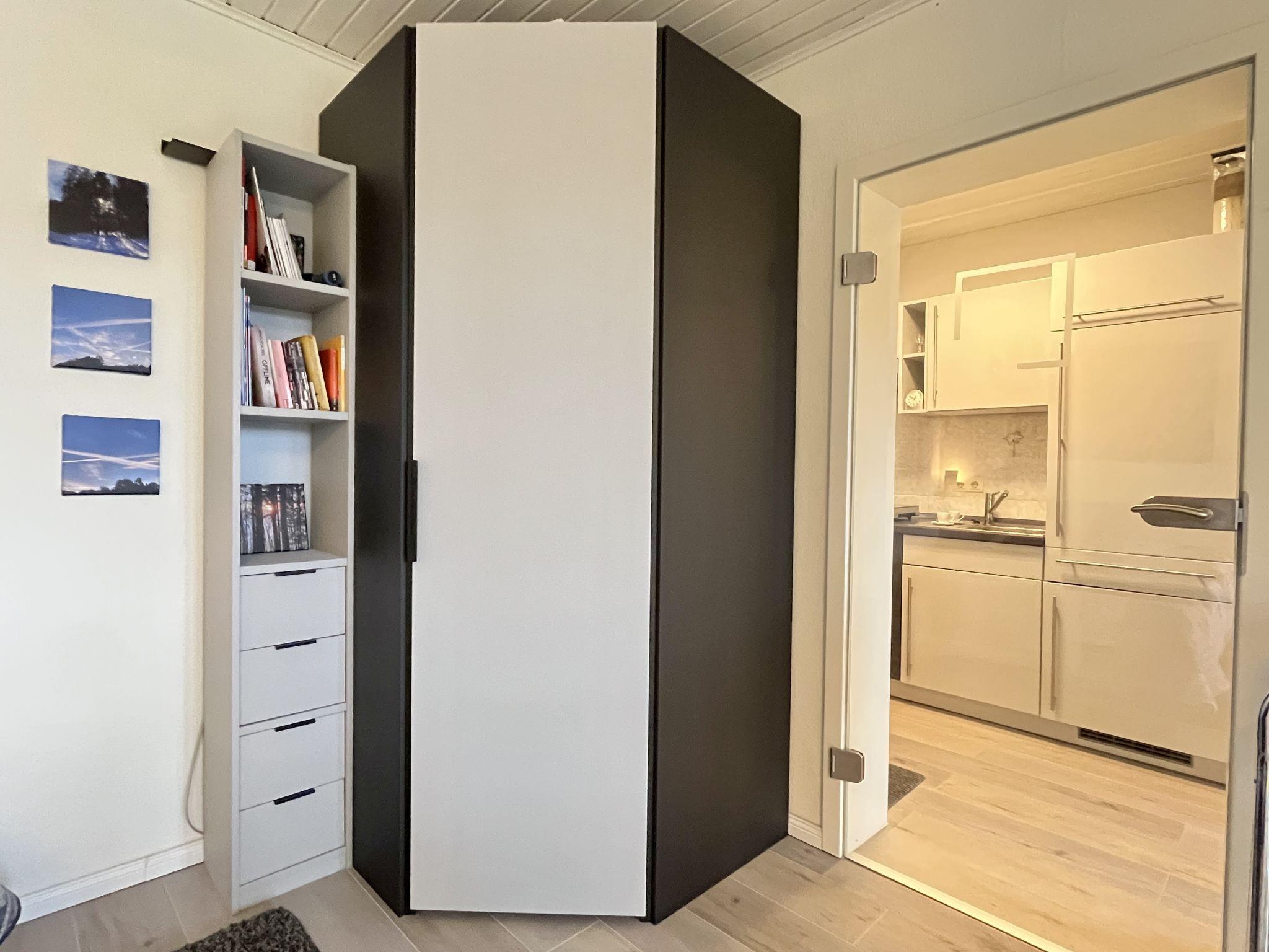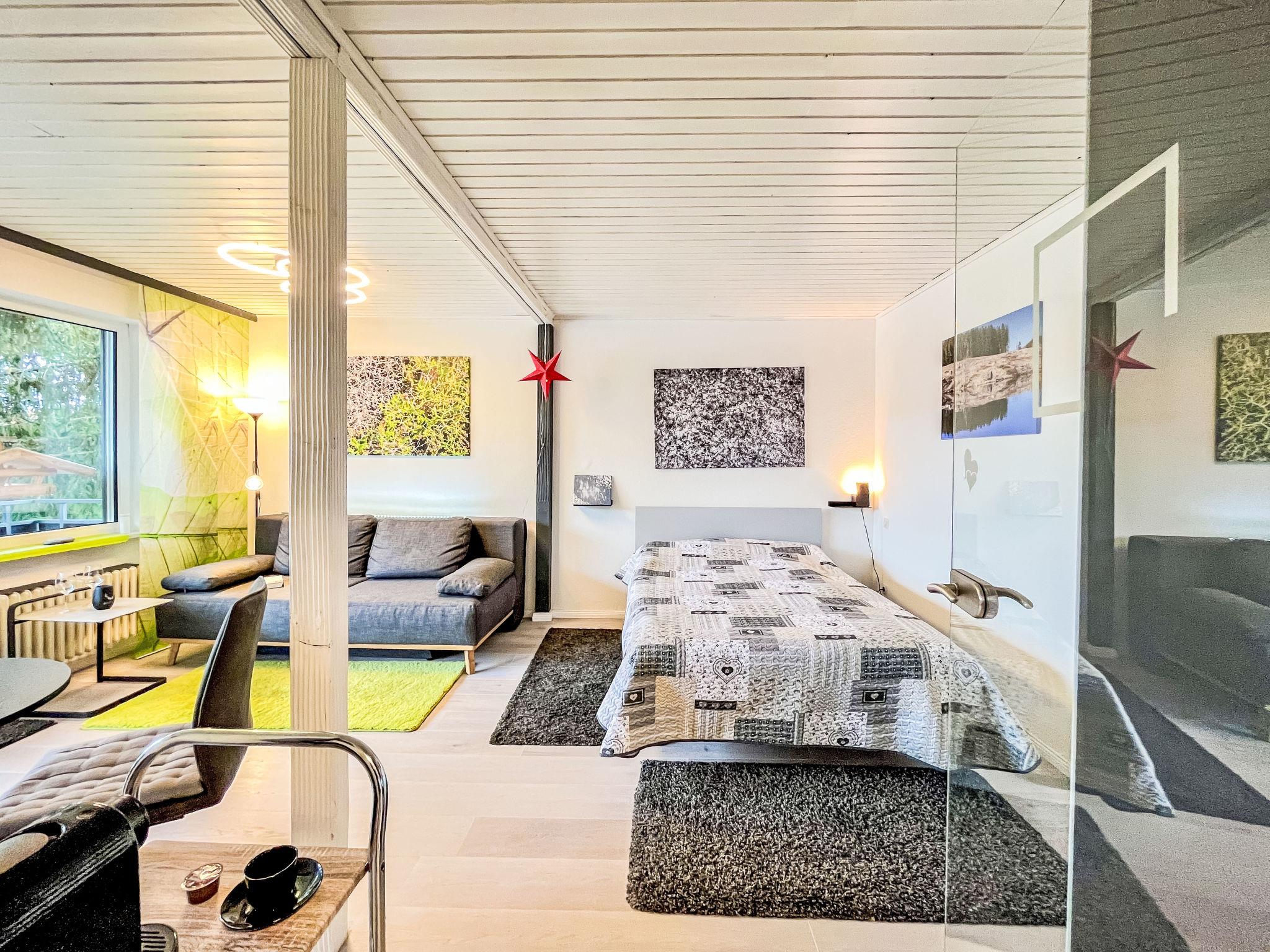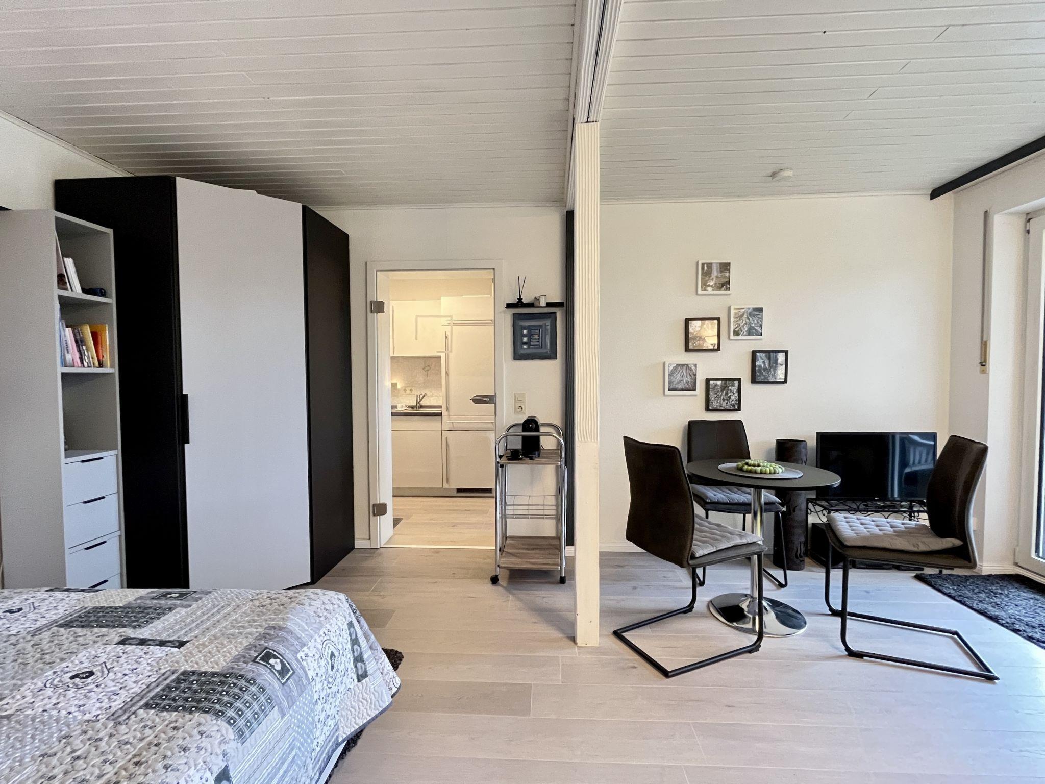 "Sonnige Aussichten", 1-room apartment 35 m2 on 2nd floor. Bright, beautiful and modern furnishings: large living/sleeping room with 1 sofabed (80 cm, length 200 cm), 1 french bed (1 x 140 cm, length 200 cm), dining table and satellite TV (flat screen). Exit to the balcony. Small kitchen in the entrance (mini-oven, 2 induction hot plates, toaster, kettle, grill, electric coffee machine). Shower/WC. Heating. Large balcony 12 m2. Balcony furniture, deck chairs (1). Beautiful view of the lake, the garden, the resort and the forest. Facilities: Internet (WiFi, free). Garage at the house. Please note: non-smokers only. Maximum 2 pets/ dogs allowed. Smoke alarm, fire extinguisher. Two dog baskets and two bowls are available. The coffee machine is a capsule coffee machine.