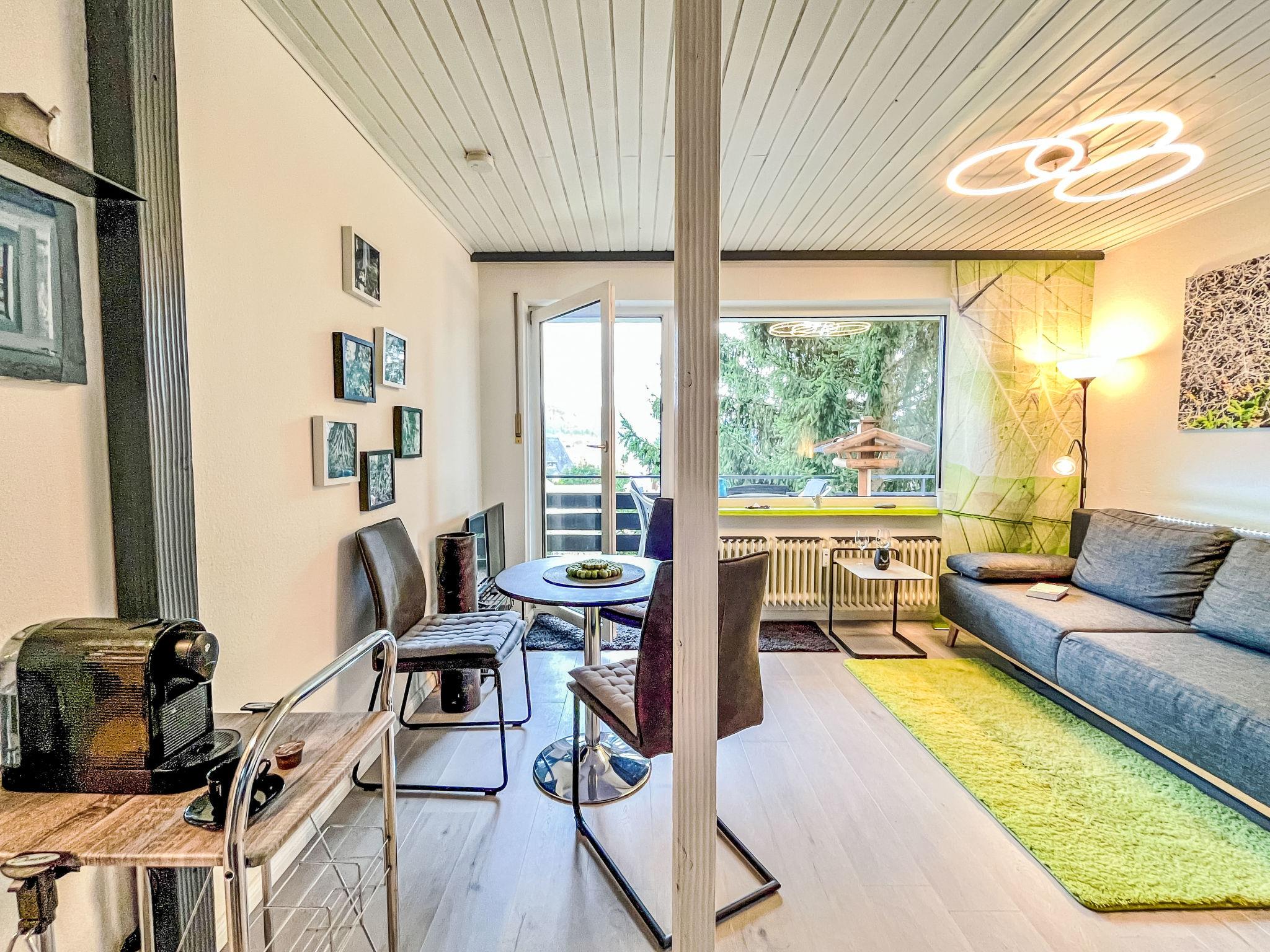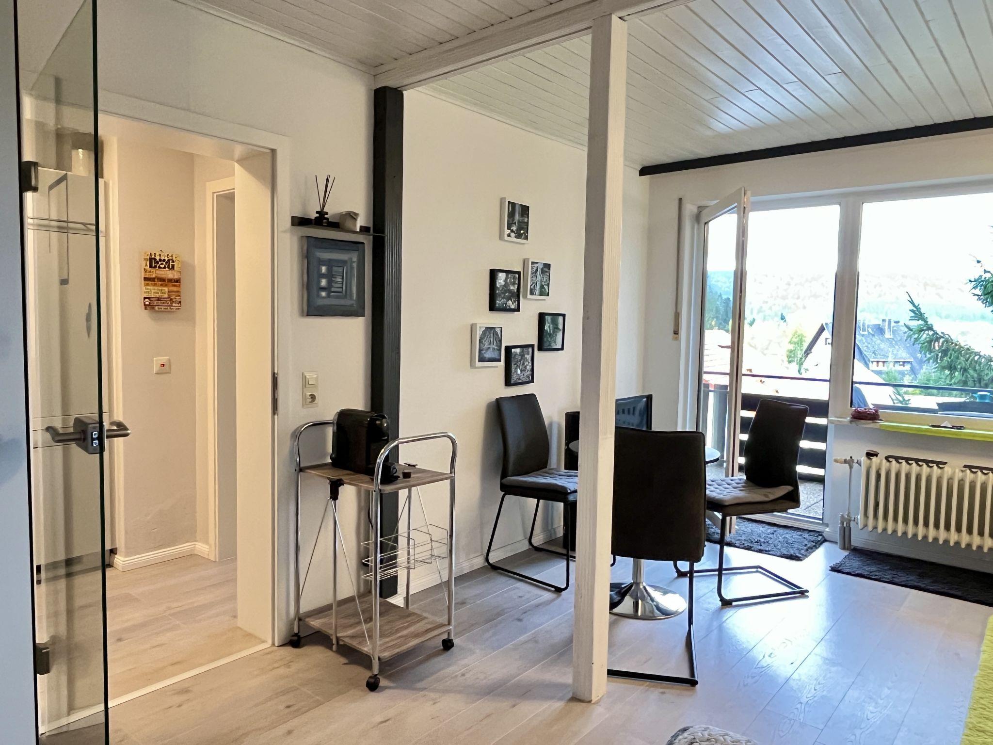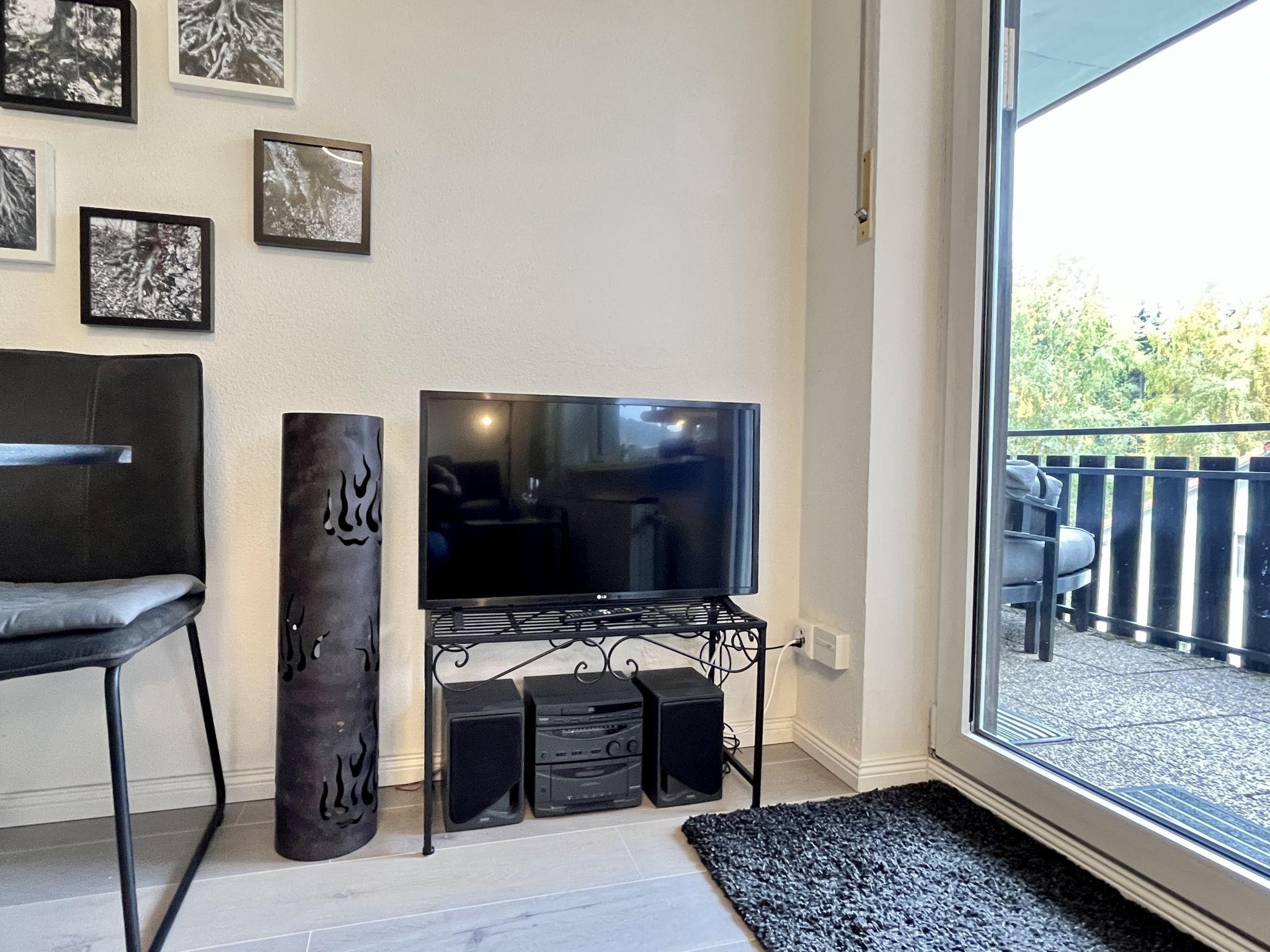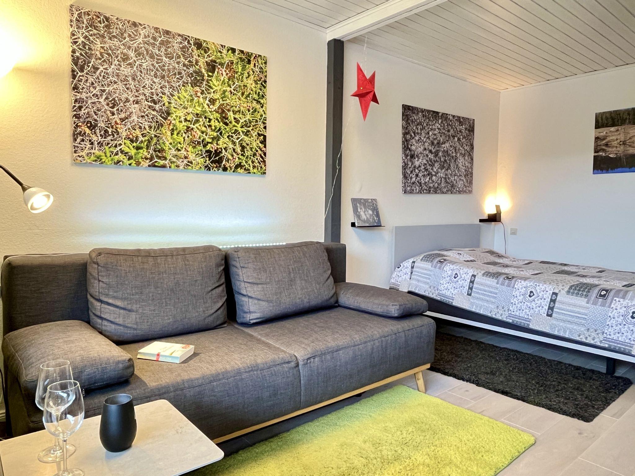 "Sonnige Aussichten", 1-room apartment 35 m2 on 2nd floor. Bright, beautiful and modern furnishings: large living/sleeping room with 1 sofabed (80 cm, length 200 cm), 1 french bed (1 x 140 cm, length 200 cm), dining table and satellite TV (flat screen). Exit to the balcony. Small kitchen in the entrance (mini-oven, 2 induction hot plates, toaster, kettle, grill, electric coffee machine). Shower/WC. Heating. Large balcony 12 m2. Balcony furniture, deck chairs (1). Beautiful view of the lake, the garden, the resort and the forest. Facilities: Internet (WiFi, free). Garage at the house. Please note: non-smokers only. Maximum 2 pets/ dogs allowed. Smoke alarm, fire extinguisher. Two dog baskets and two bowls are available. The coffee machine is a capsule coffee machine.
