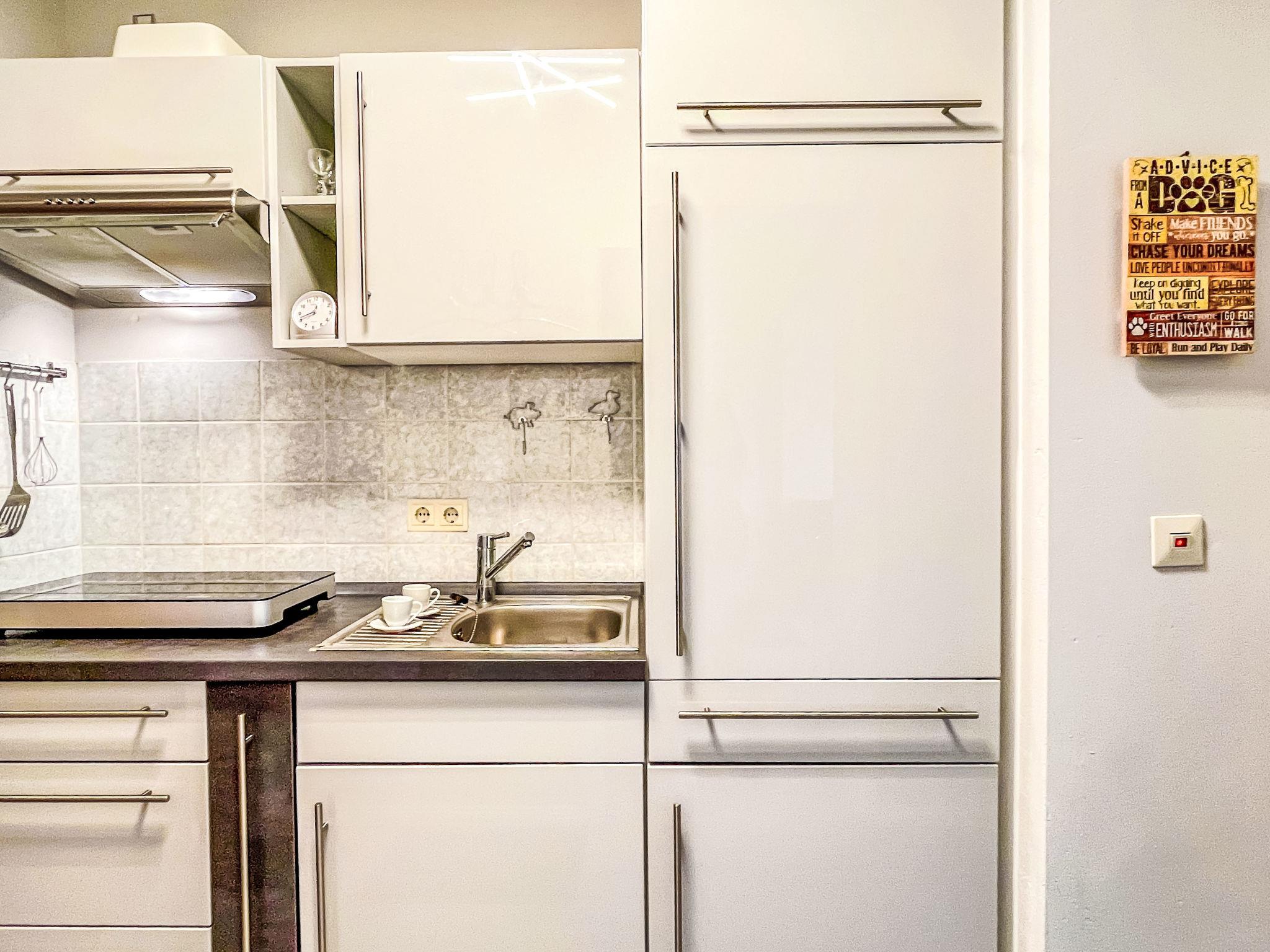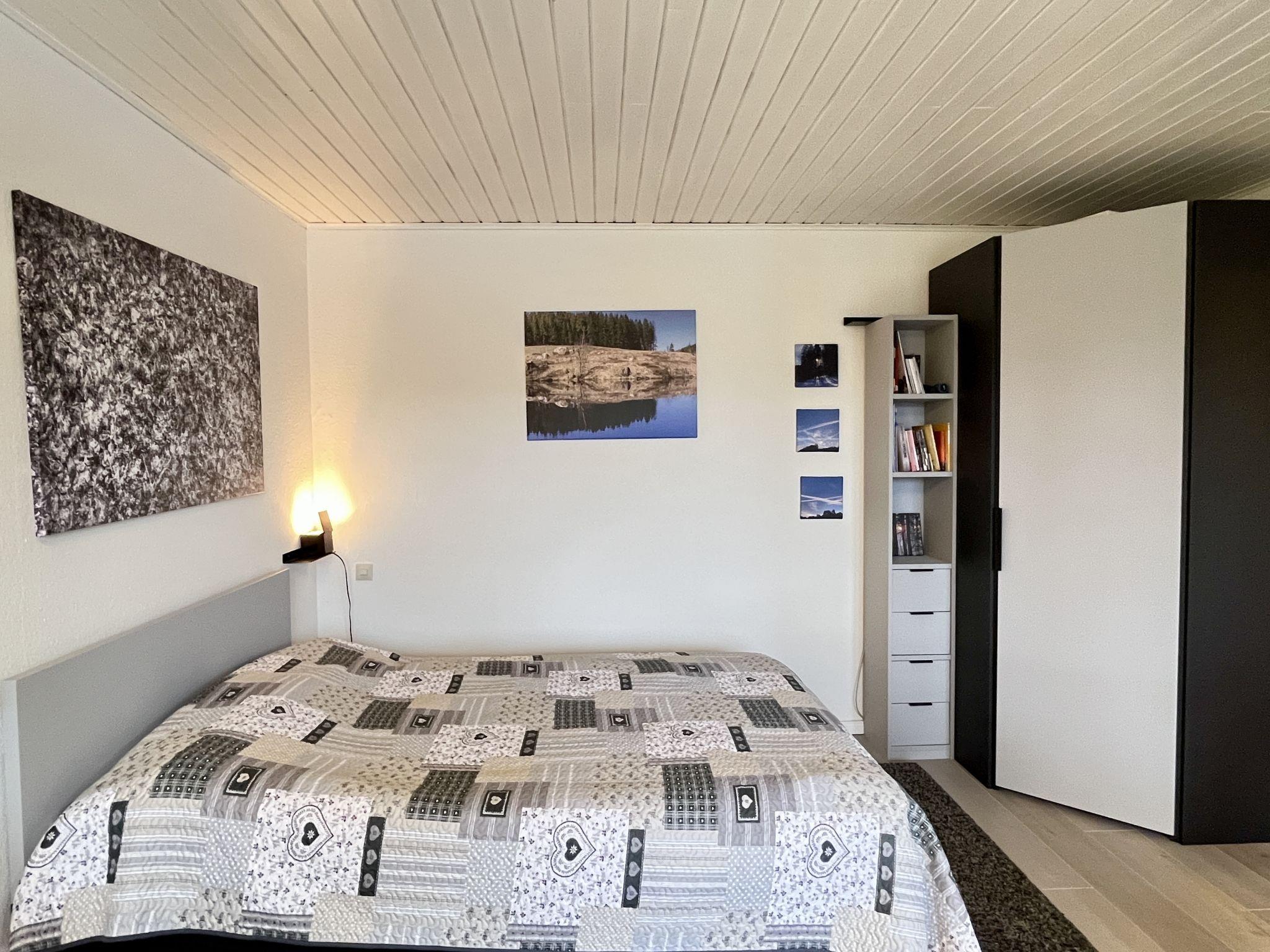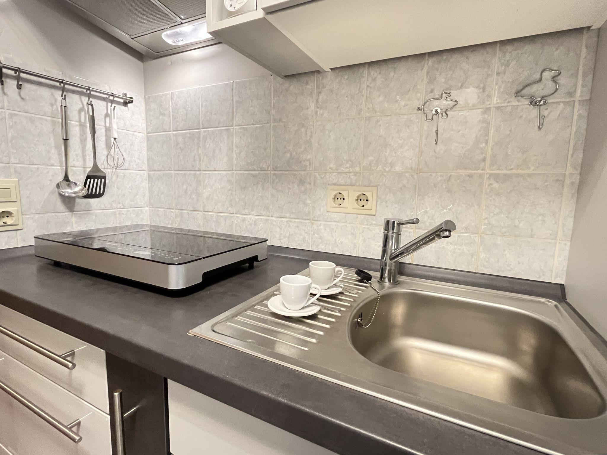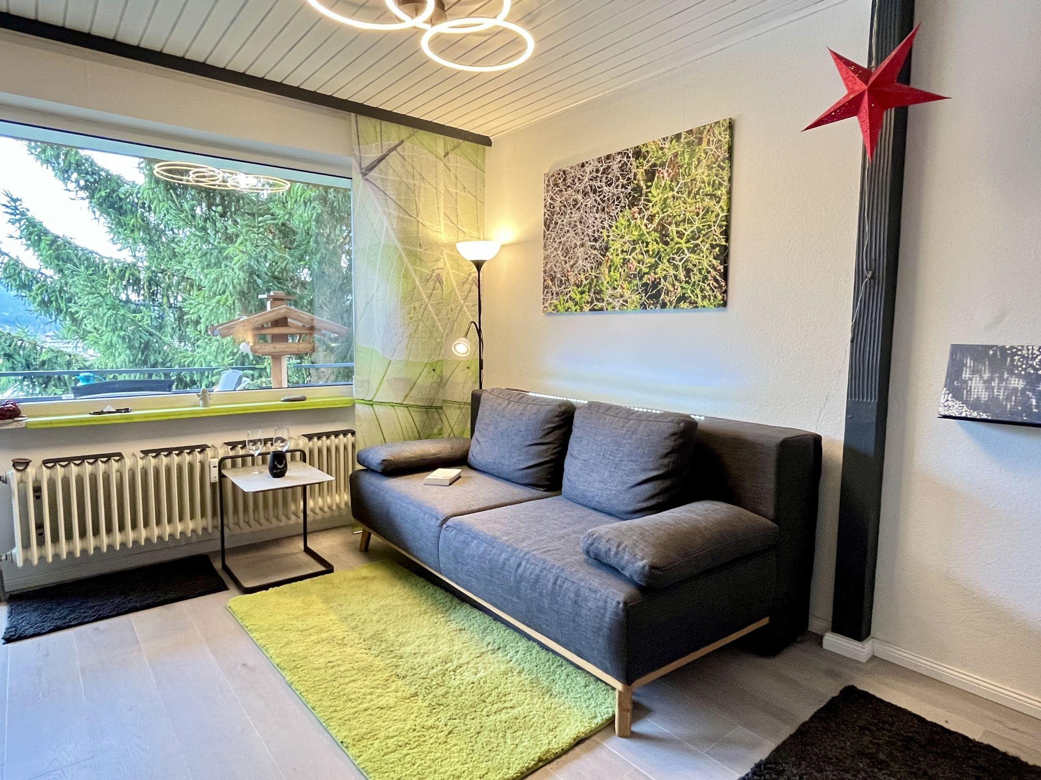 "Sonnige Aussichten", 1-room apartment 35 m2 on 2nd floor. Bright, beautiful and modern furnishings: large living/sleeping room with 1 sofabed (80 cm, length 200 cm), 1 french bed (1 x 140 cm, length 200 cm), dining table and satellite TV (flat screen). Exit to the balcony. Small kitchen in the entrance (mini-oven, 2 induction hot plates, toaster, kettle, grill, electric coffee machine). Shower/WC. Heating. Large balcony 12 m2. Balcony furniture, deck chairs (1). Beautiful view of the lake, the garden, the resort and the forest. Facilities: Internet (WiFi, free). Garage at the house. Please note: non-smokers only. Maximum 2 pets/ dogs allowed. Smoke alarm, fire extinguisher. Two dog baskets and two bowls are available. The coffee machine is a capsule coffee machine.