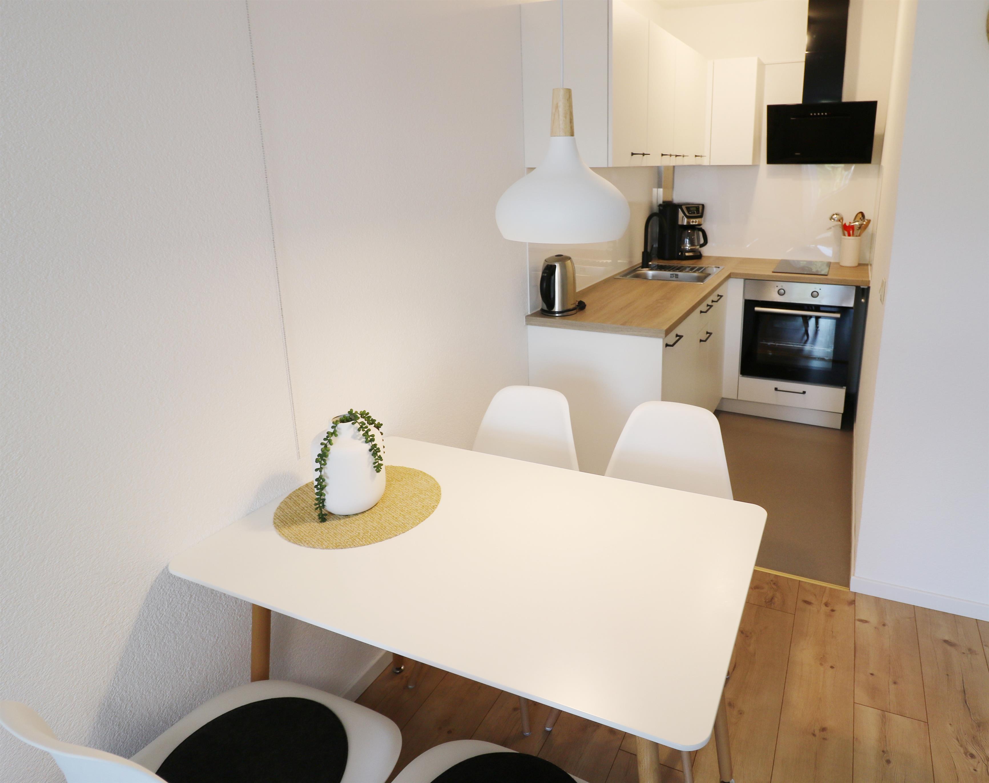 - eine vollausgestattete Küche mit Kühlschrank inkl. Gefrierfach, Herd mit 2 Kochfeldern, Backofen, Wasserkocher, Toaster, Senseo Pad Kaffeemaschine und Küchengrundausstattung